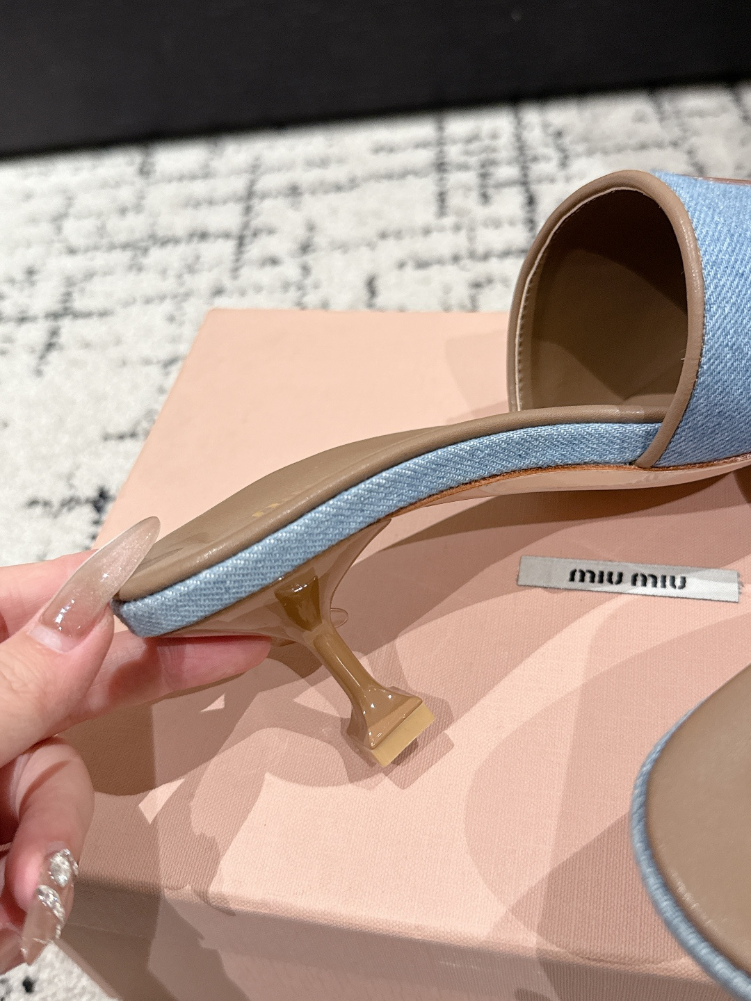 Miu Miu 25ss summer flat denim lambskin slippers. Handcrafted with cloud-shaped heel. Upper: denim/lambskin, lining: lambskin, sole: Italian leather. Sizes 35-40.