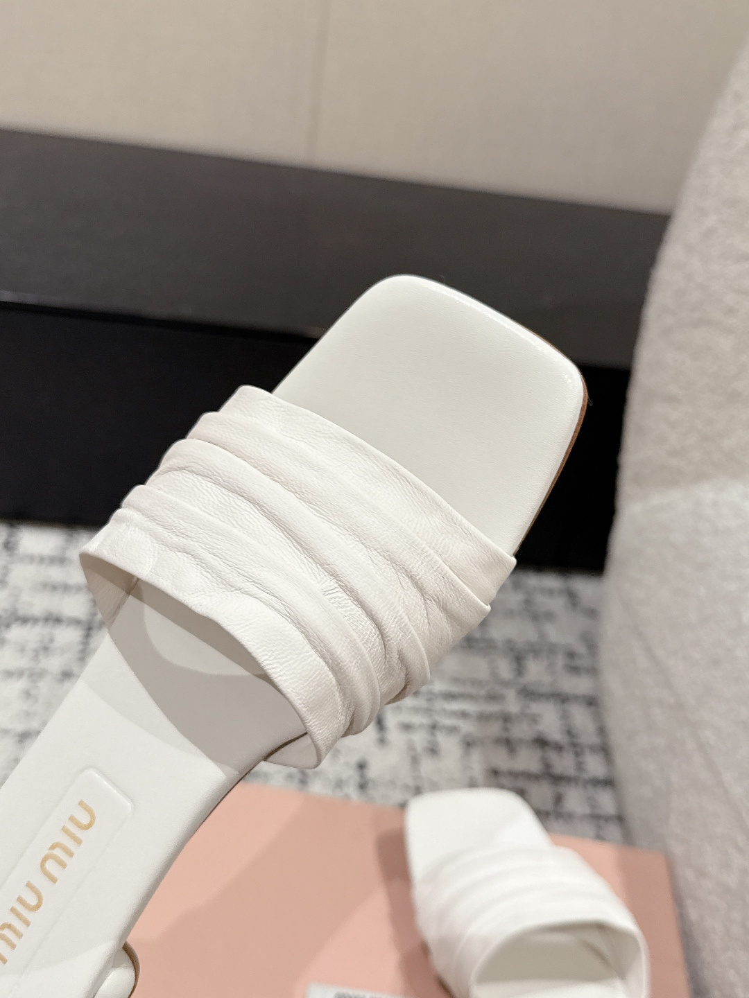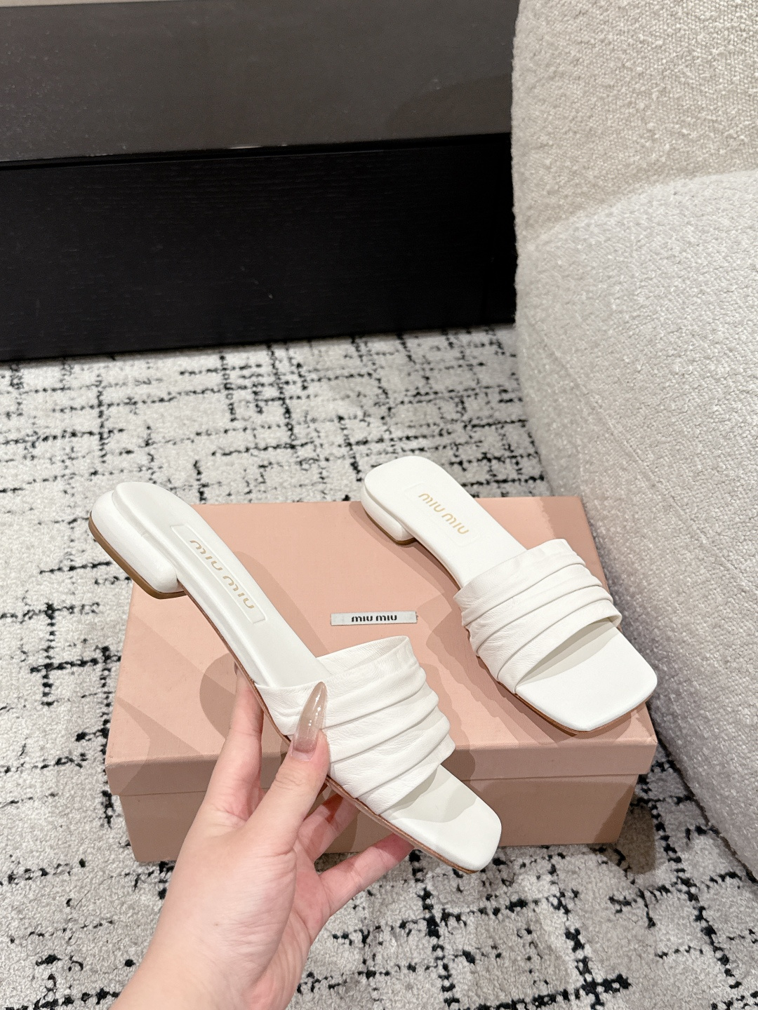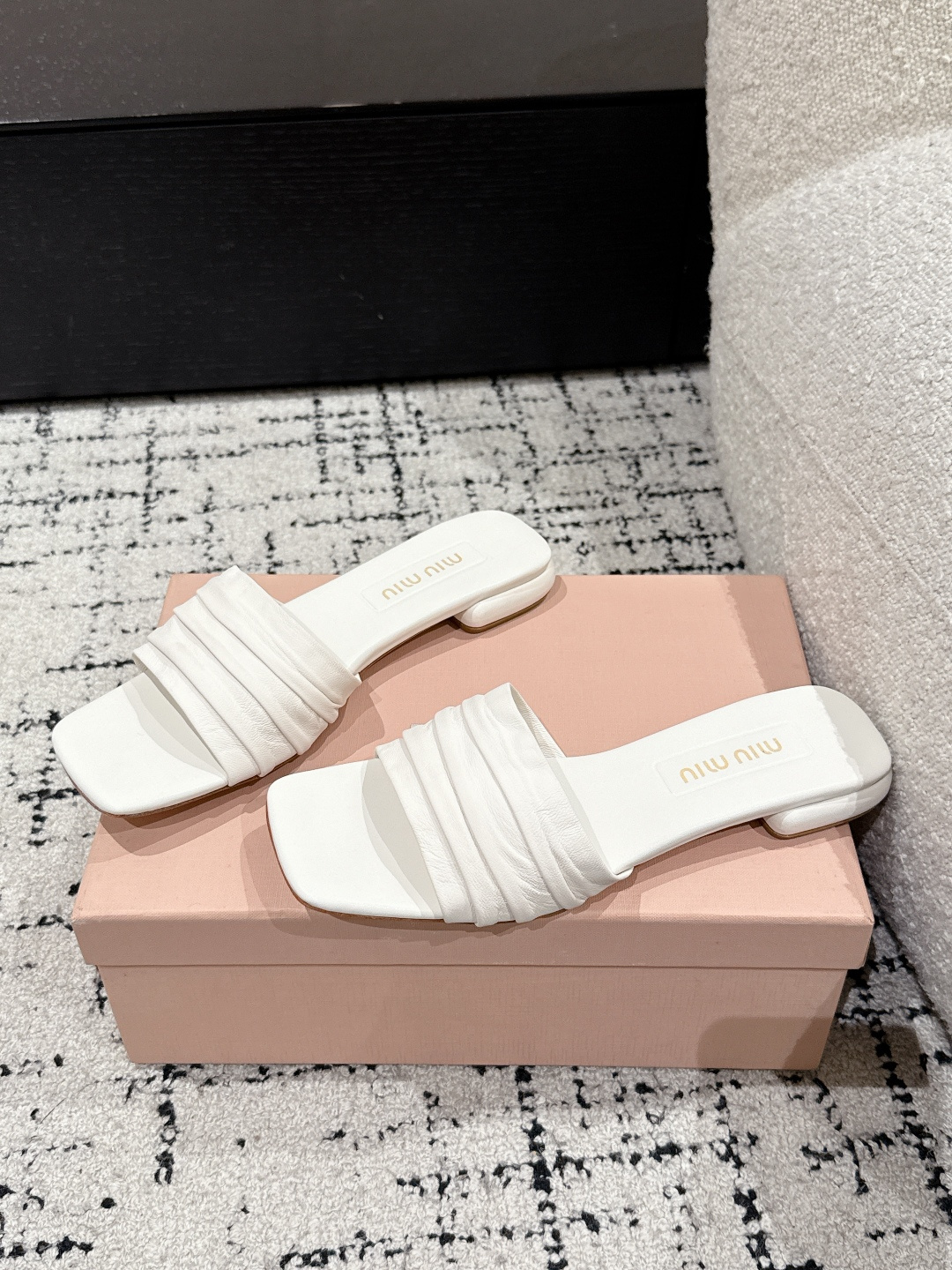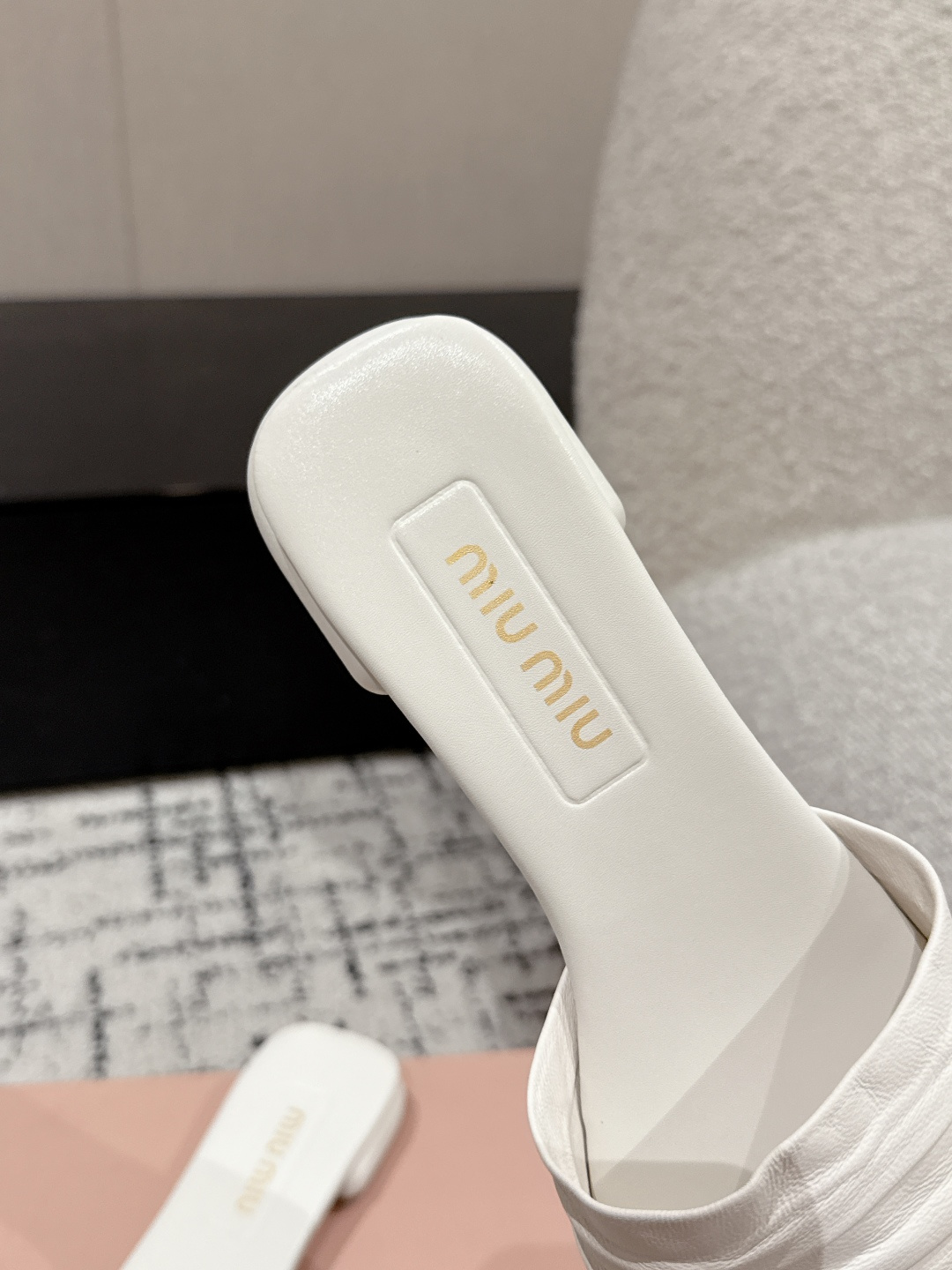 Miu Miu 25ss summer flat denim leather slippers. Handmade with cloud heel design. Upper: denim/lamb leather, lining: lamb leather, sole: Italian handcrafted leather. Sizes 35-40.