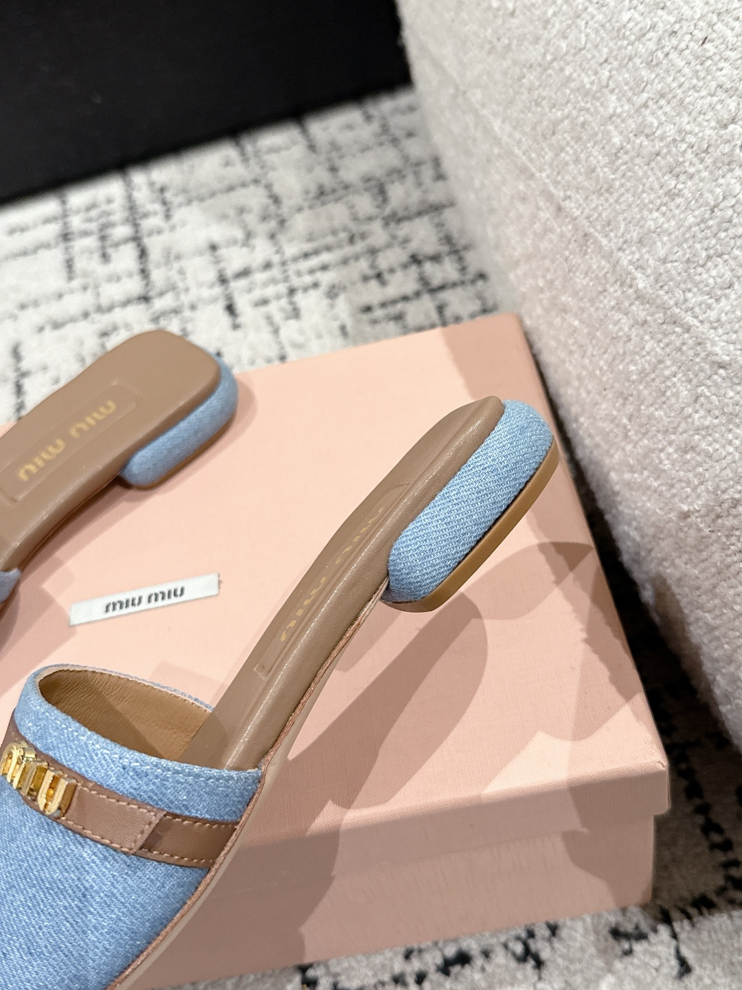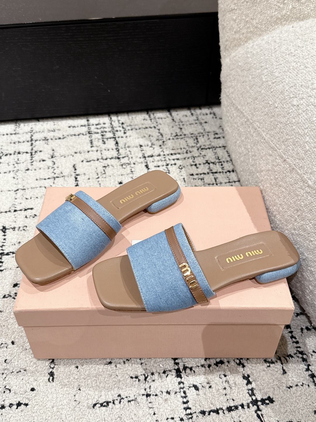 Miu Miu 25ss summer flat denim leather slippers. Handmade with cloud heel design. Upper: denim/leather, lining: leather, sole: Italian handcrafted leather. Sizes 35-40.