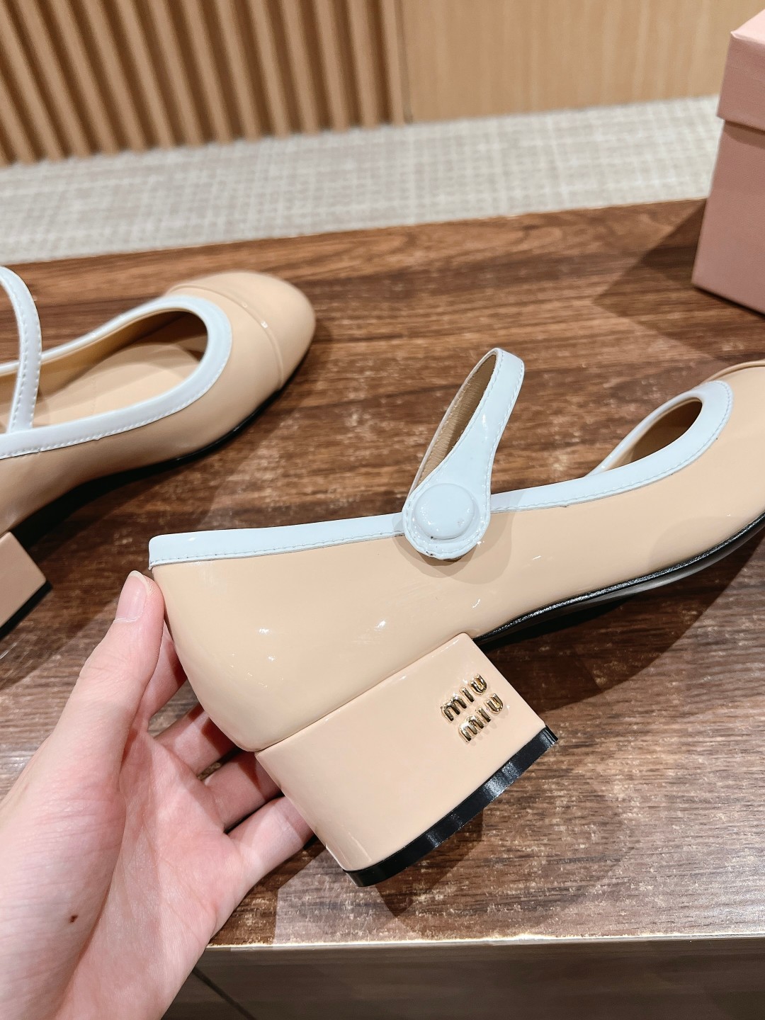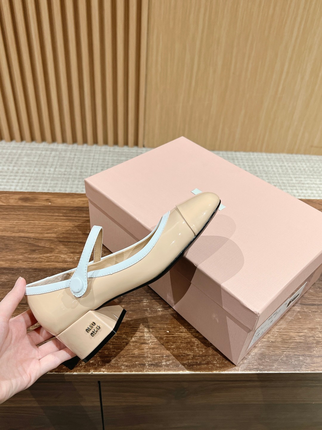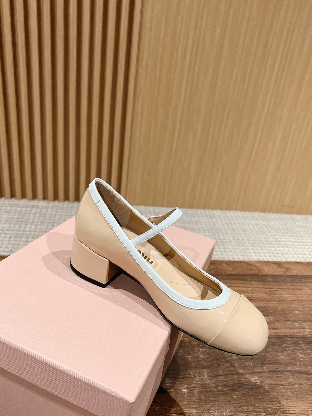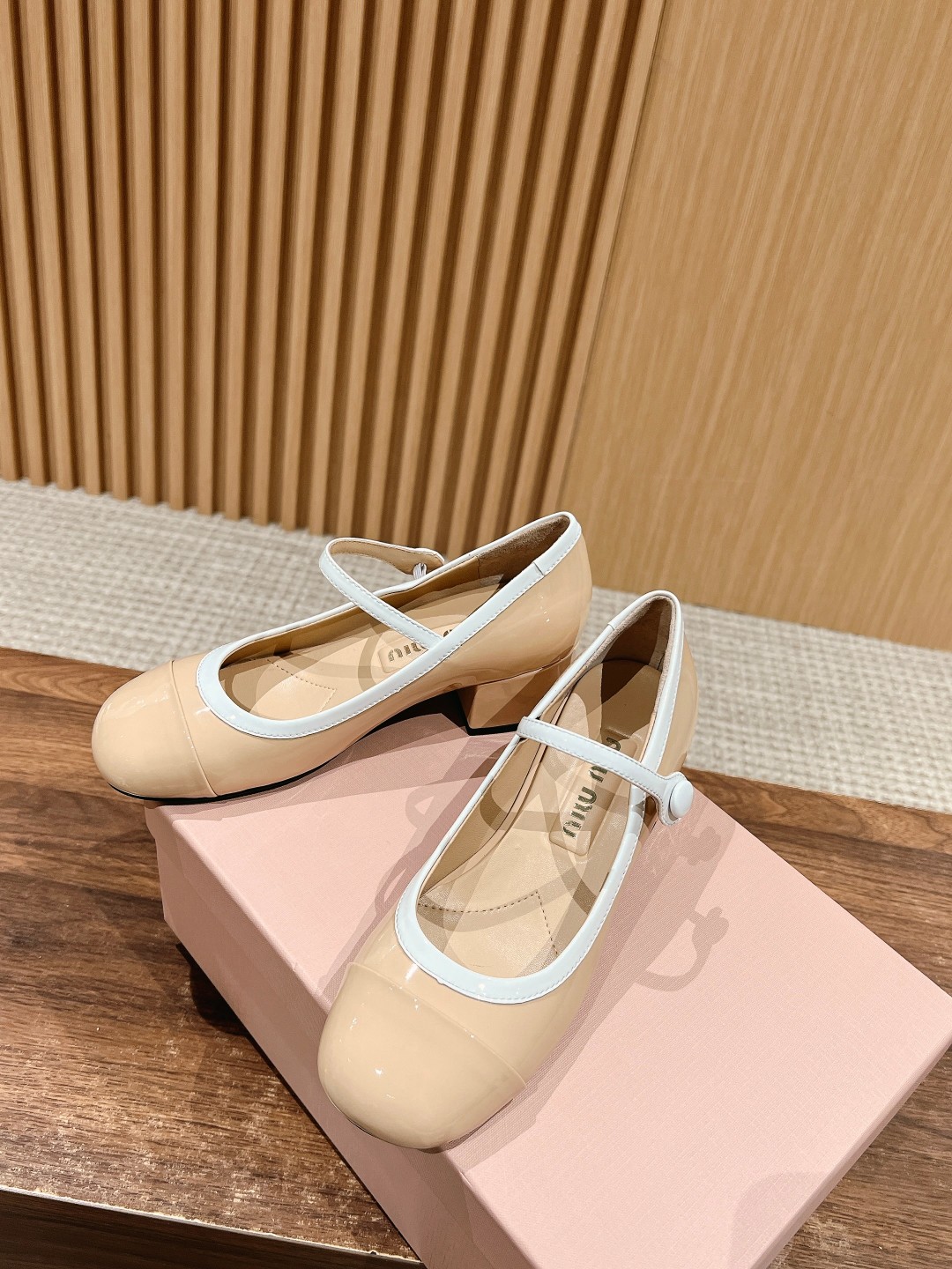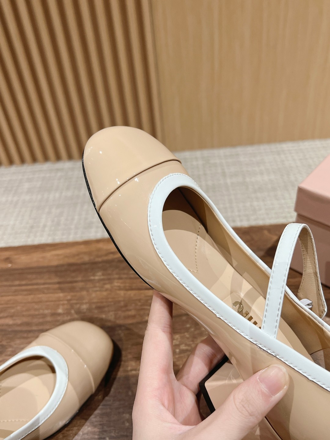 MiuMiu 2025 early spring new color-block Mary Jane shoes. Versatile, comfortable heel height. Specific cow patent leather, lambskin lining, leather sole. Sizes 35-40.