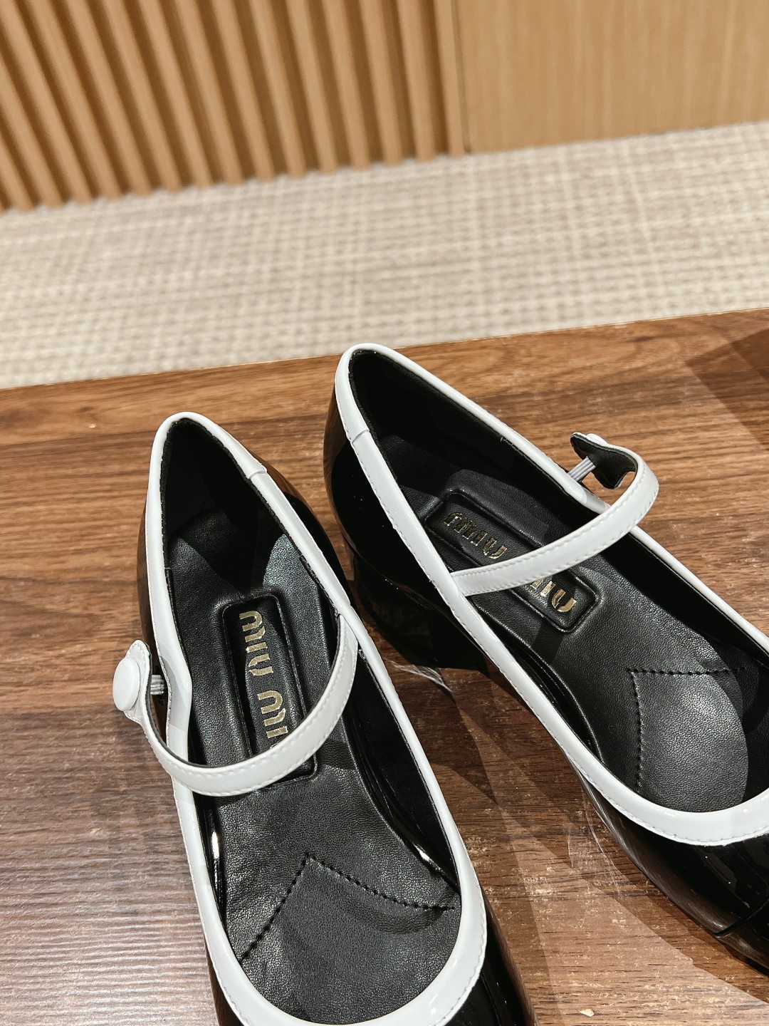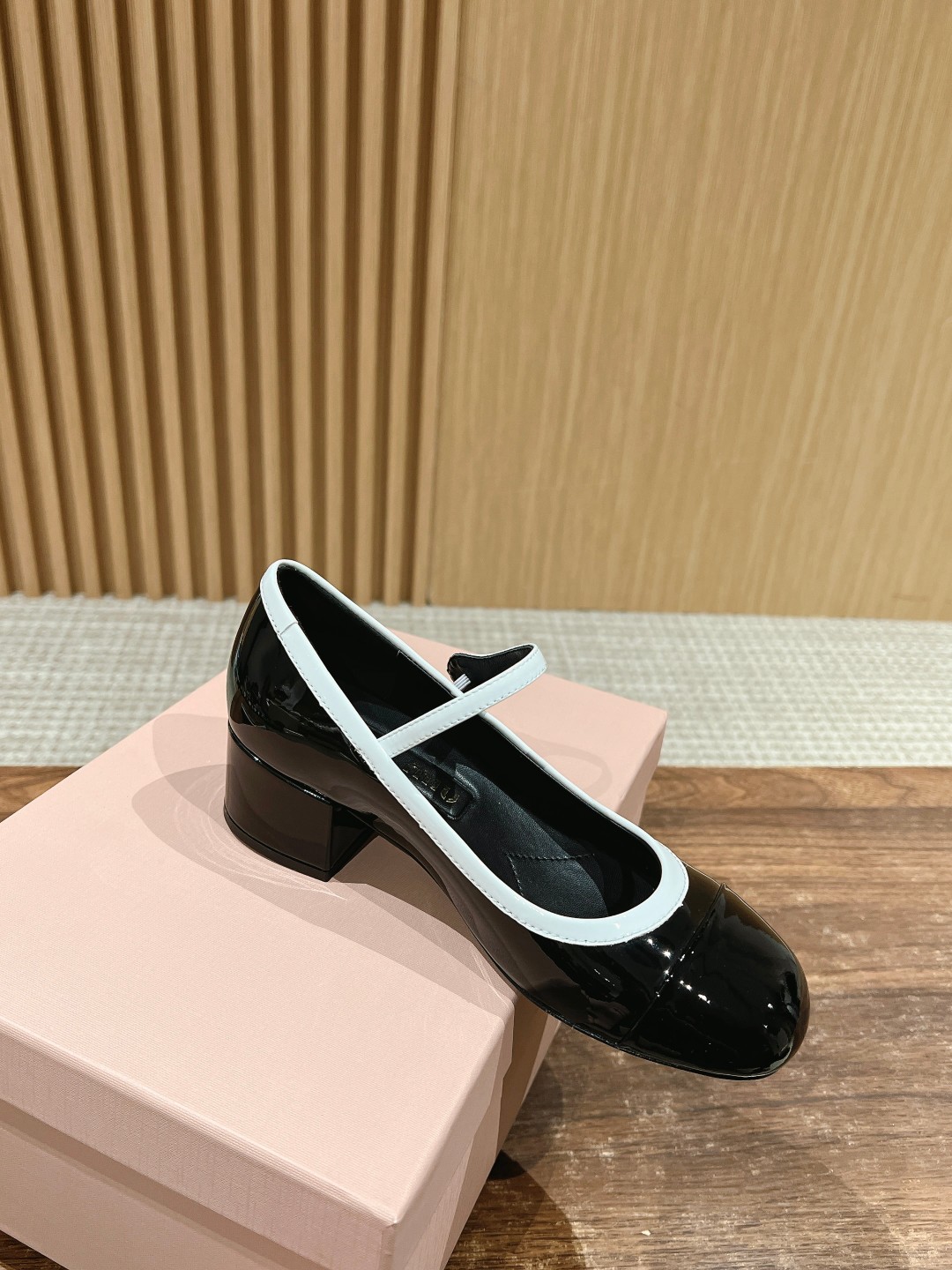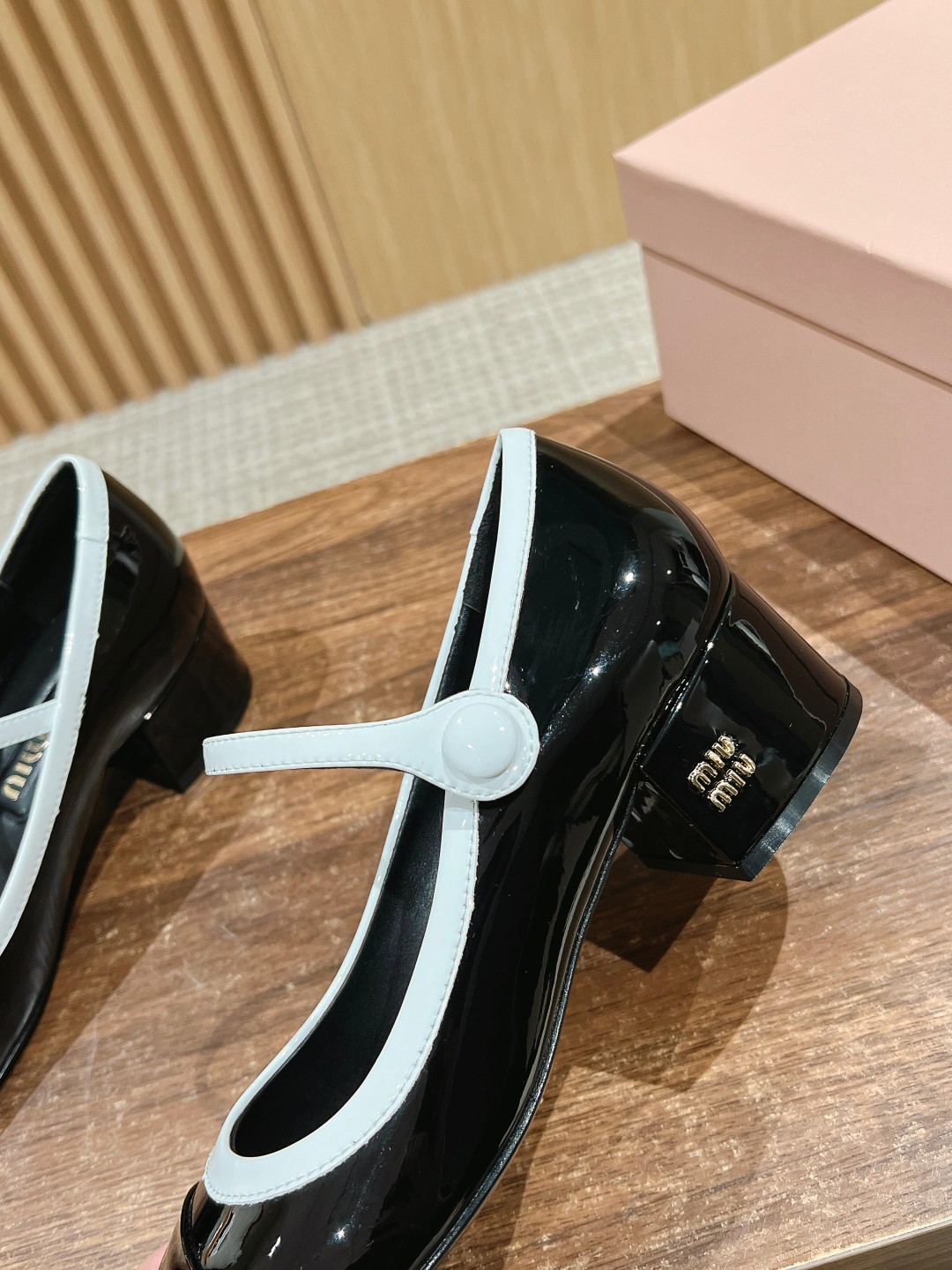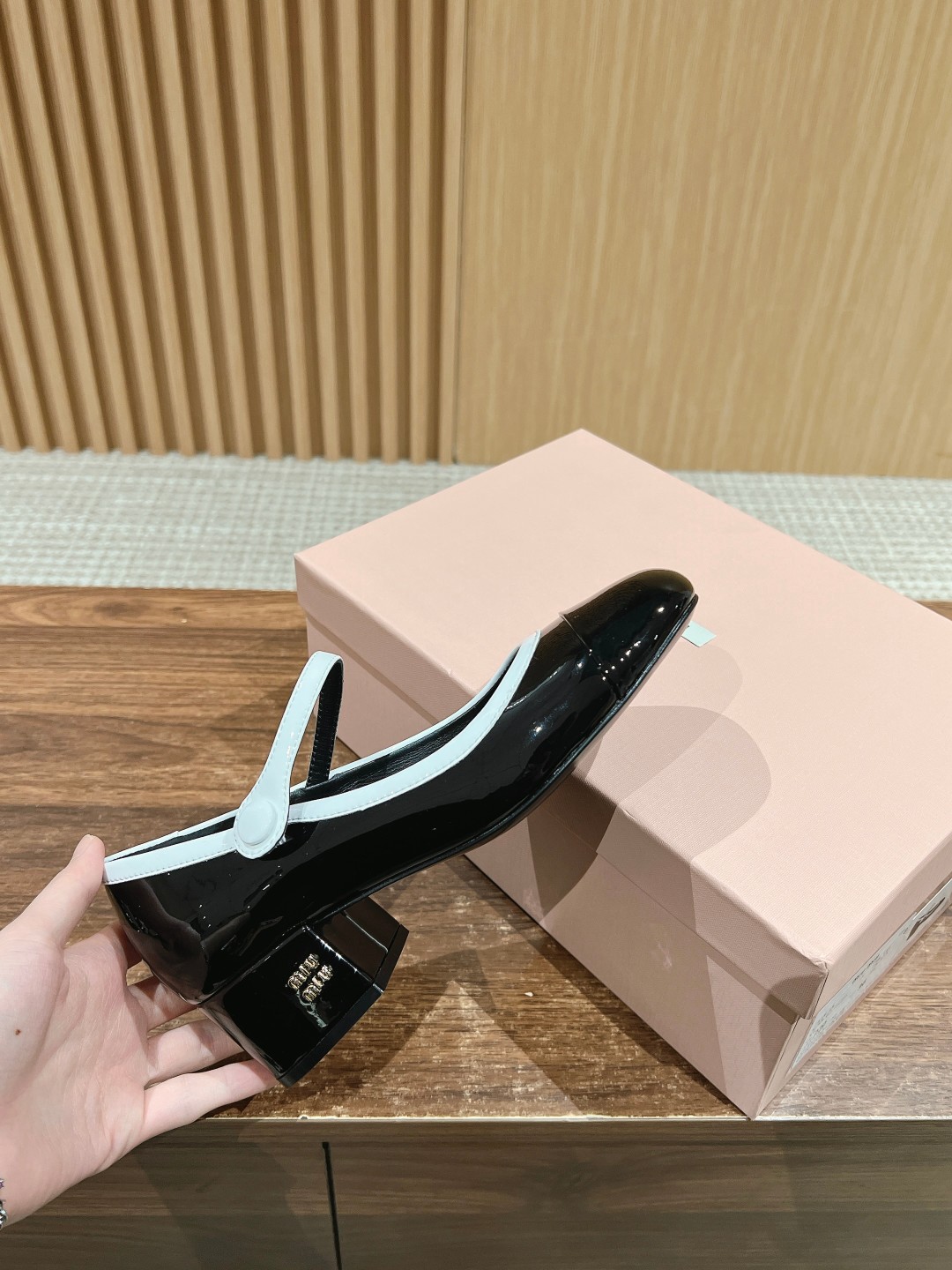 MiuMiu 2025 early spring new two-tone Mary Jane shoes. Very versatile and comfortable heel height. Made with specific cow patent leather, lambskin lining, and genuine leather sole. Sizes 35-40.