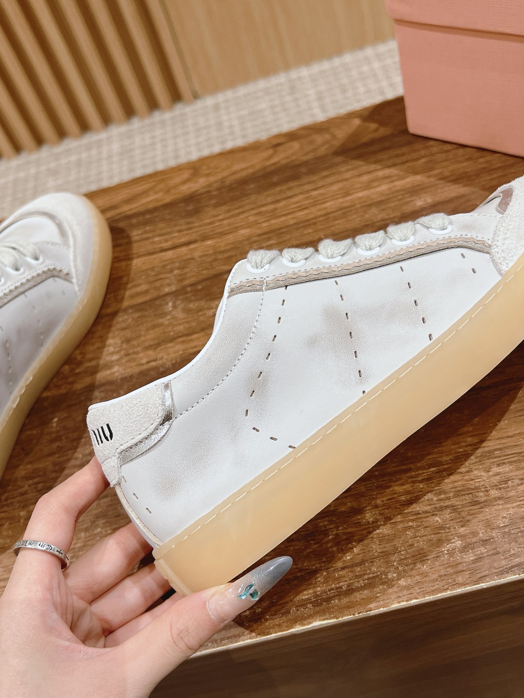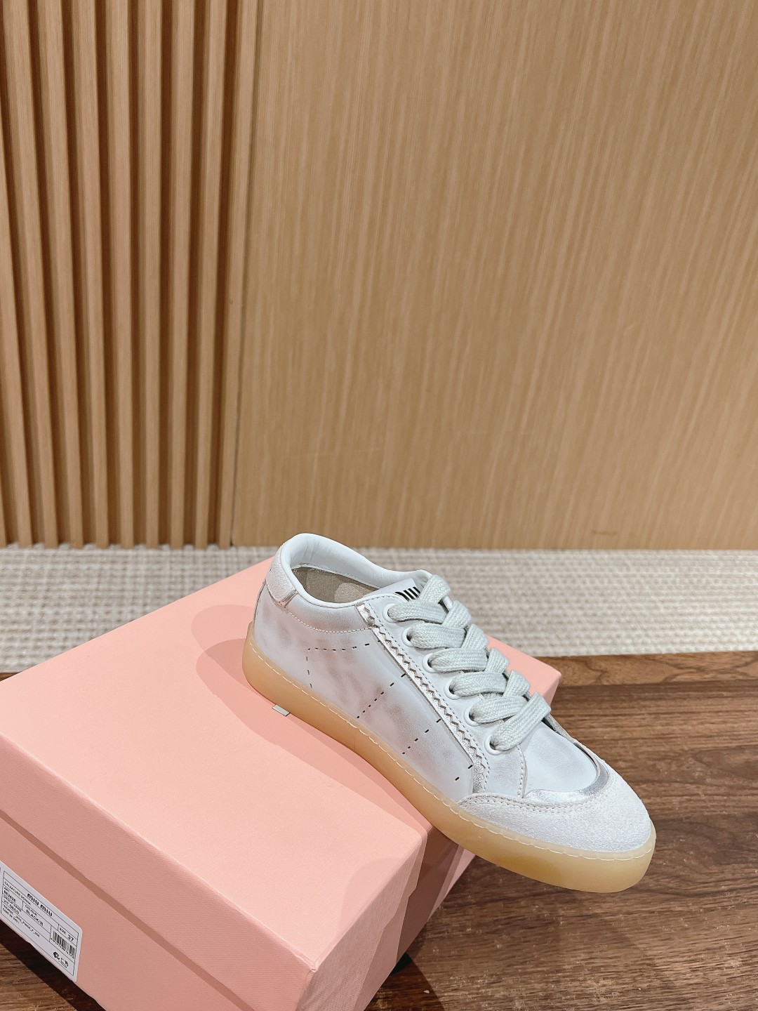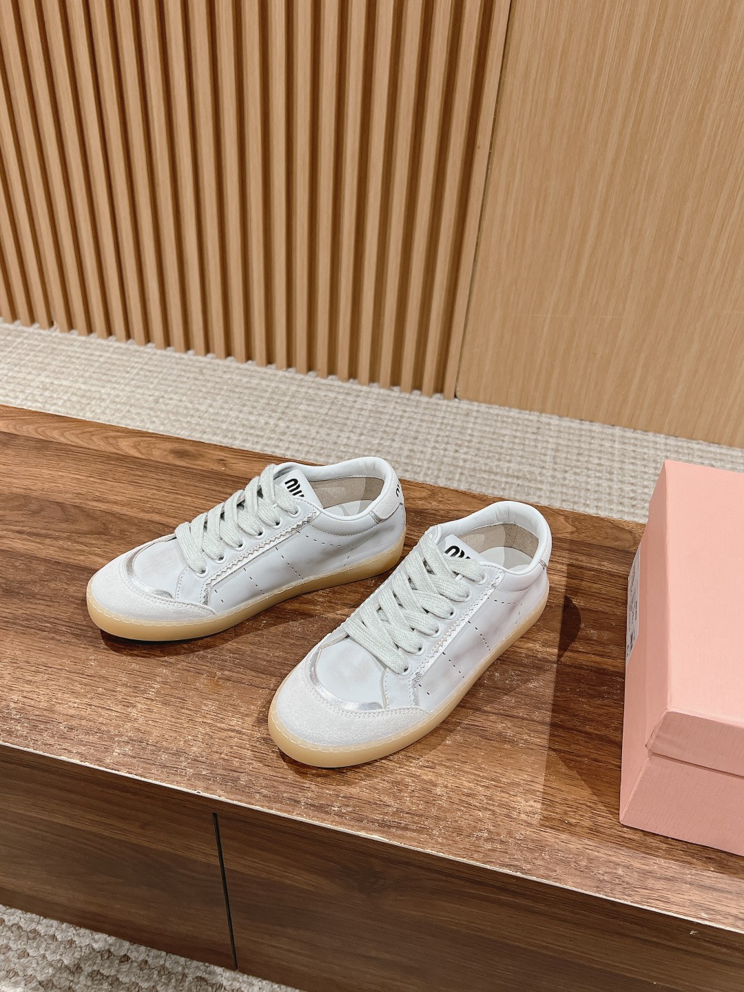 MiuMiu new vintage-style sneakers, aged design, simple and elegant. Comfortable, versatile. Top grain leather, silk lining. Sizes 35-40.