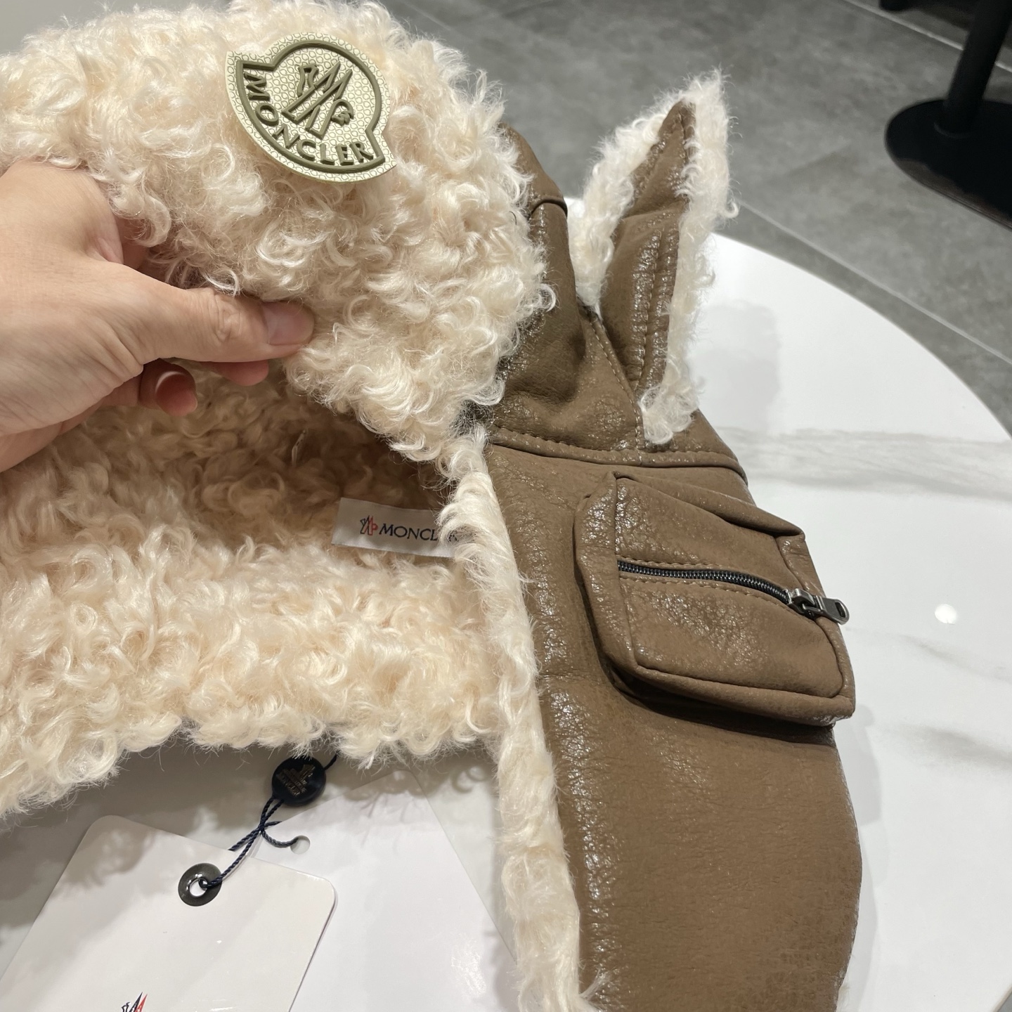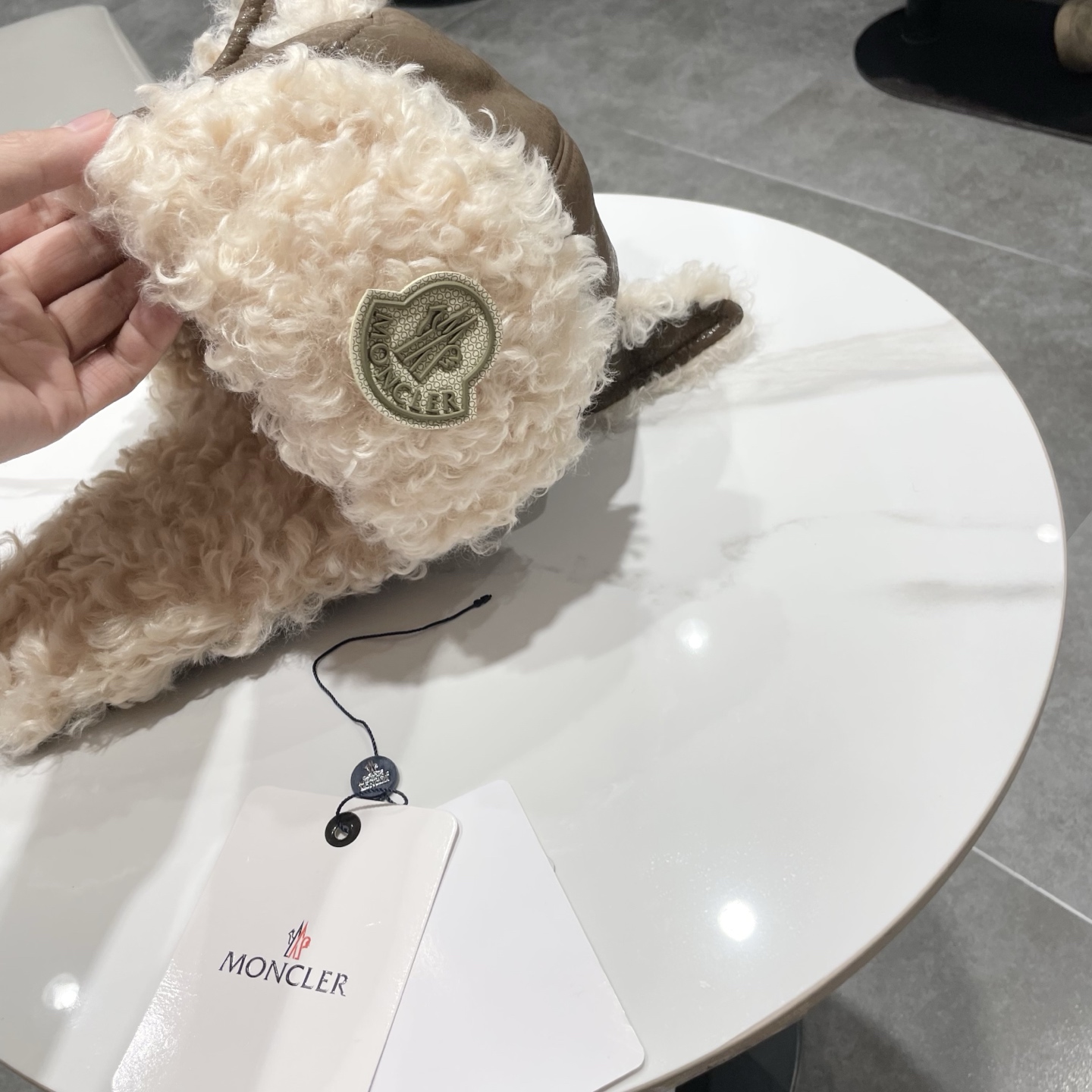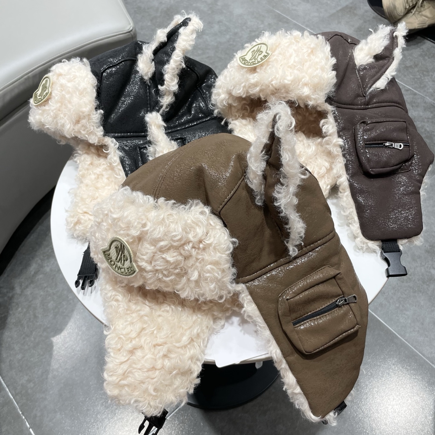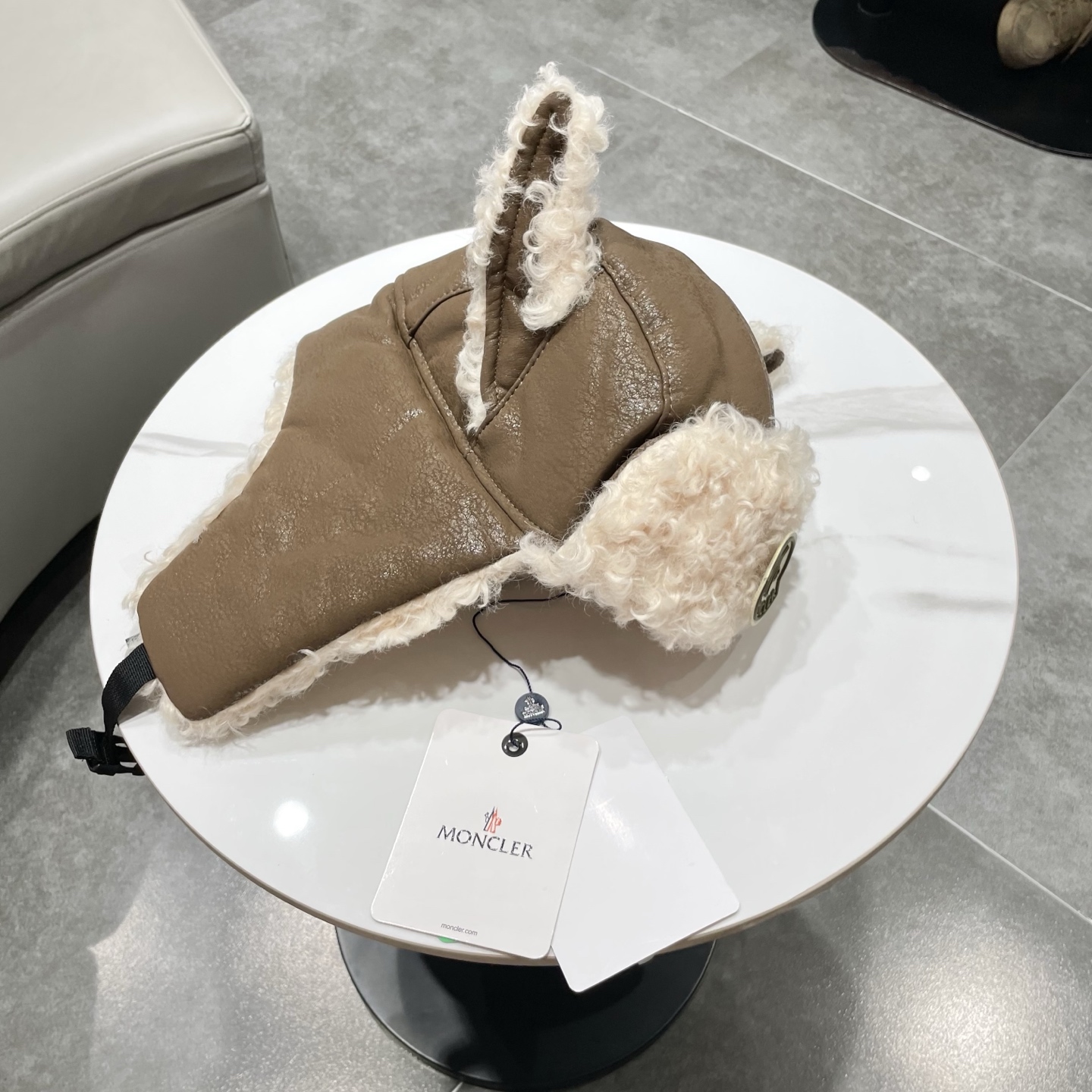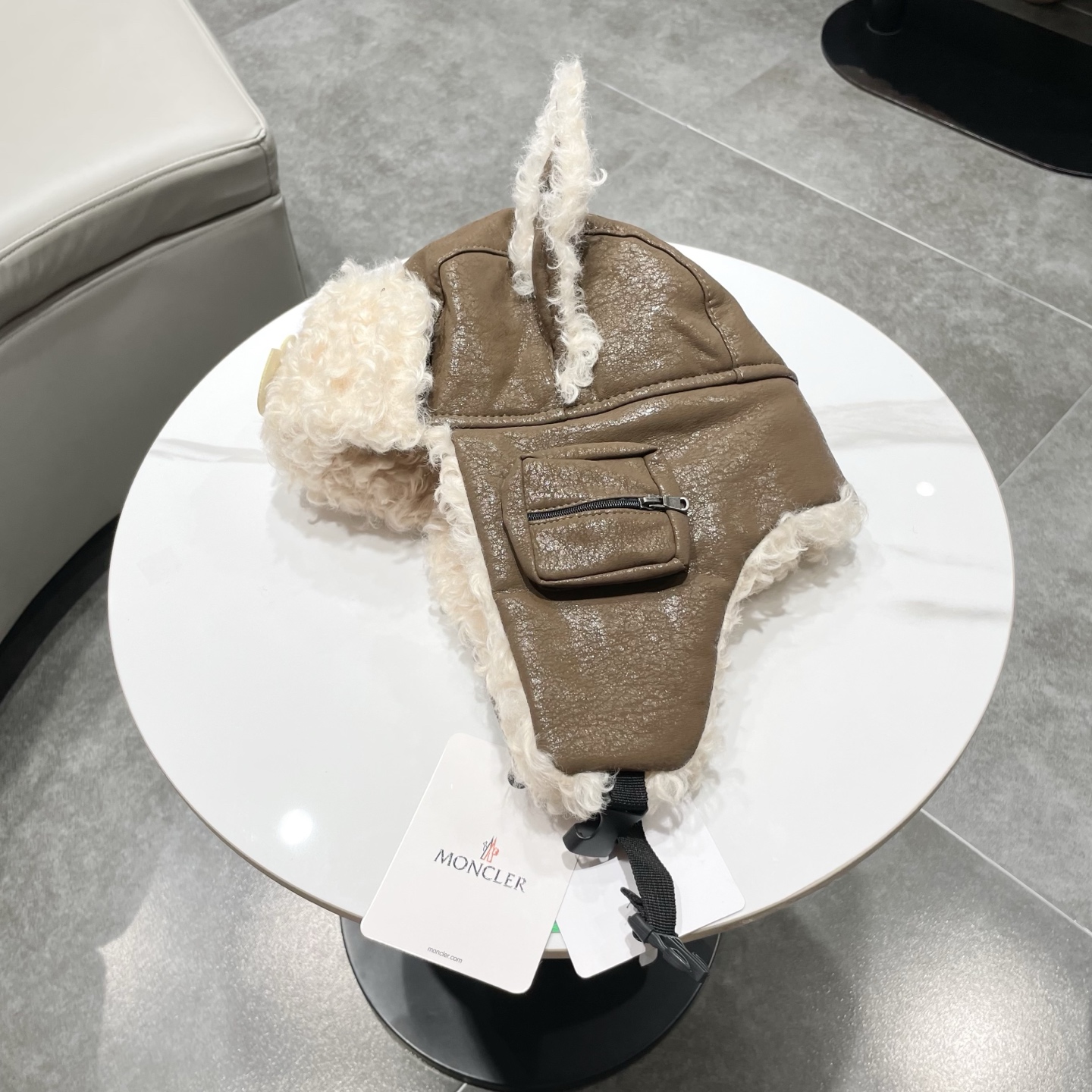 Moncler Winter Hat with Fur and Leather Ear Flaps for Warmth.