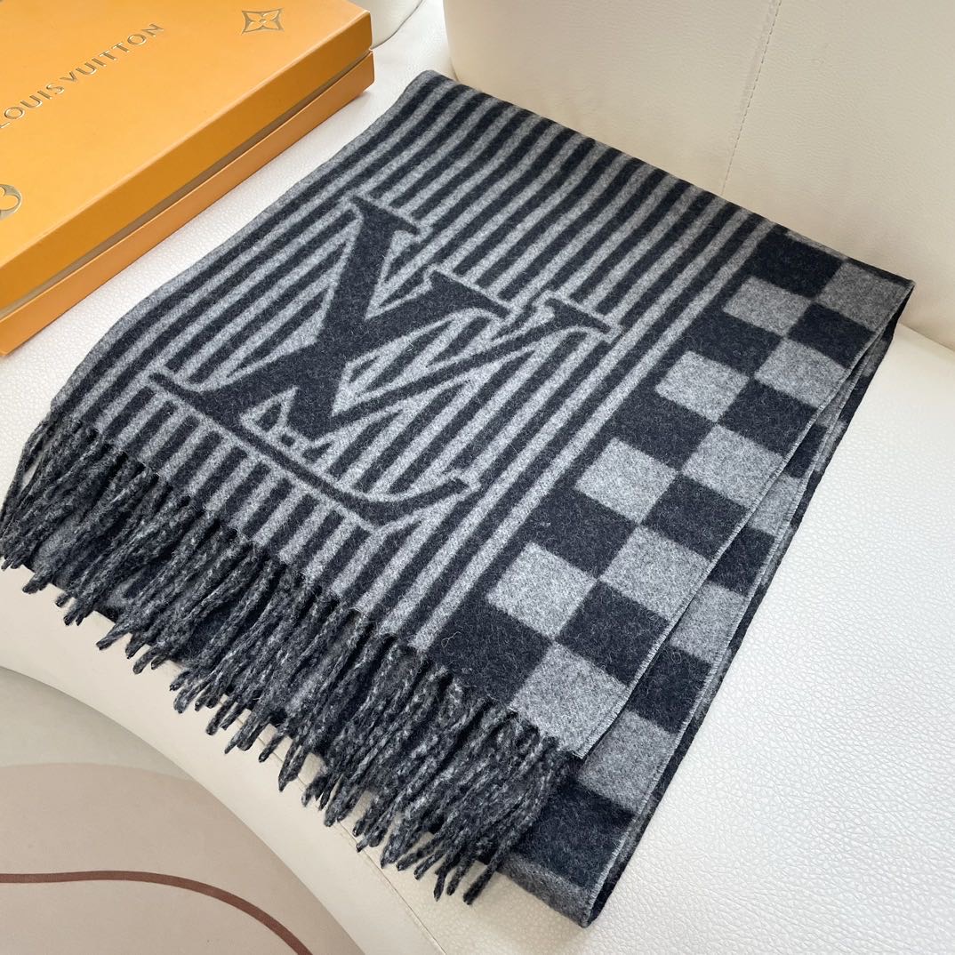 New LV scarf design by Virgil Abloh and Nigo. Full Monogram pattern with decorative stitching. Made from 100% cashmere, ideal for winter. Size: 40*205cm.