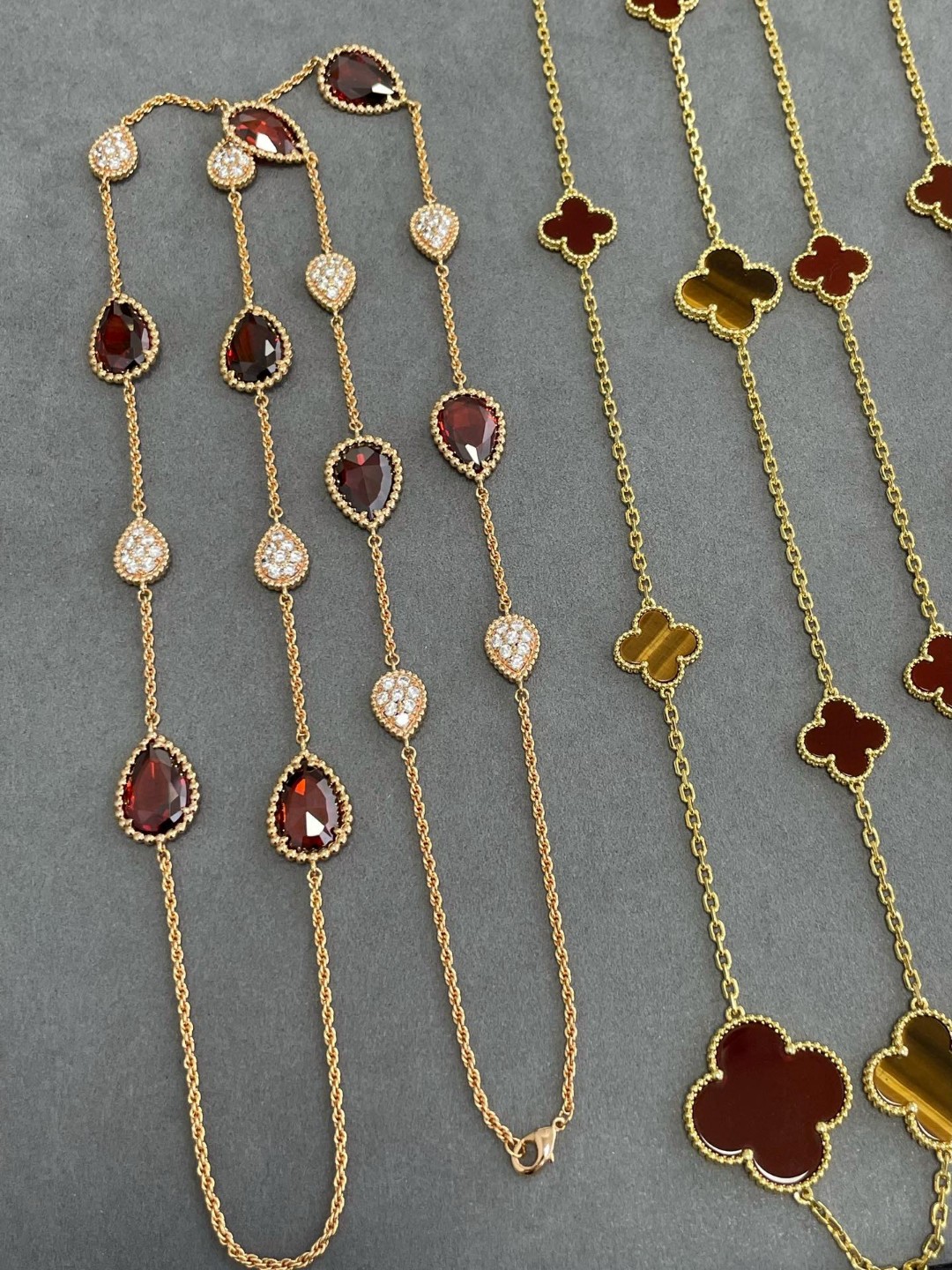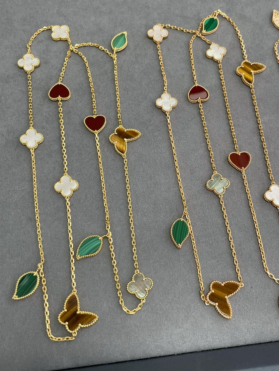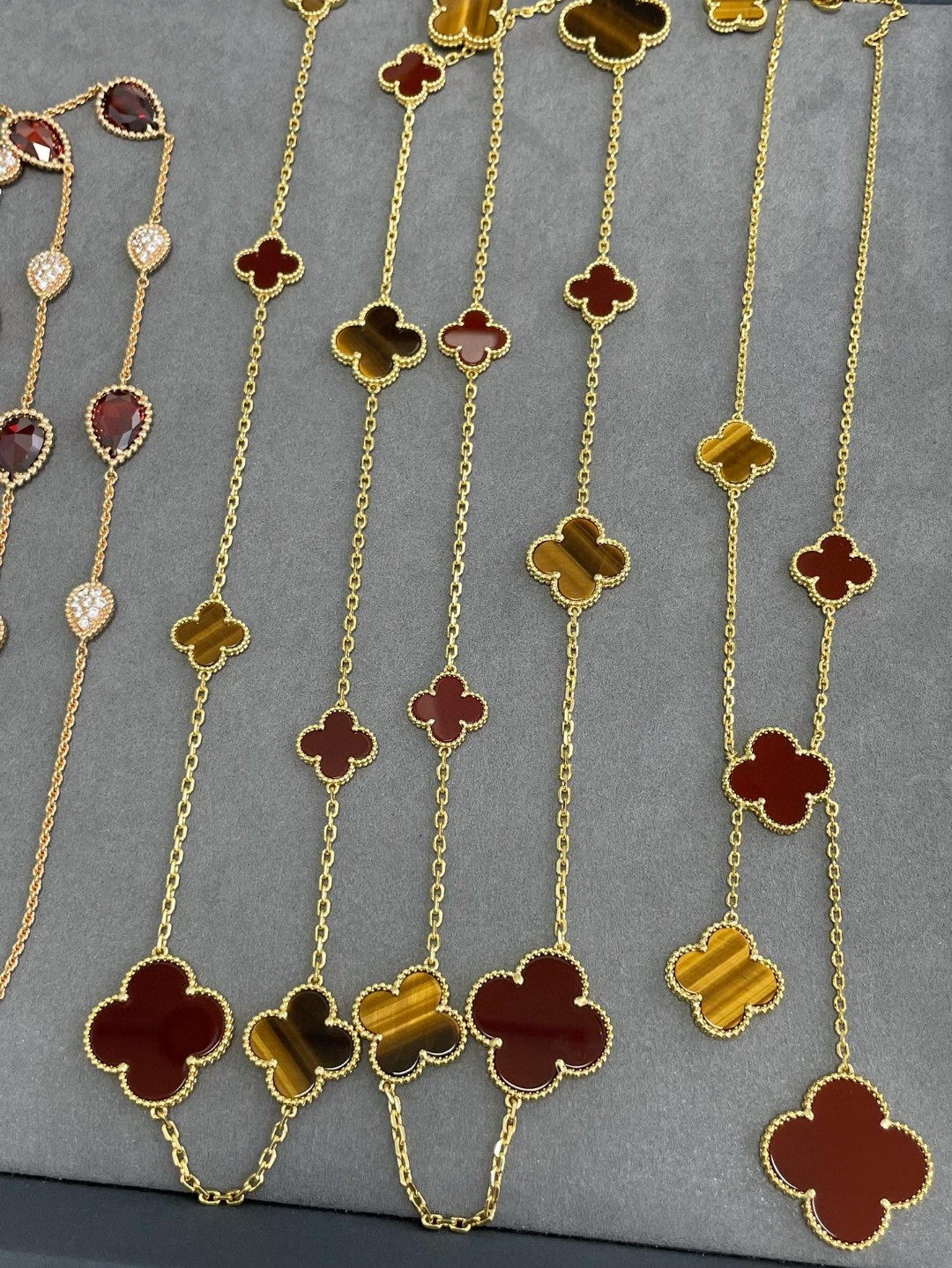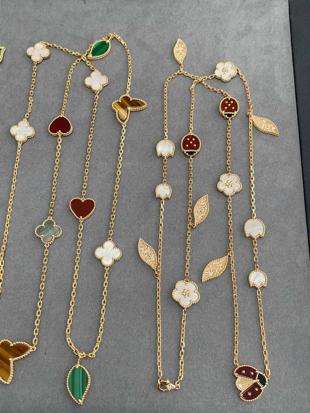 Buccellati Opera series mother-of-pearl bracelet with clover and shell necklace, featuring Rigato engraving and diamond inlay, exuding Italian elegance and artistry.