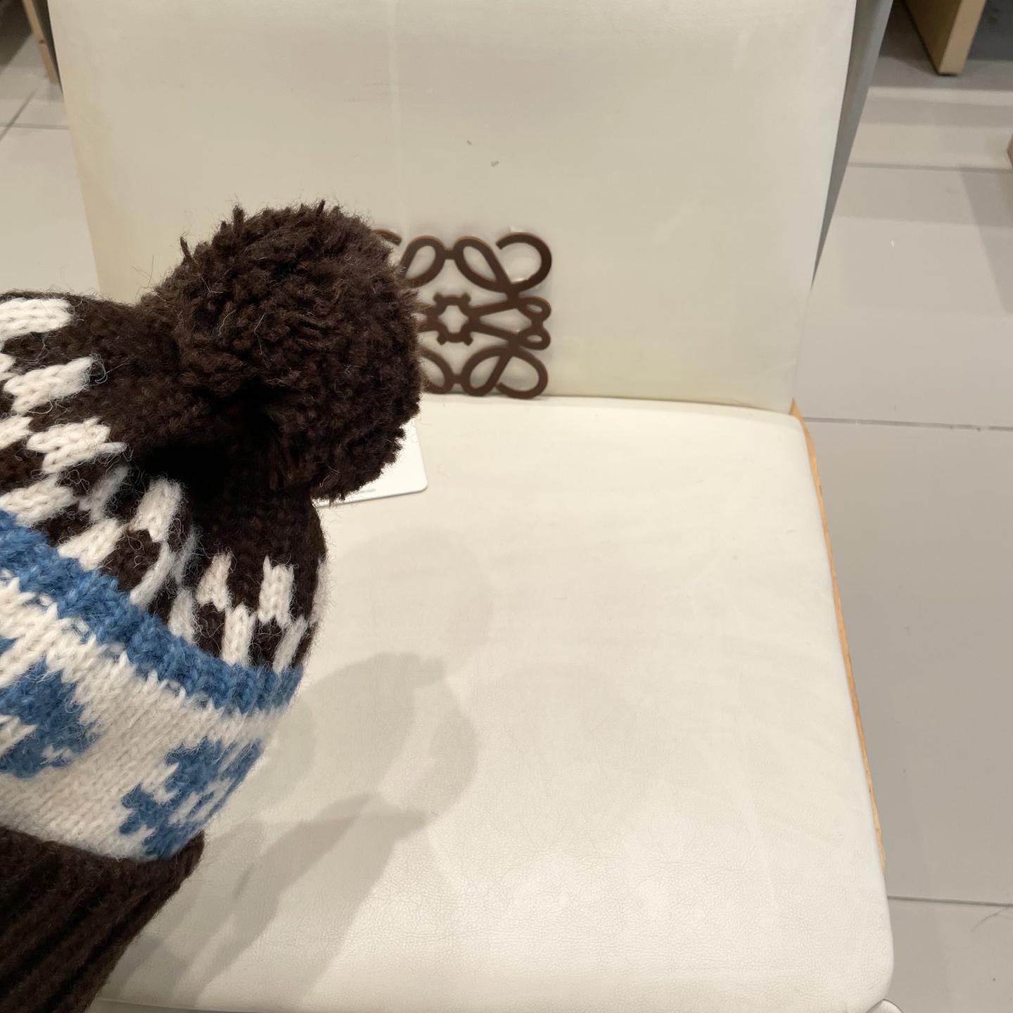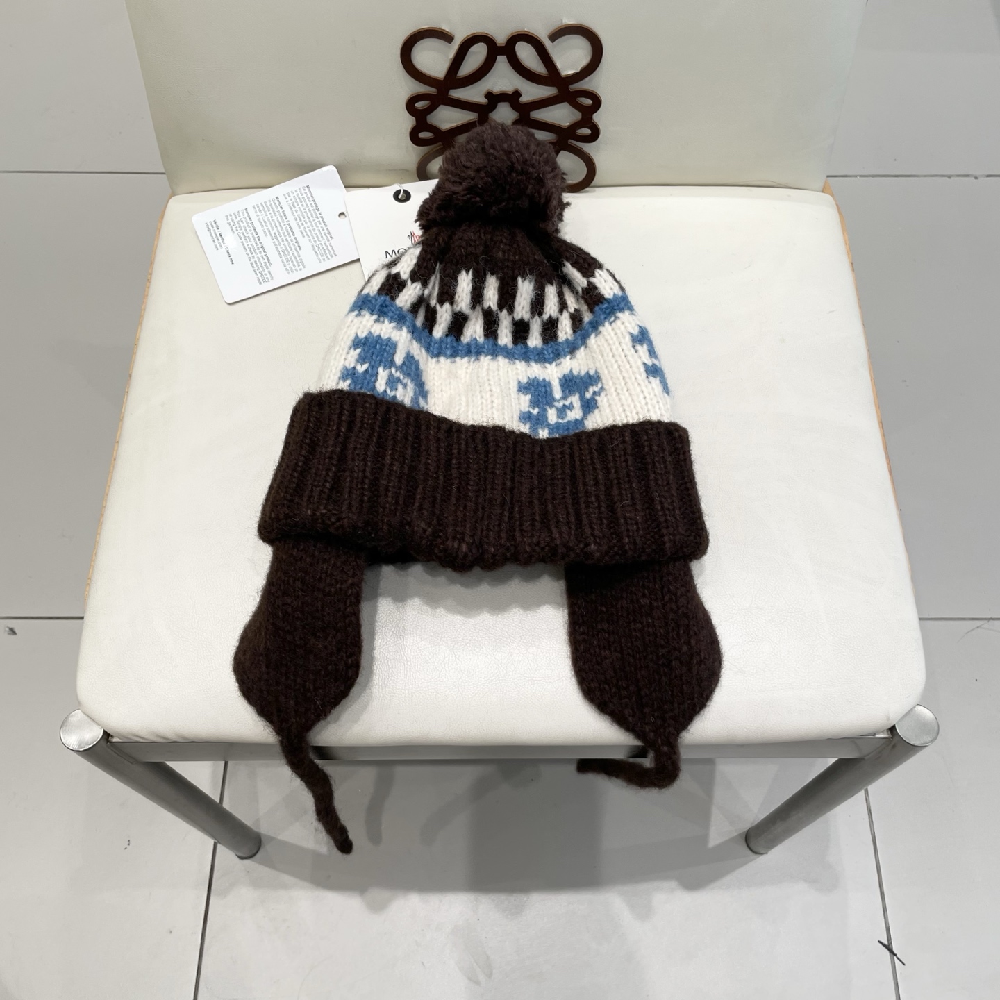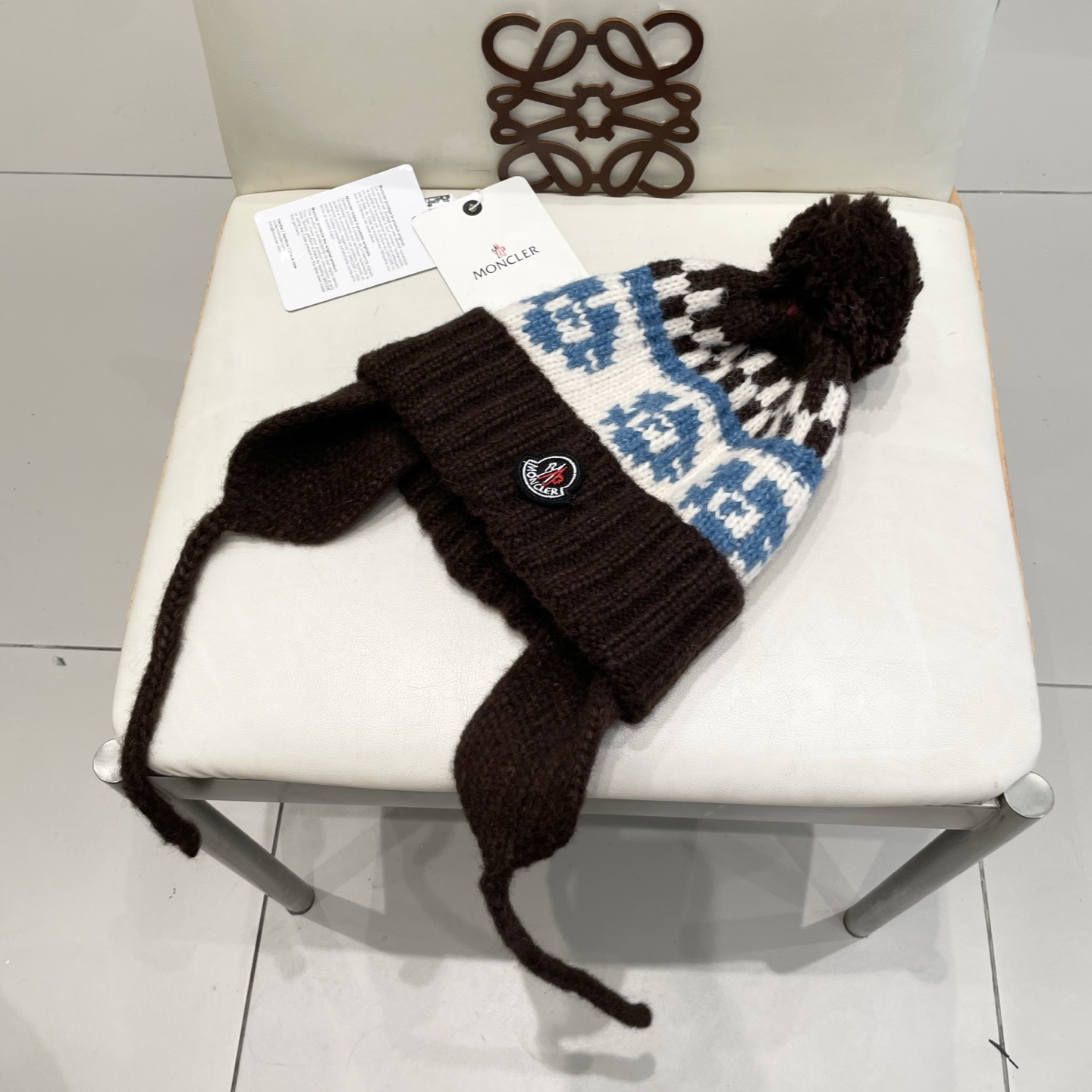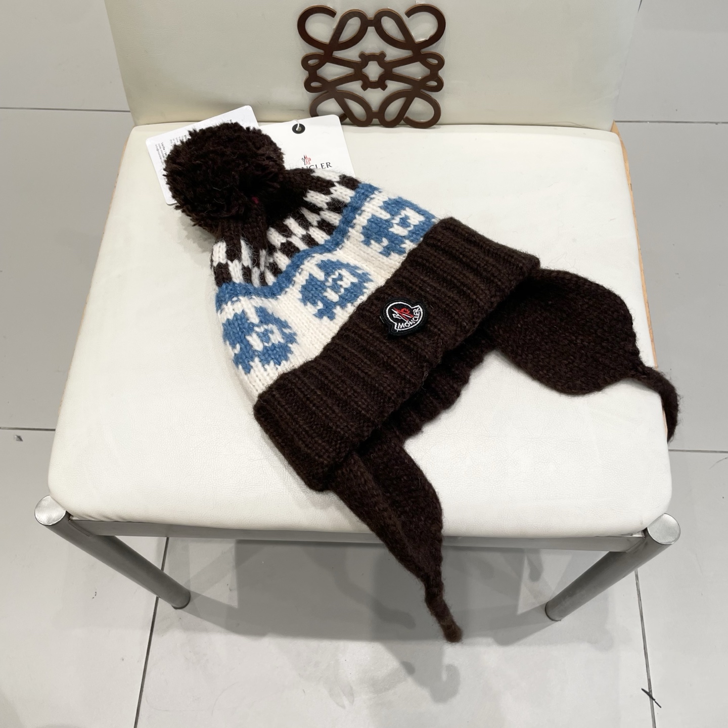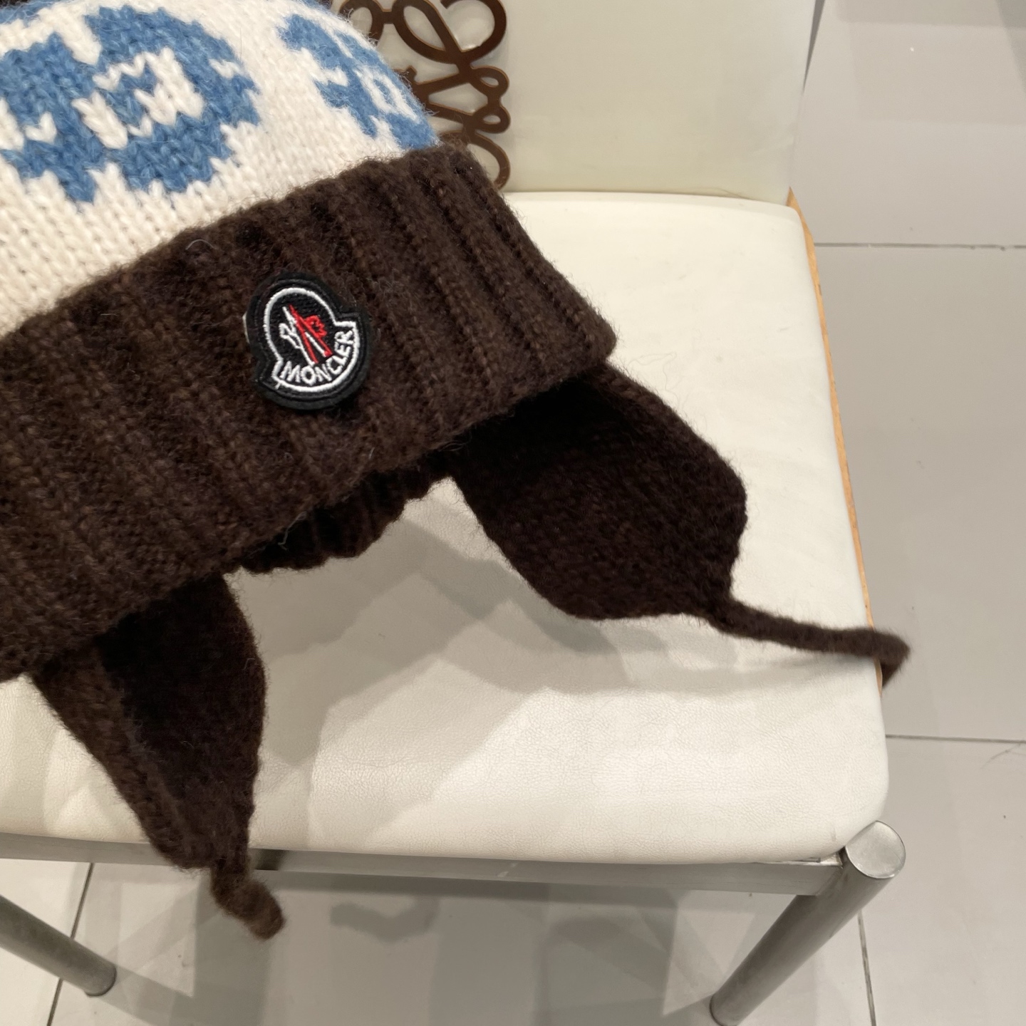 Original Moncler Nordic-style knitted hat with ear protection and pom-poms.