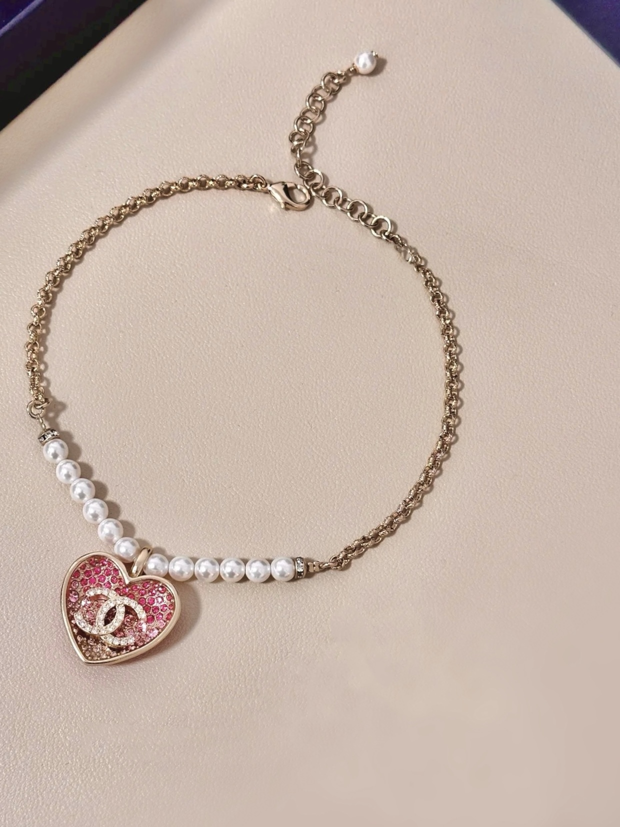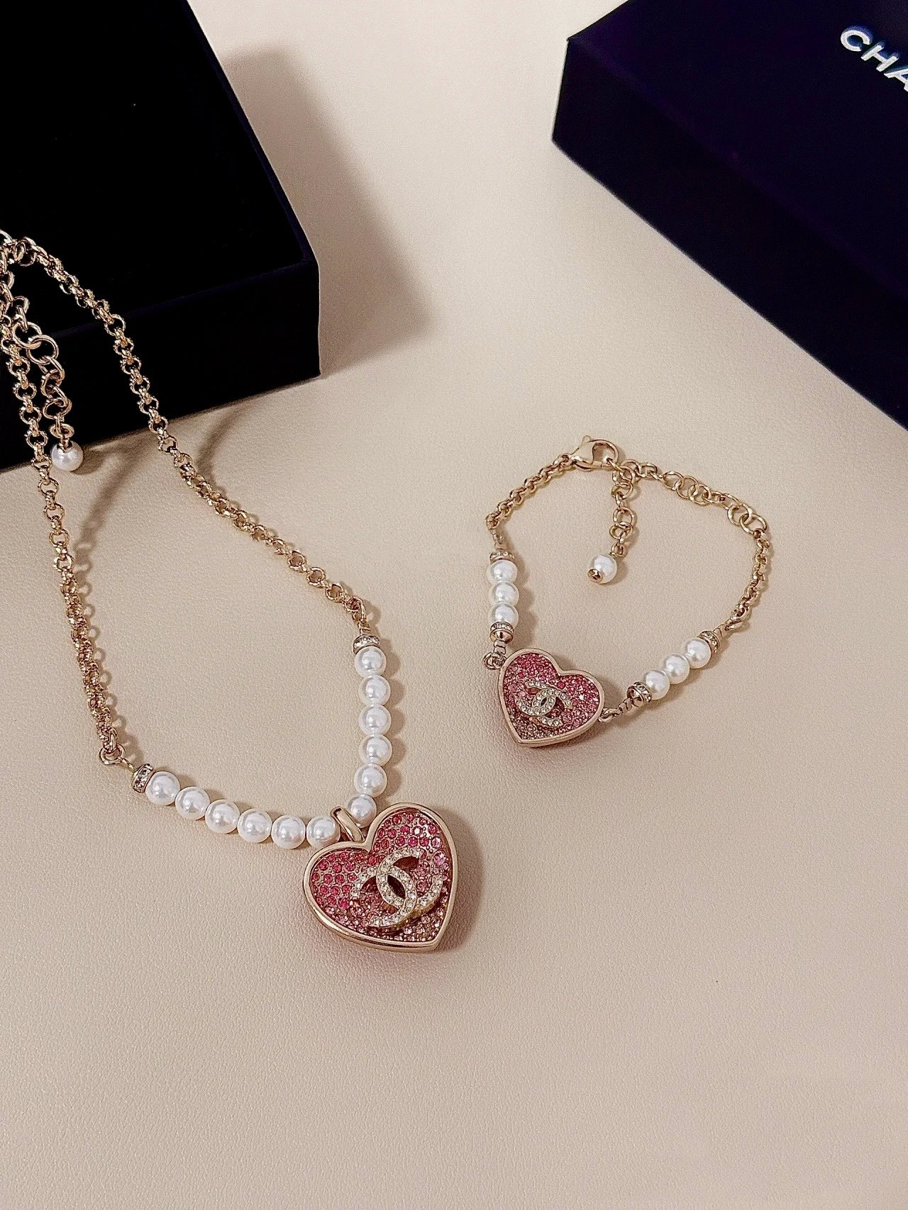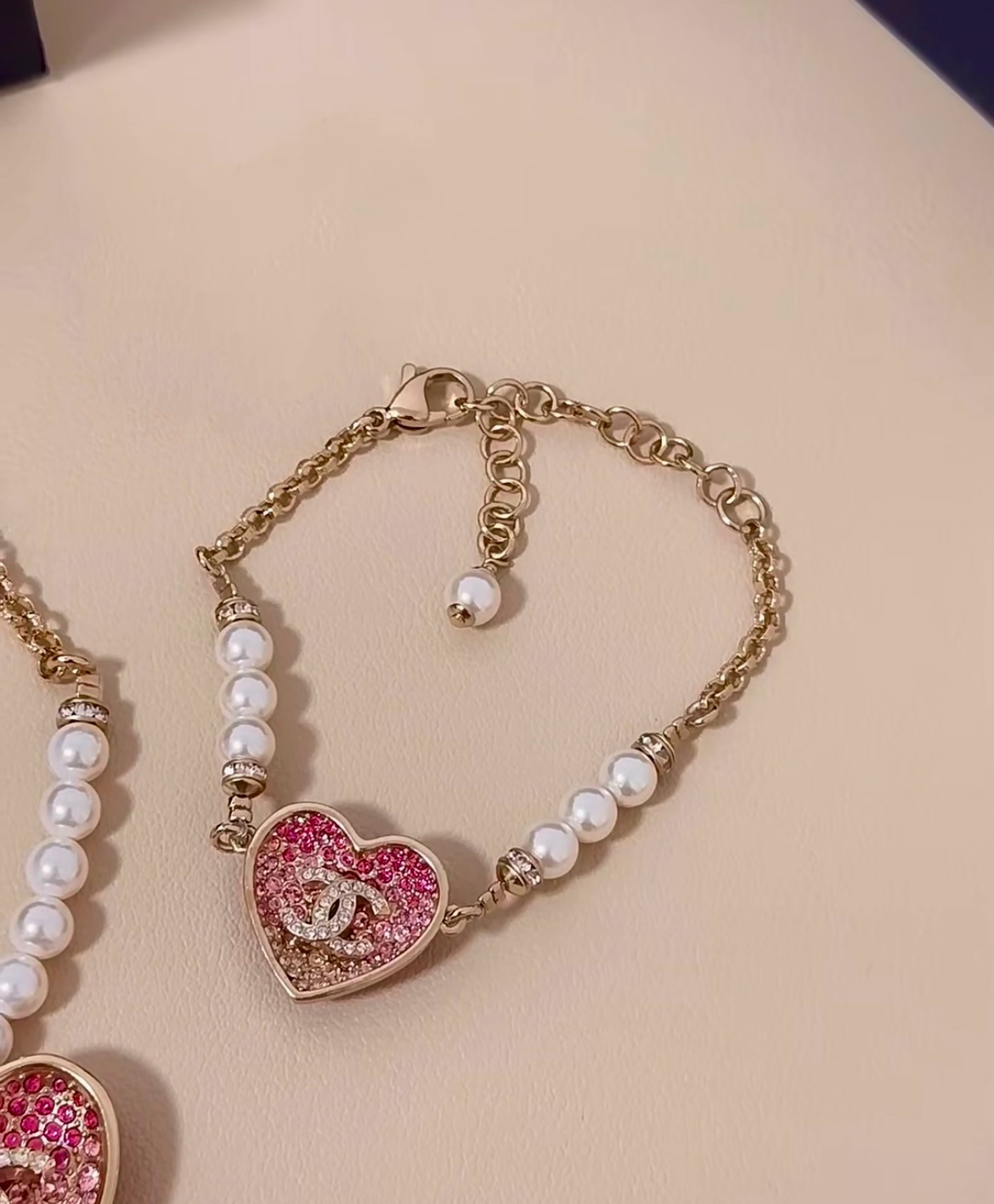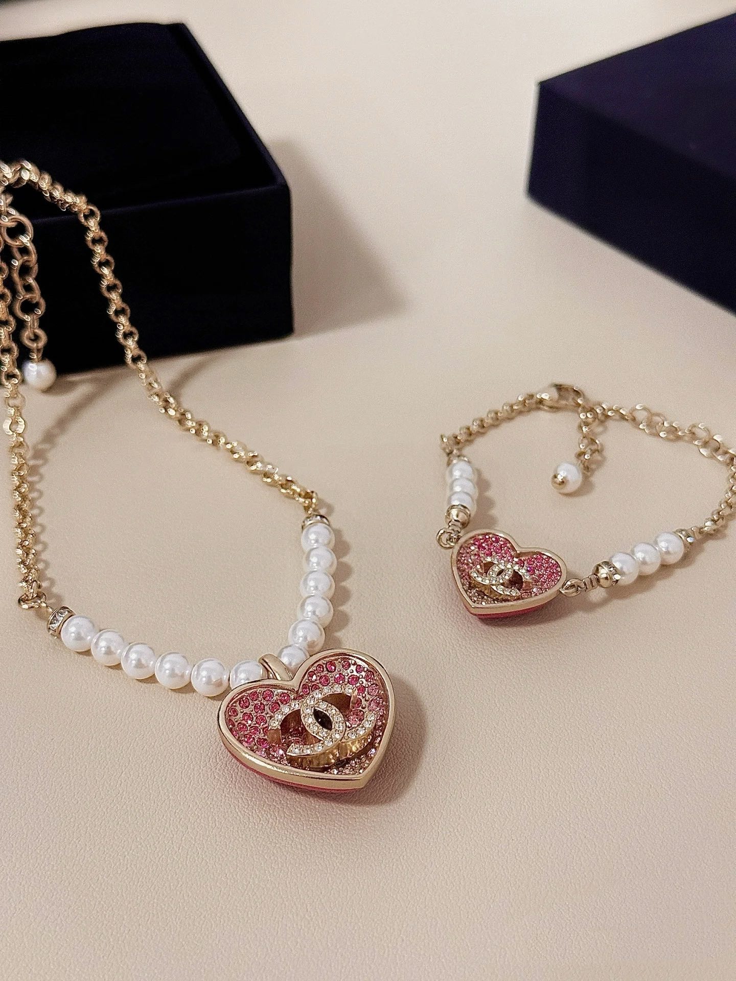 Pink gradient diamond heart necklace and bracelet with pearl accents.