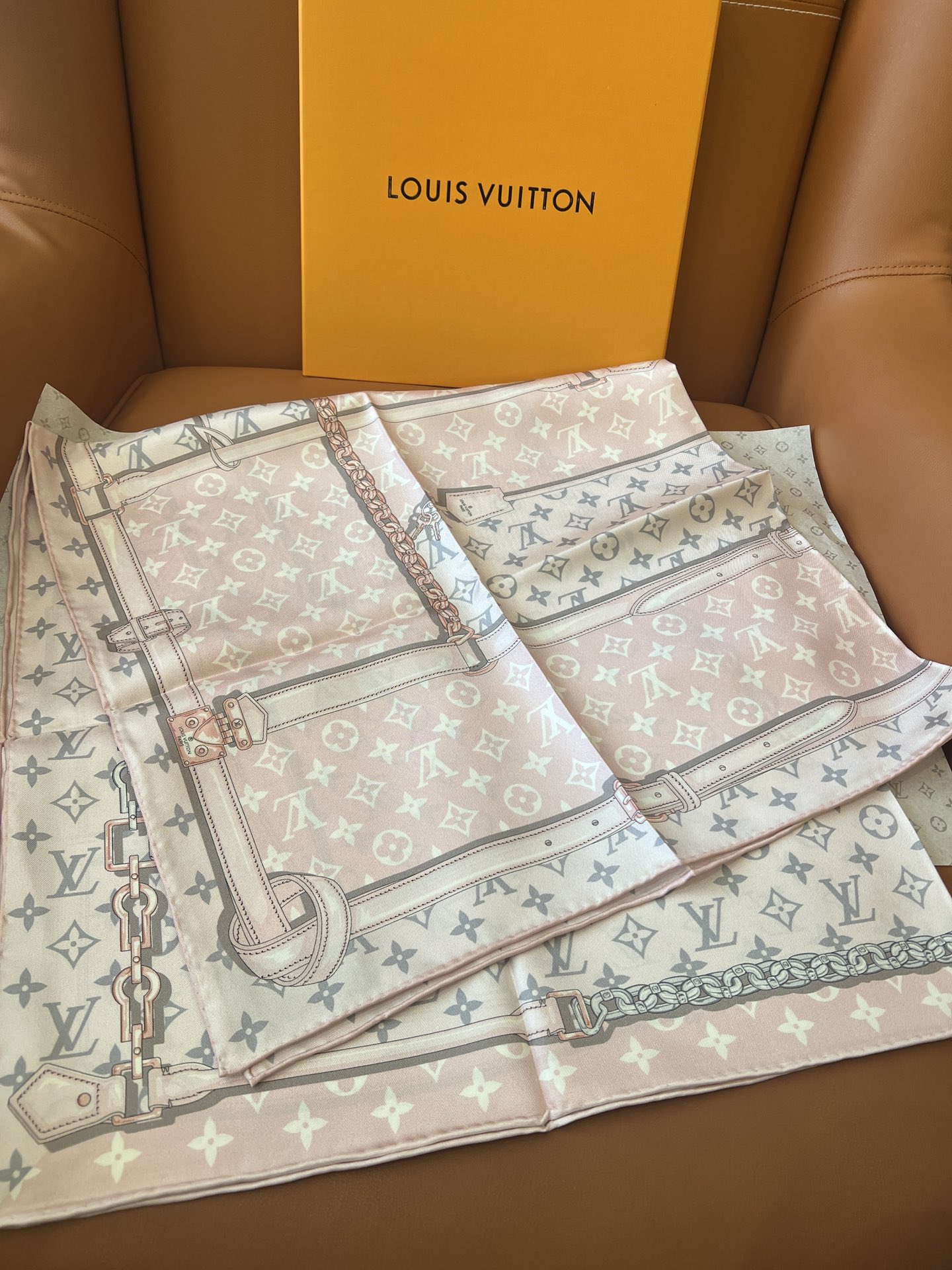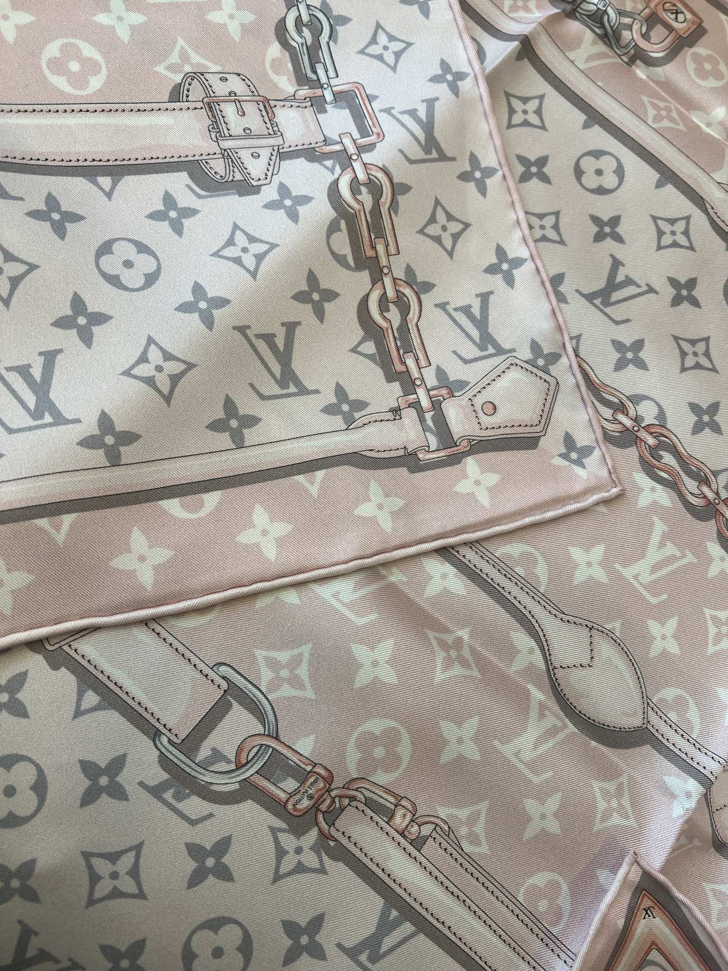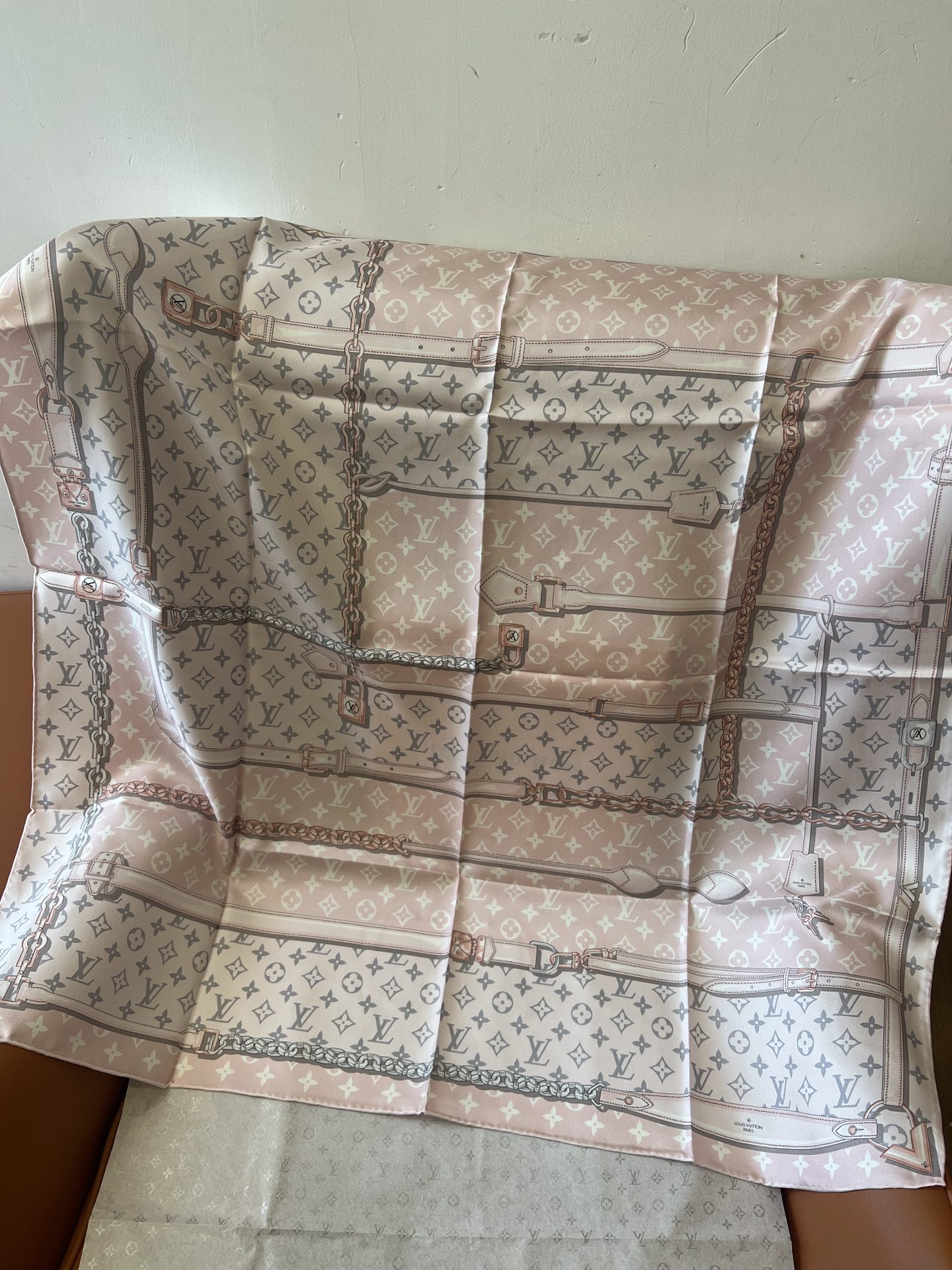 Pink LV chain scarf. Size: 90x90cm, 100% silk. Classic, versatile design.