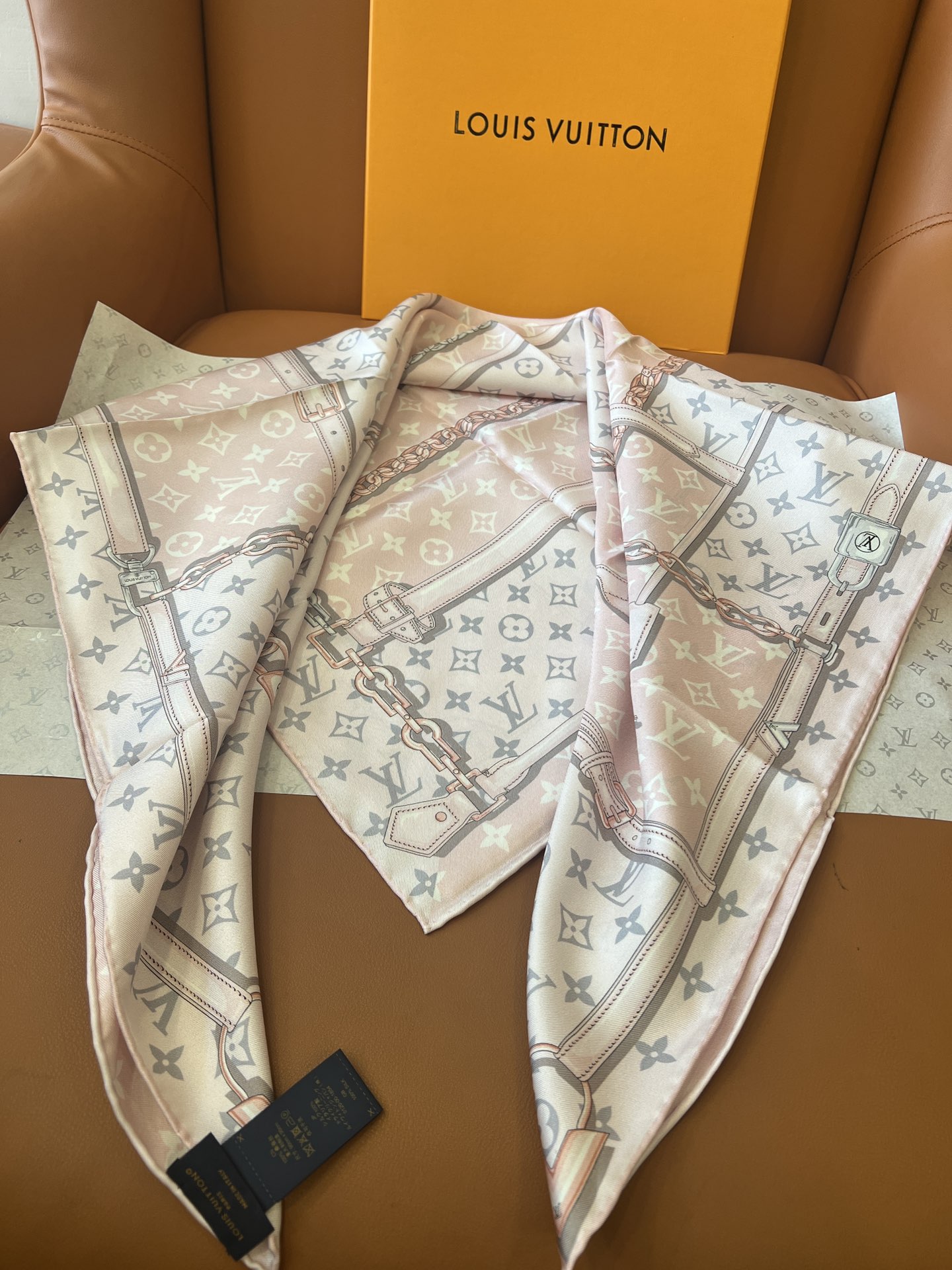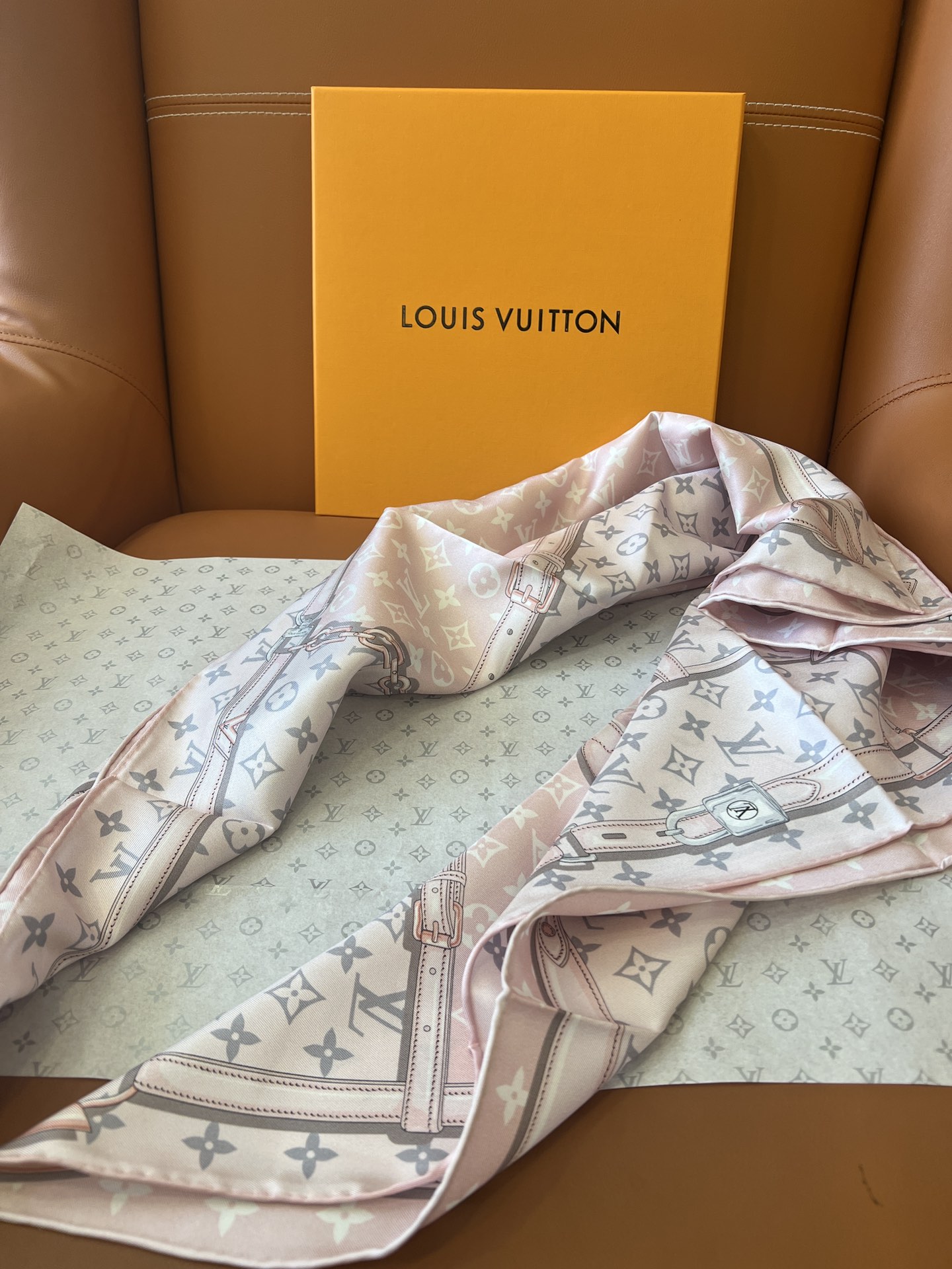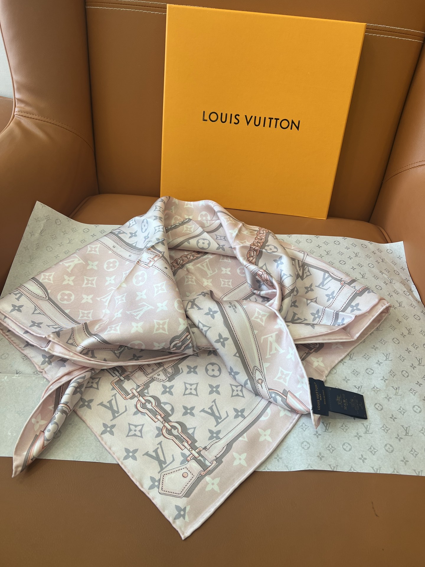 Pink LV chain scarf. Size: 90x90cm, 100% silk. Classic, versatile design.