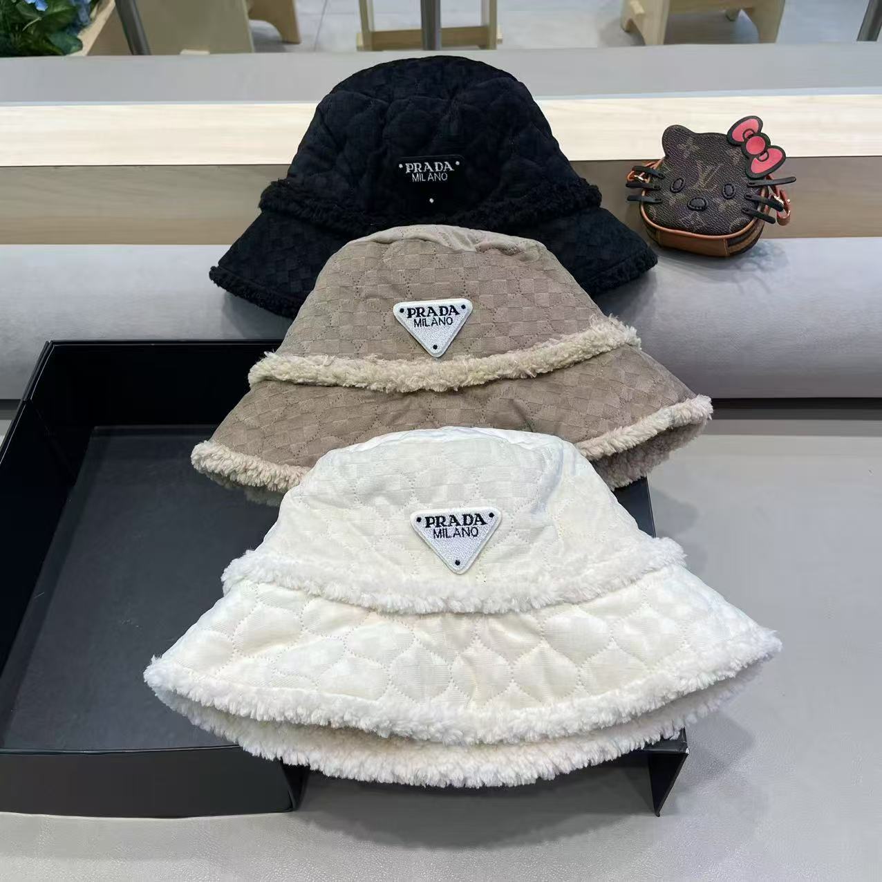 Prada fleece-lined corduroy bucket hat for women, autumn and winter warm and stylish.