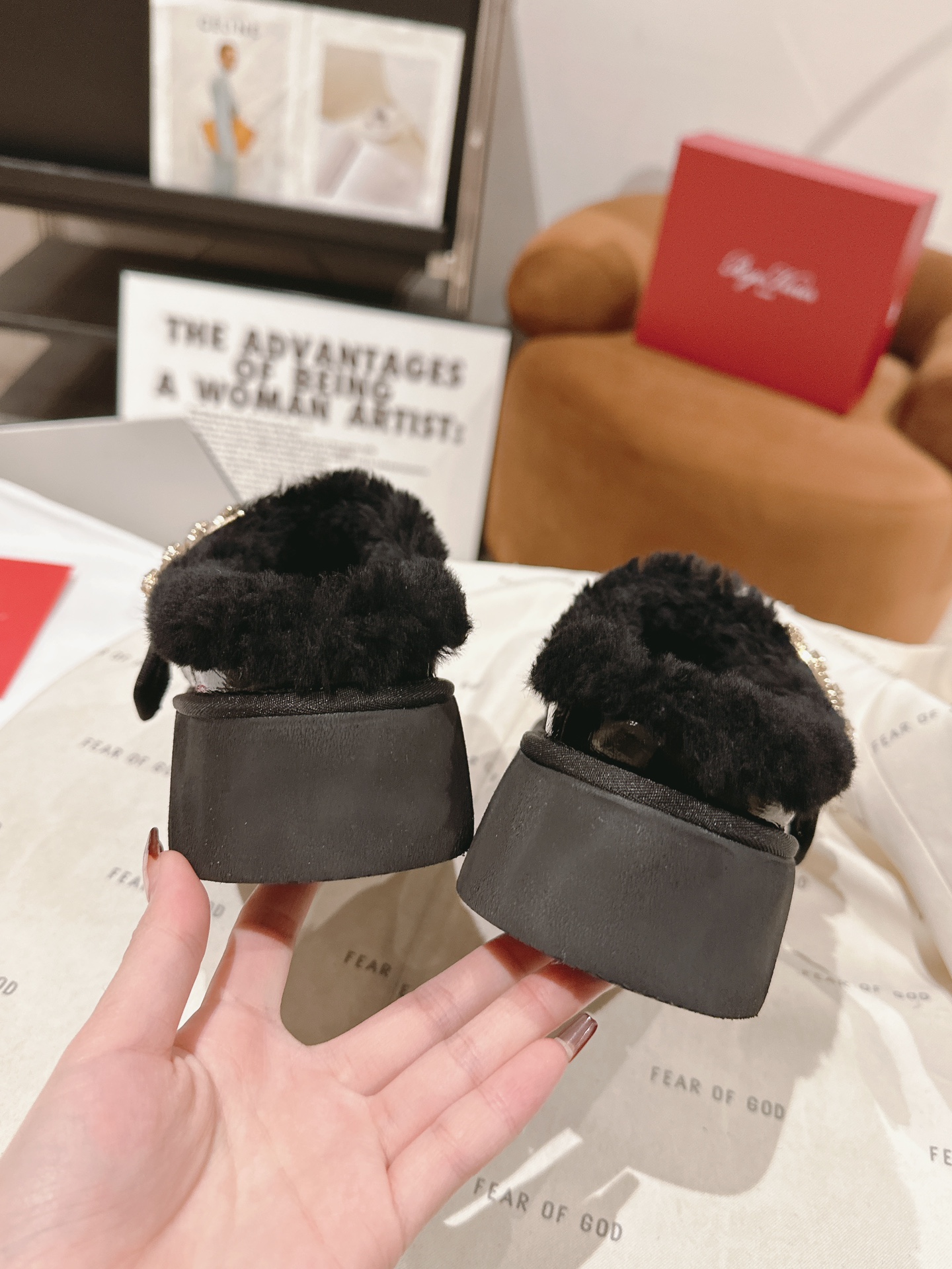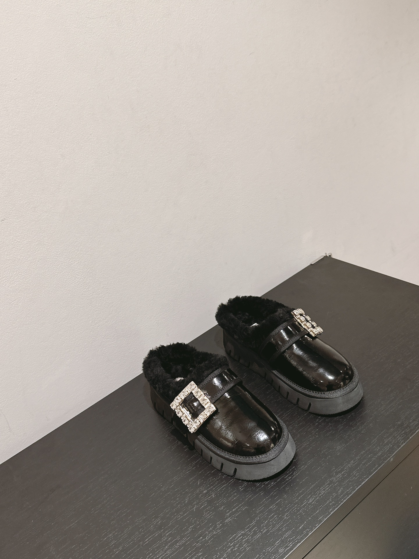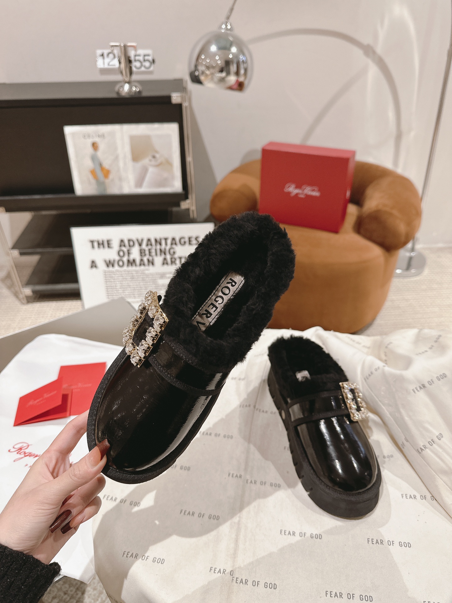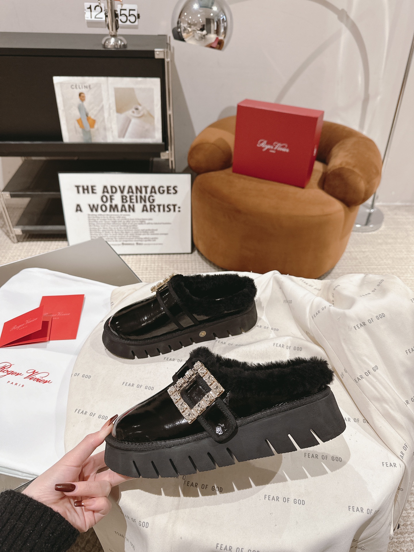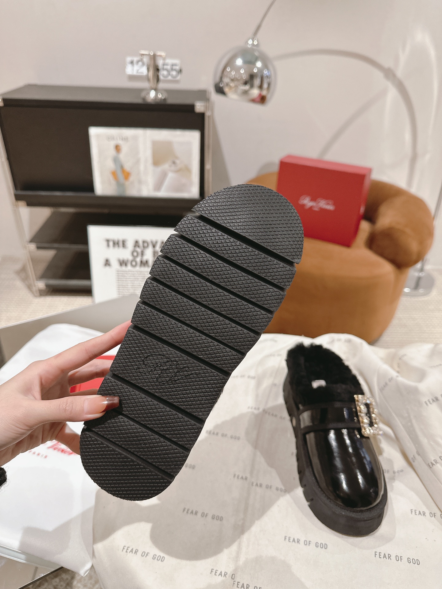 Purchasing quality❗️❗️Roger VI*** RV most beautiful snow slide sandals have arrived! Our product uses the last closest to the original, with a very rich feel. (The patent leather surface is made of imported wrinkled patent leather) (The suede is imported cow reverse suede) The inner lining is integrated fur and wool, very soft. Including color, thickness, and texture are all the same as the original, not too long nor too short, just right~ The shoe hardware is original mold hardware (private mold), made with genuine materials! The sole is made from original mold tooling! Lightweight on foot, sizes 35-40#