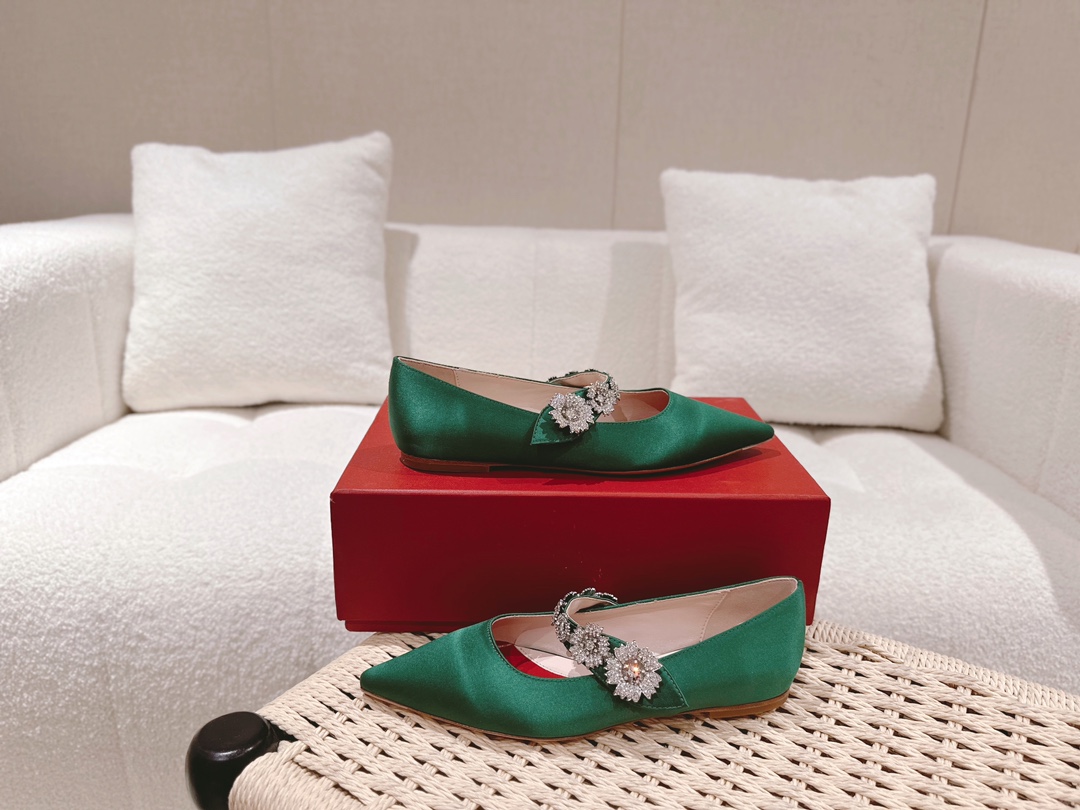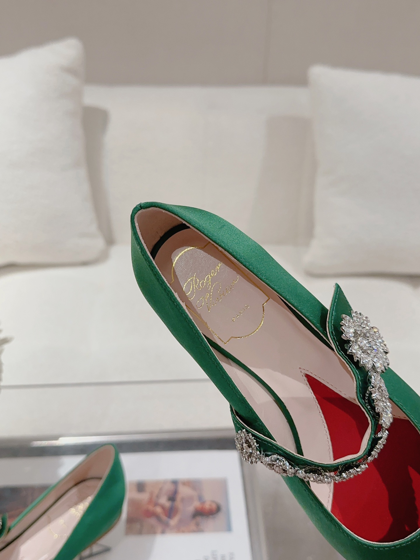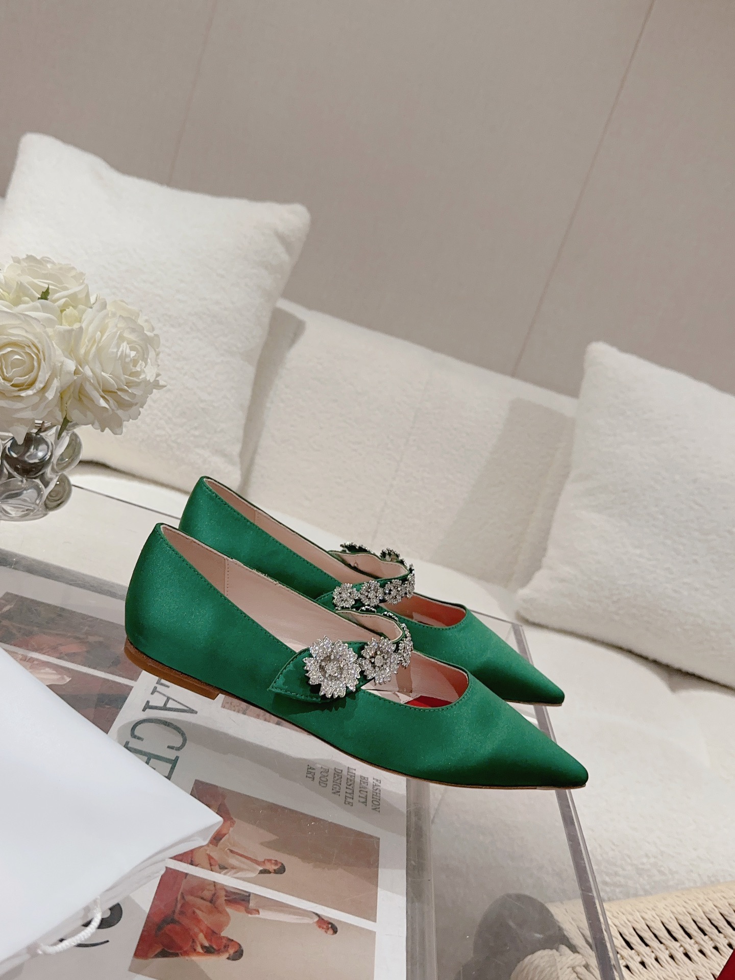 Roger Vivier 2023 SS silk pointed shoes with crystal buckle. Available in flat, 3.5cm low heel, 8.5cm high heel. Sizes 35-39, custom 34 & 40. Luxury packaging.