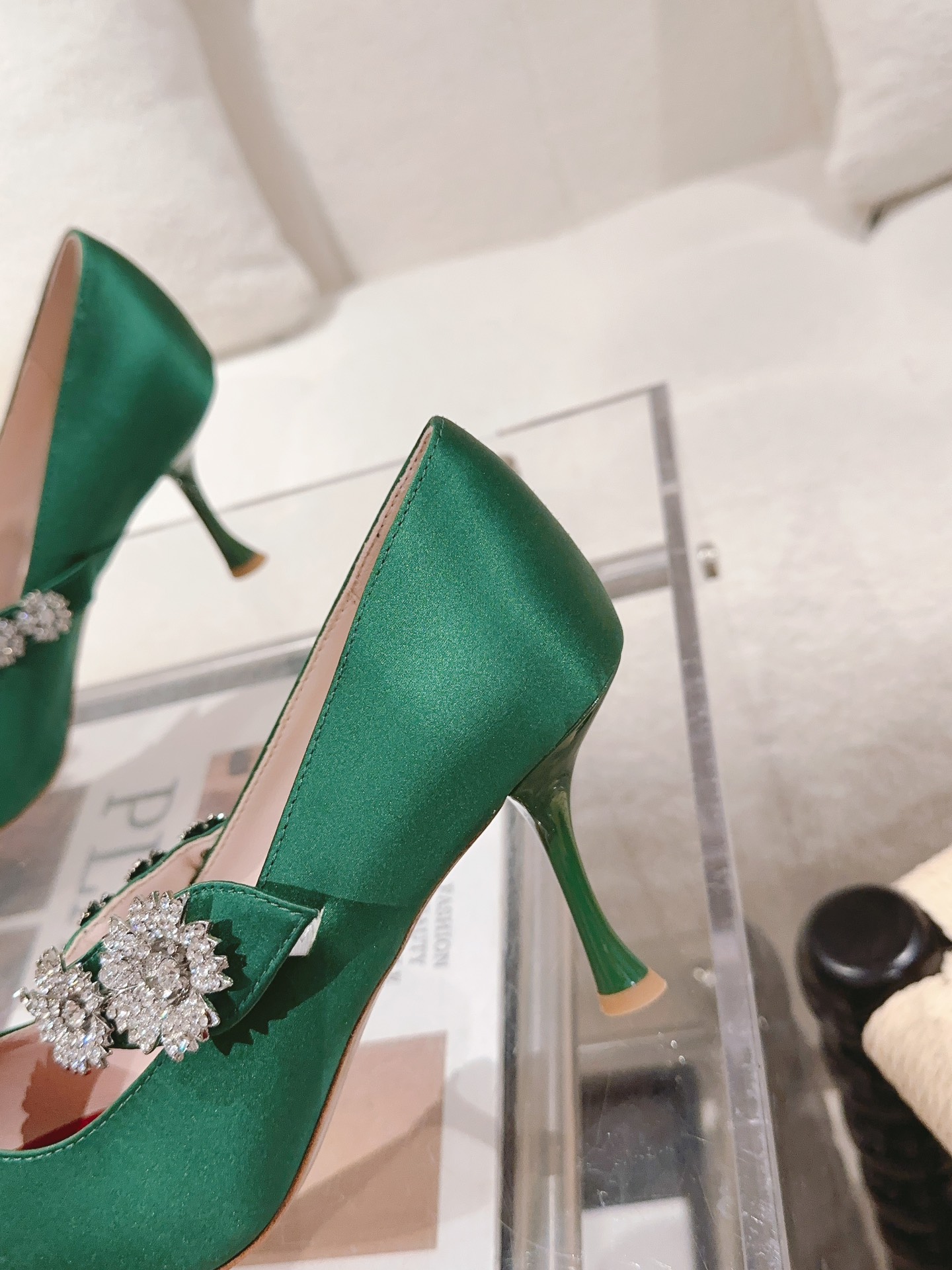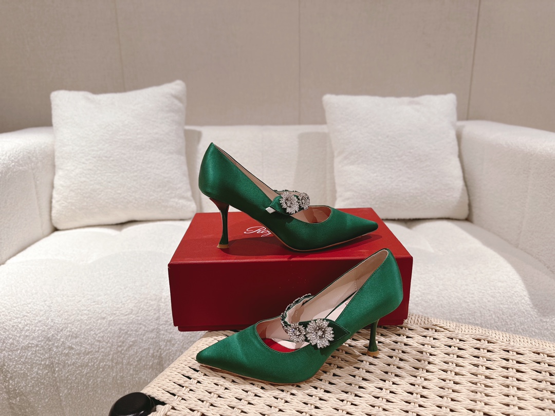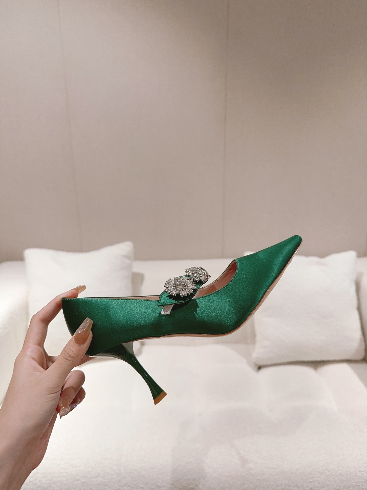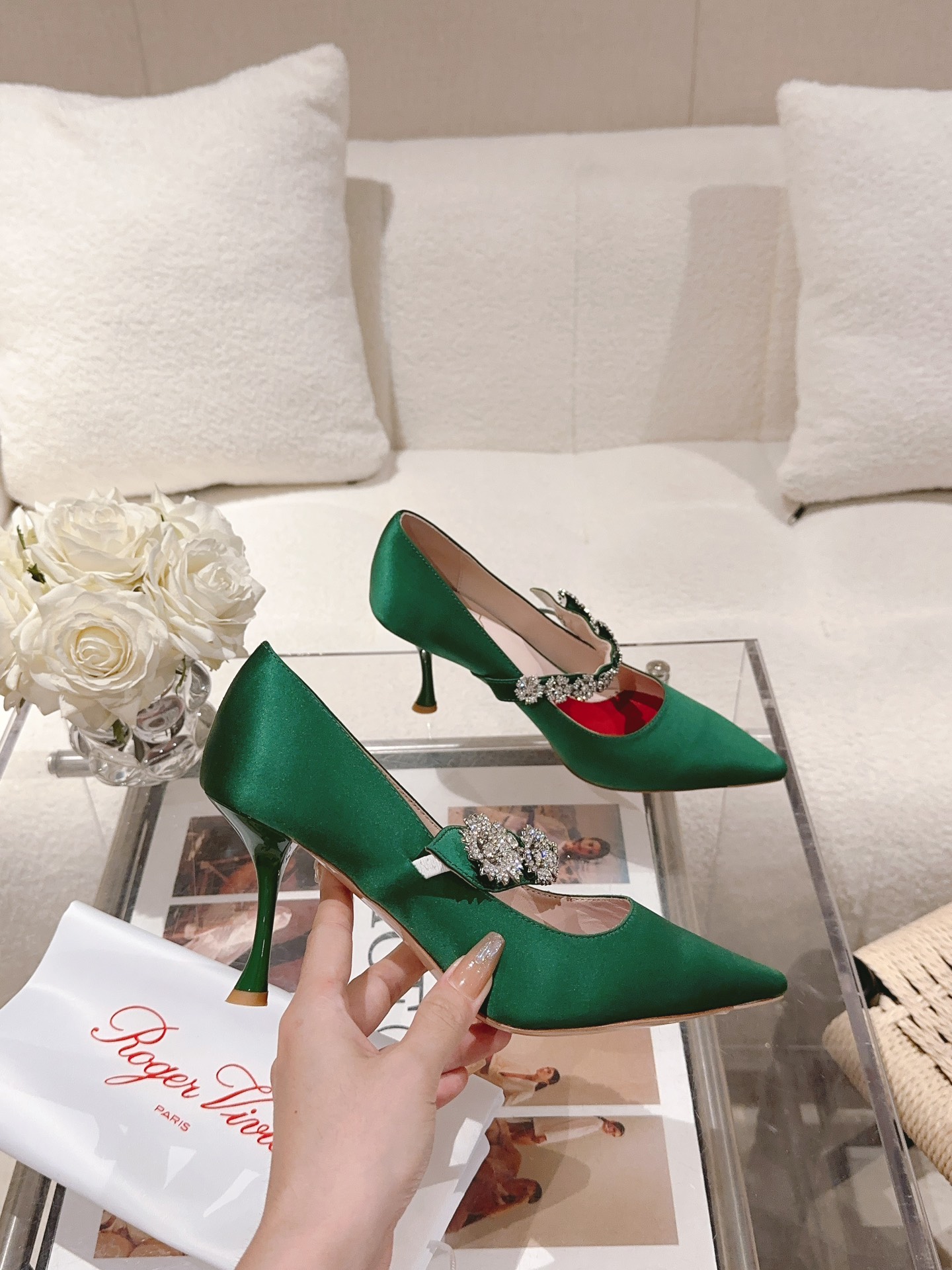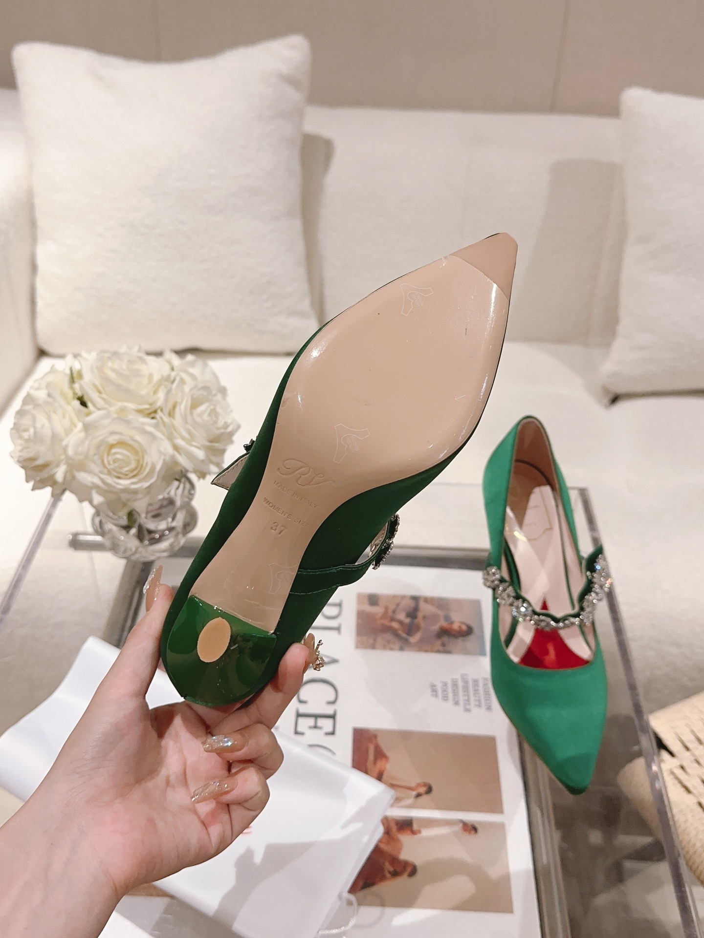 Roger Vivier 2023 SS silk pointed shoes with crystal buckle. Available in flat, 3.5cm low heel, 8.5cm high heel. Sizes 35-39.