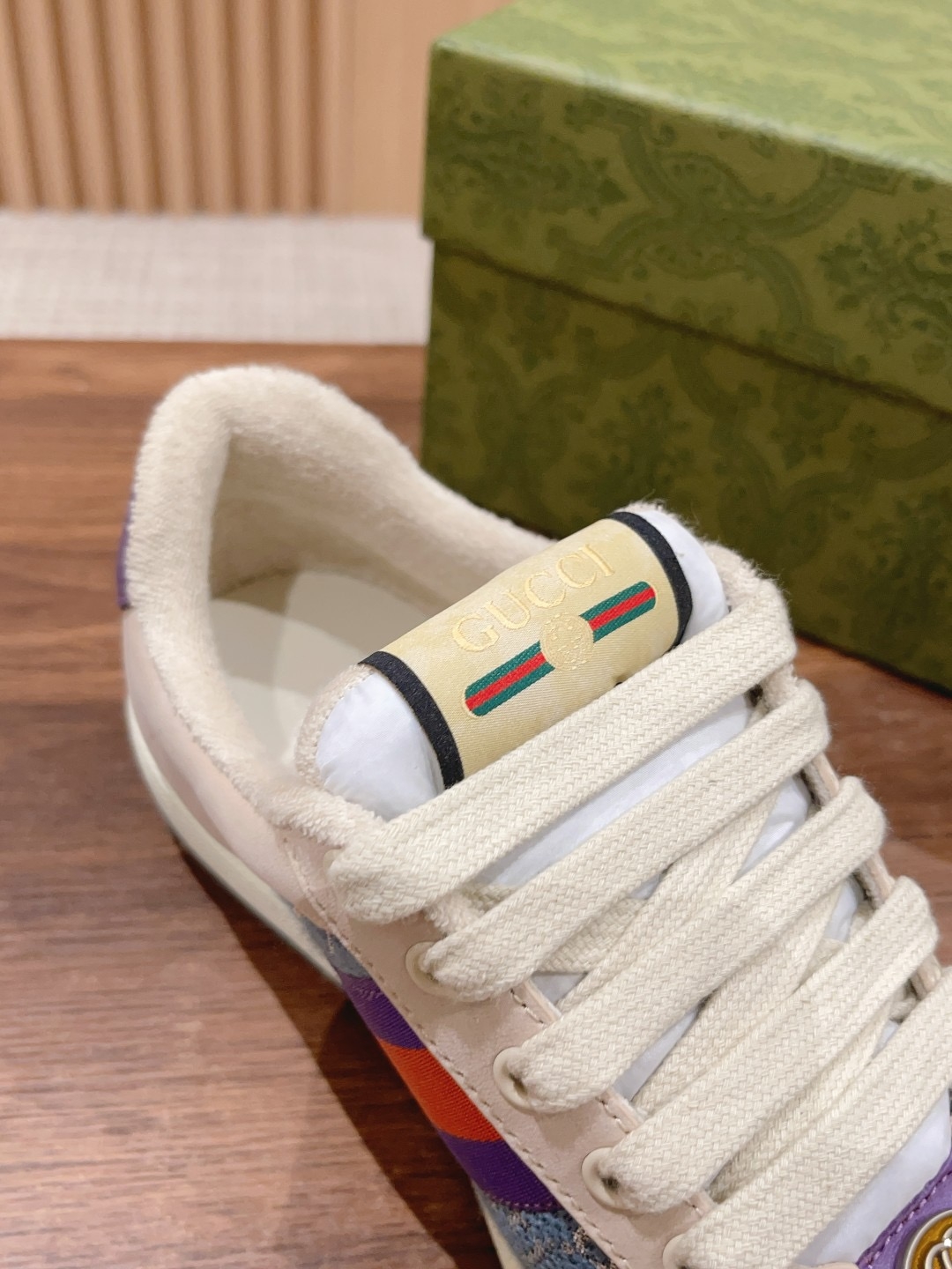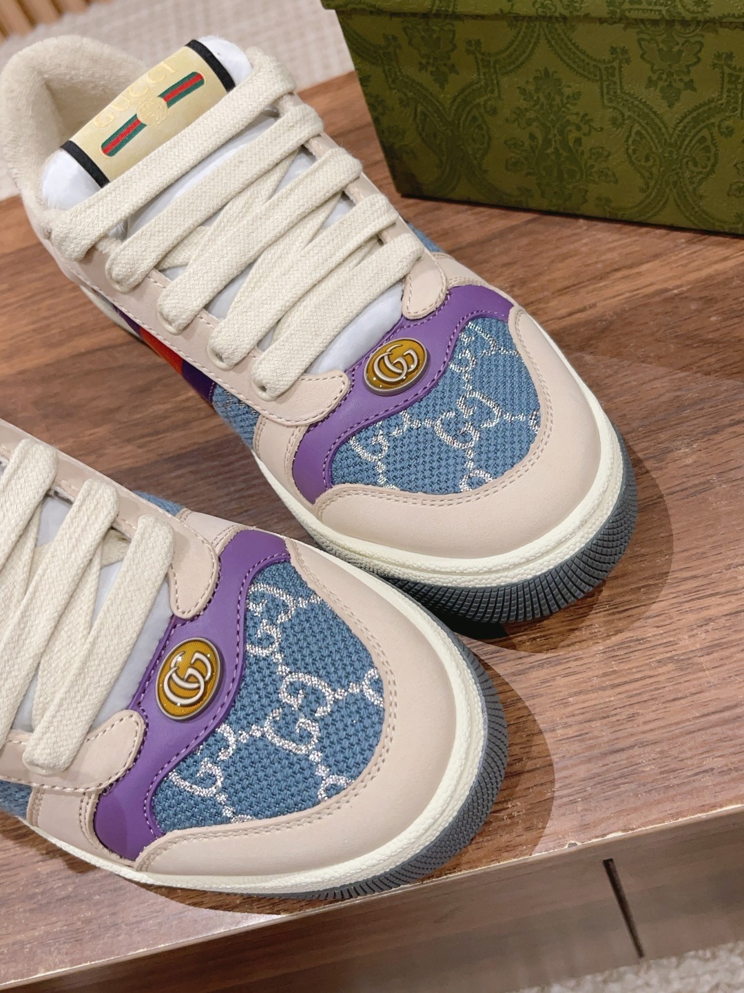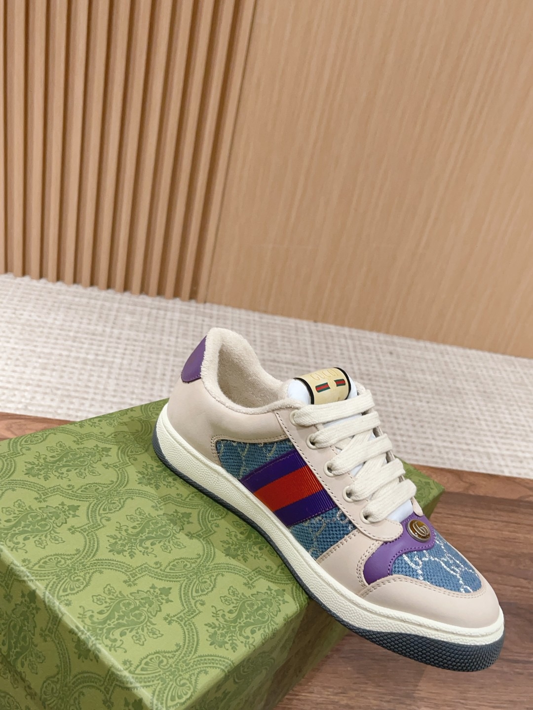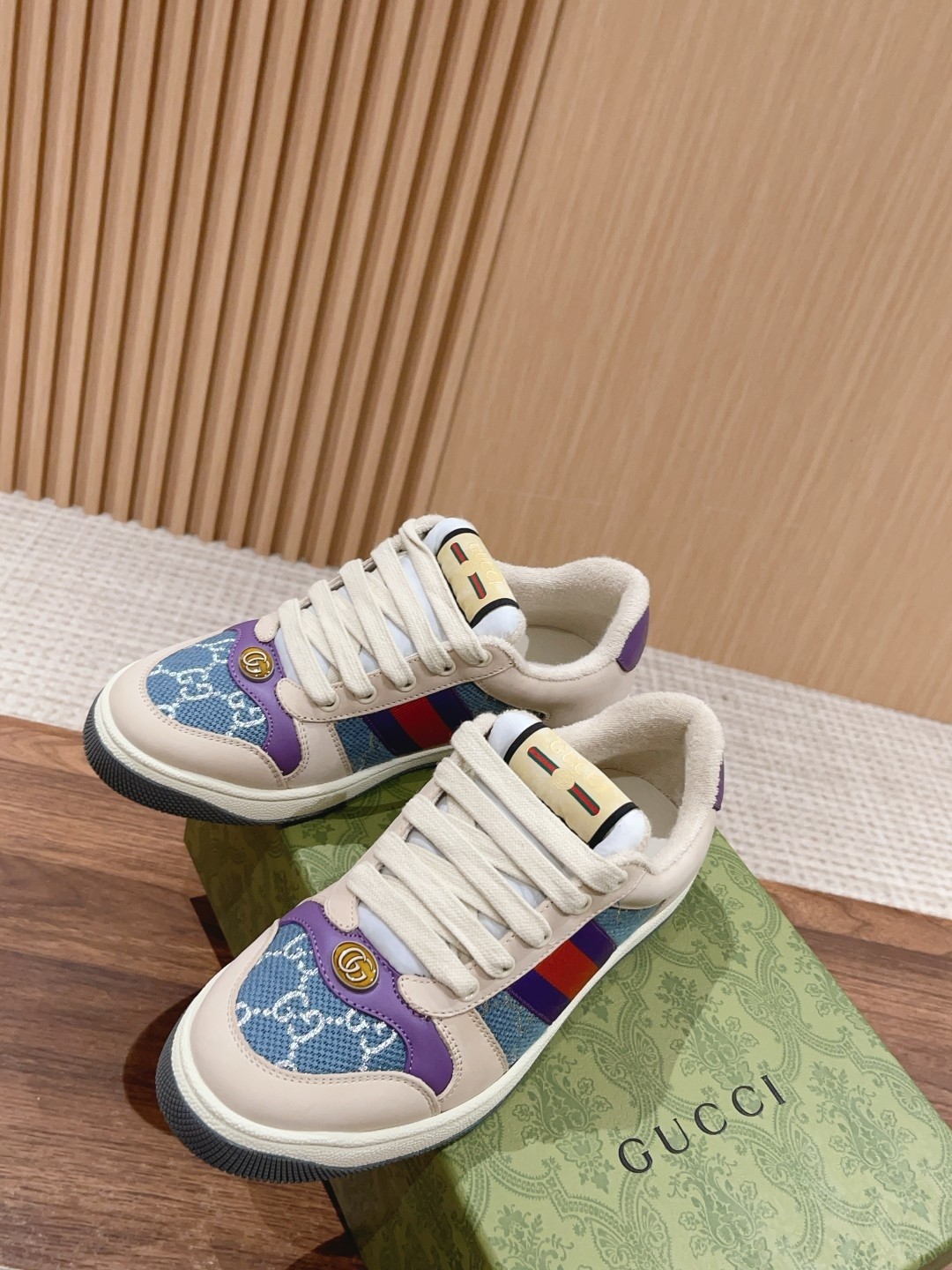 [Top Version] #Couple Sizes# Gucci Screener Gucci series small dirty sneakers, all upgraded with vacuum glue technology according to the authentic product. The leather and outsole are distressed and formed in one go, unlike market versions that are distressed later, resulting in a cheap-looking color. The inner lining is a custom cotton-polyester blended terry lining consistent with the genuine product, matching in thickness, breathability, and feel. Genuine molded cowhide footbed, stamped and formed, not the manually cut materials found in ordinary market versions. The metal double G oval enamel hardware is molded according to the original. The latest outsole has adjusted details compared to previous versions, and we have also upgraded it. The exclusive private mold and TPR outsole, consistent with the authentic product, perfectly restore the original craftsmanship in terms of softness/hardness, line definition and clarity of the pattern, and wearing comfort. The common rubber outsoles on the market not only have incorrect colors, patterns, and bee图案 on the sole, but also completely lack texture. The sole thickness is approximately 2.5cm. Full set of packaging consistent with the authentic product. Size: Women's 35-39 (40 custom-made, no returns or exchanges) Men's: 39-44 (45 custom-made, no returns or exchanges)