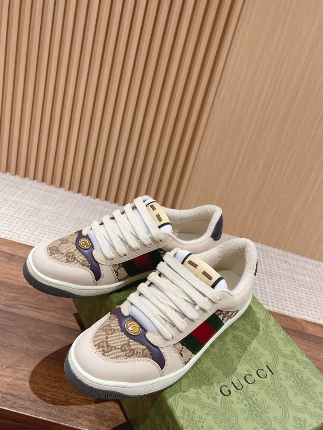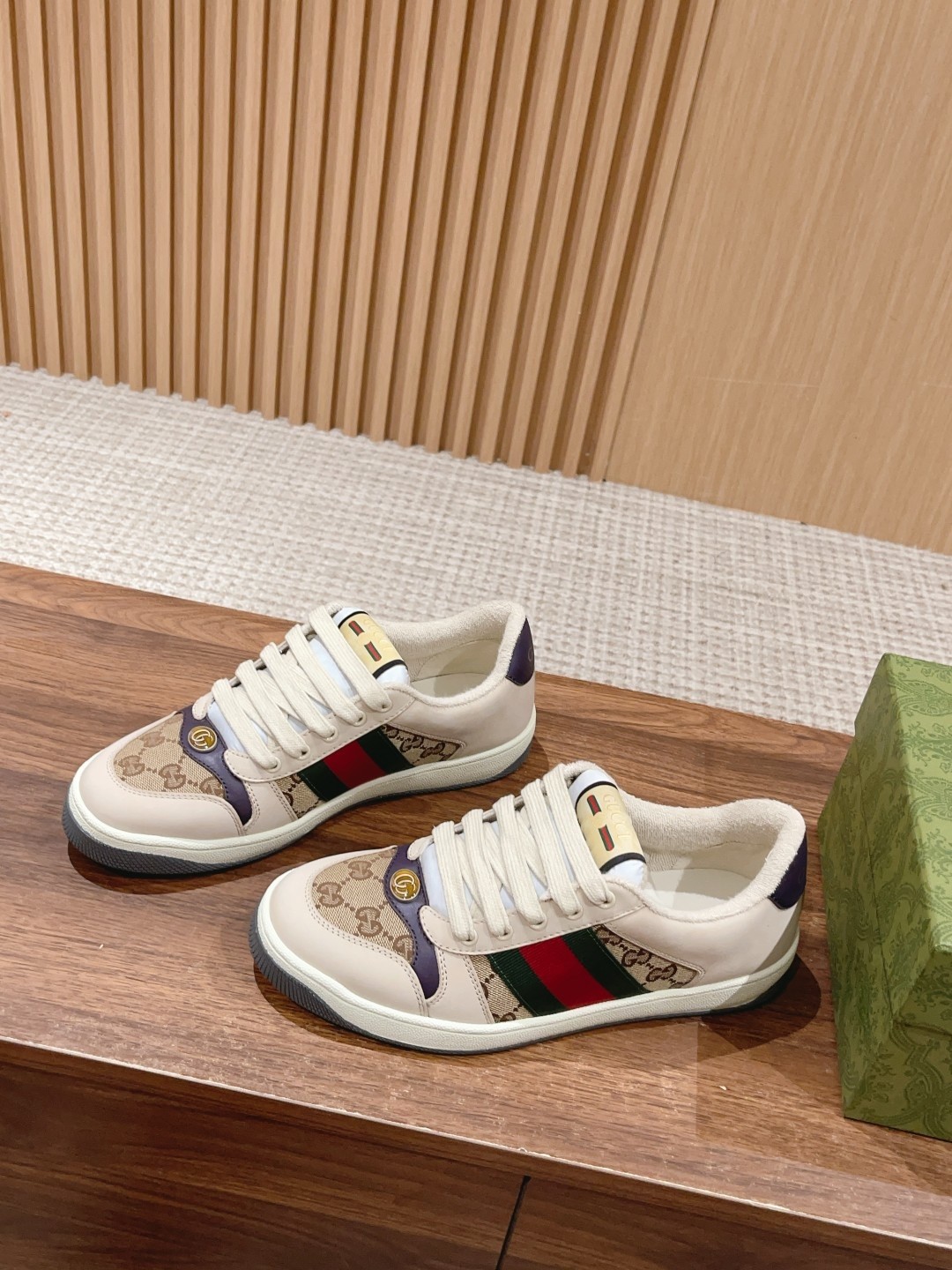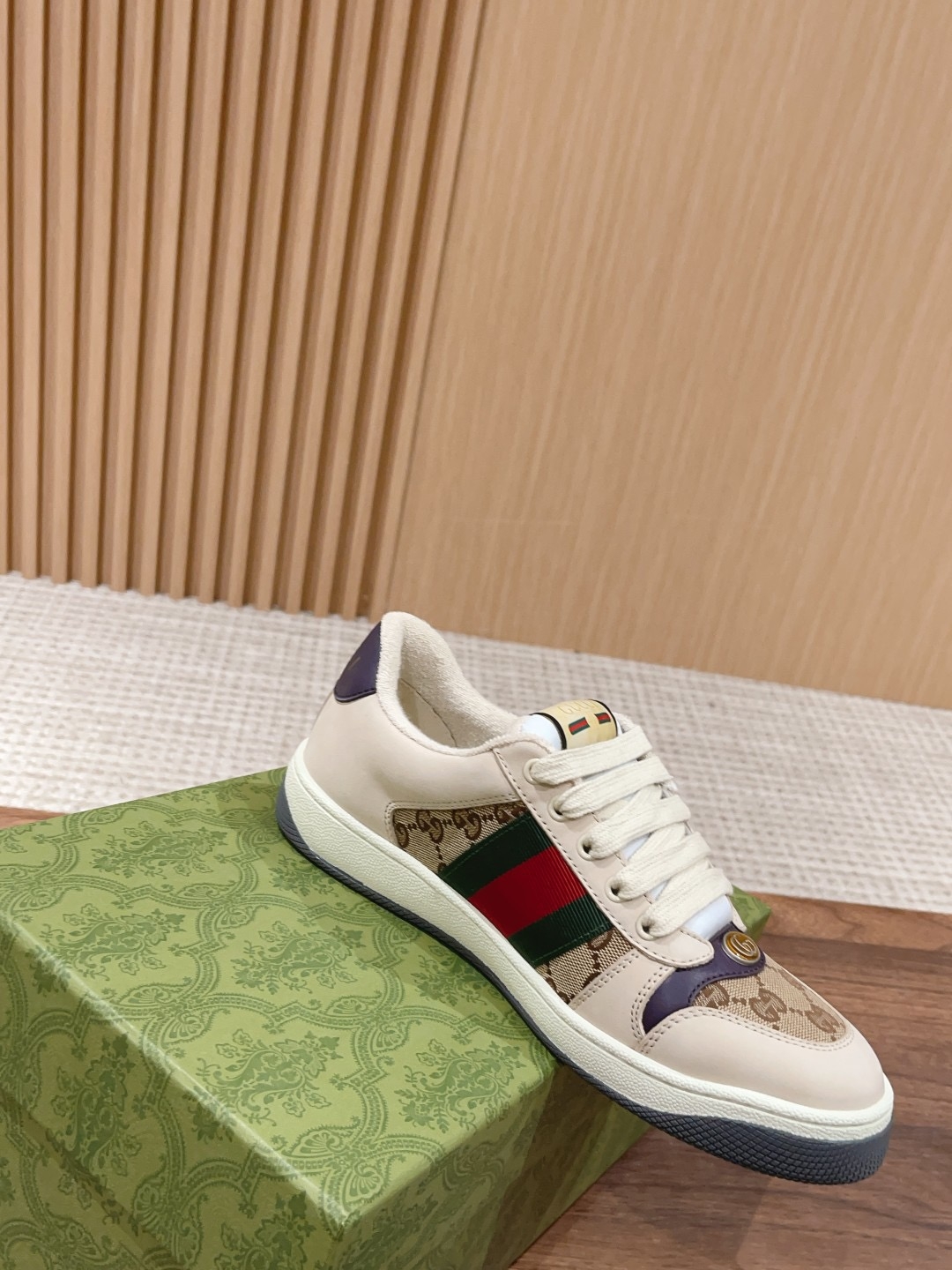 Top Gucci Screener sneakers, upgraded craftsmanship, authentic materials, aged look, custom details, full packaging. Sizes: Women 35-39, Men 39-44.