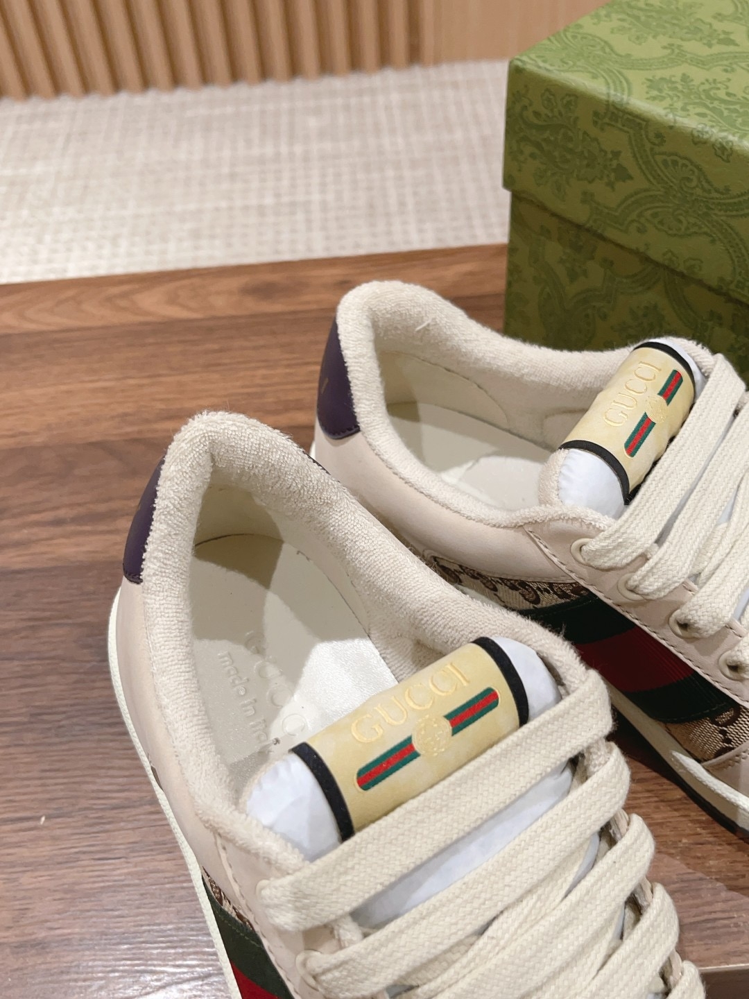 [Top Version] #Couple Sizes# Gucci Screener Gucci series small dirty sneakers, all upgraded with vacuum glue technology according to the authentic product. The leather and outsole are distressed and formed in one go, unlike market versions that are distressed later, resulting in a cheap-looking color. The inner lining is a custom cotton-polyester blended terry lining consistent with the authentic product, matching in thickness, breathability, and feel. Authentic molded cowhide insoles, stamped and formed, not manually cut like ordinary market versions. Metal double G oval enamel hardware molded from the original. The latest outsole details have been adjusted compared to previous versions; we have also upgraded it. The exclusive private mold and TPR outsole, consistent with the authentic product, perfectly restore the original craftsmanship in terms of softness/hardness, line definition and clarity of the pattern, and wearing comfort. The common market rubber soles not only have incorrect color, pattern, and sole bee design but also completely lack texture. Sole thickness is approximately 2.5cm. Full set of packaging consistent with the authentic product. Size: Women's 35-39 (40 custom-made, no returns or exchanges) Men's: 39-44 (45 custom-made, no returns or exchanges)