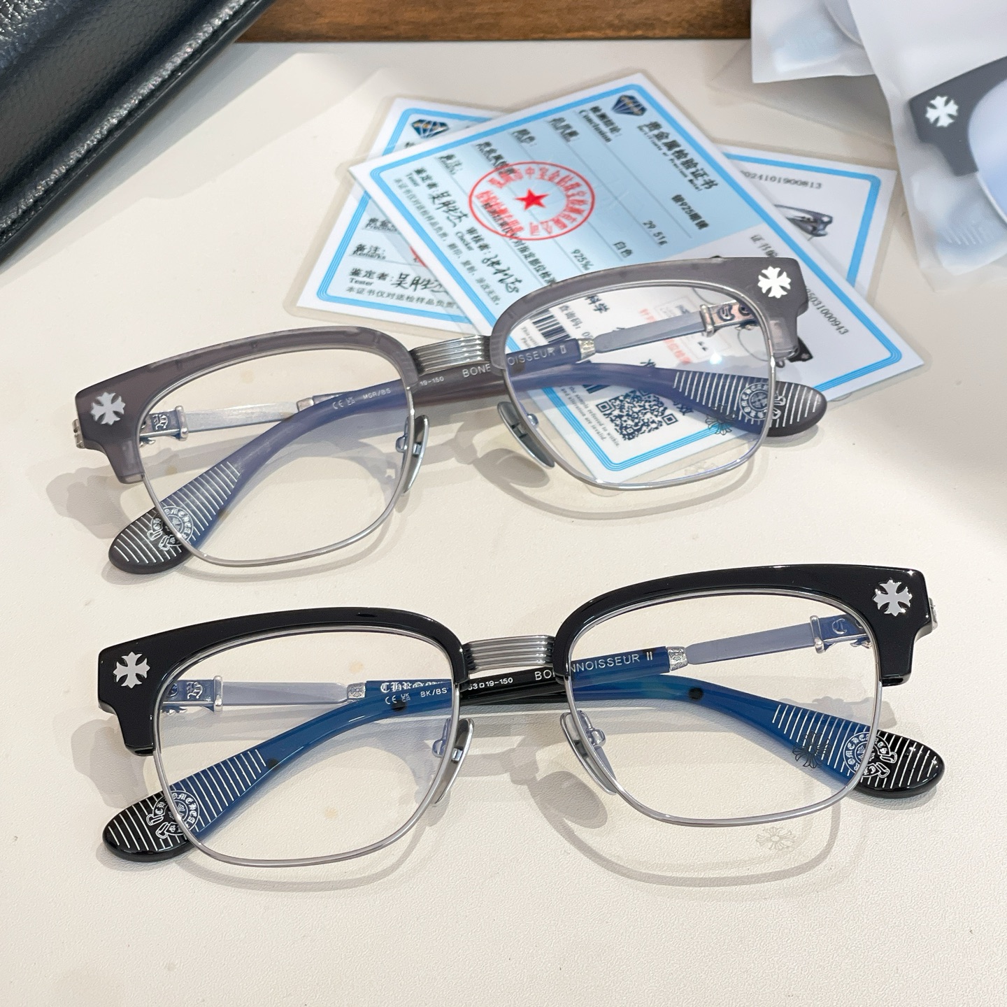 Top quality Chrome Hearts glasses frame, model Bonennoisseur II, size 57-20-146, sterling silver.