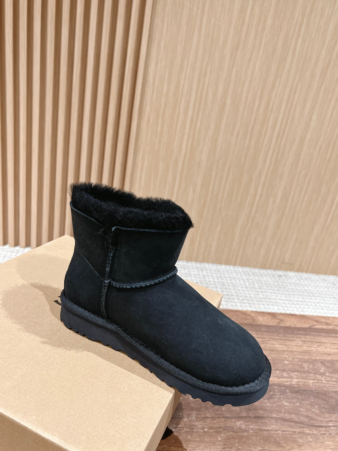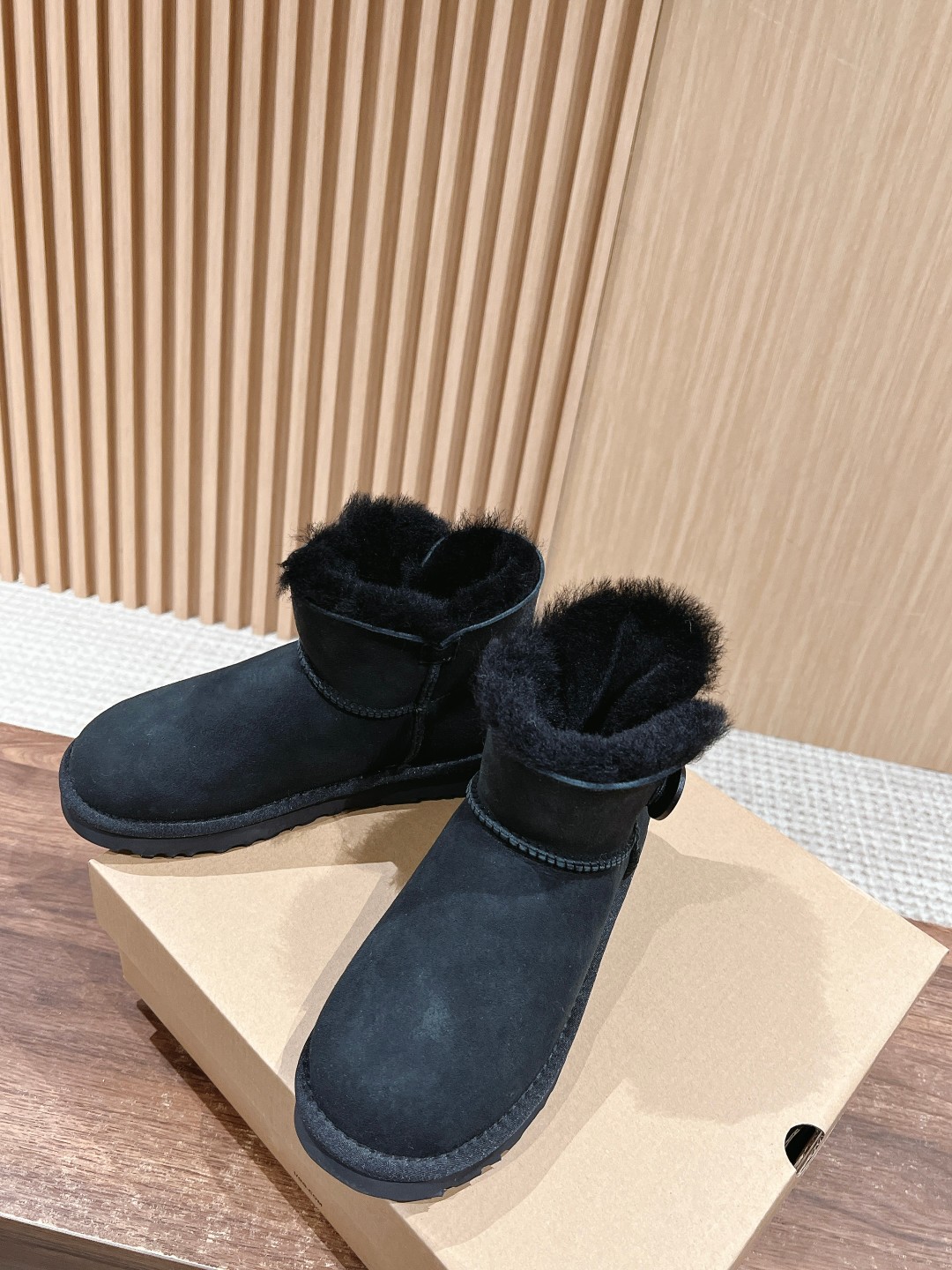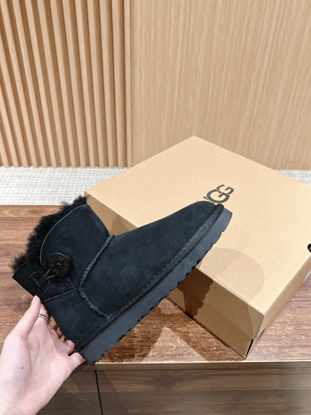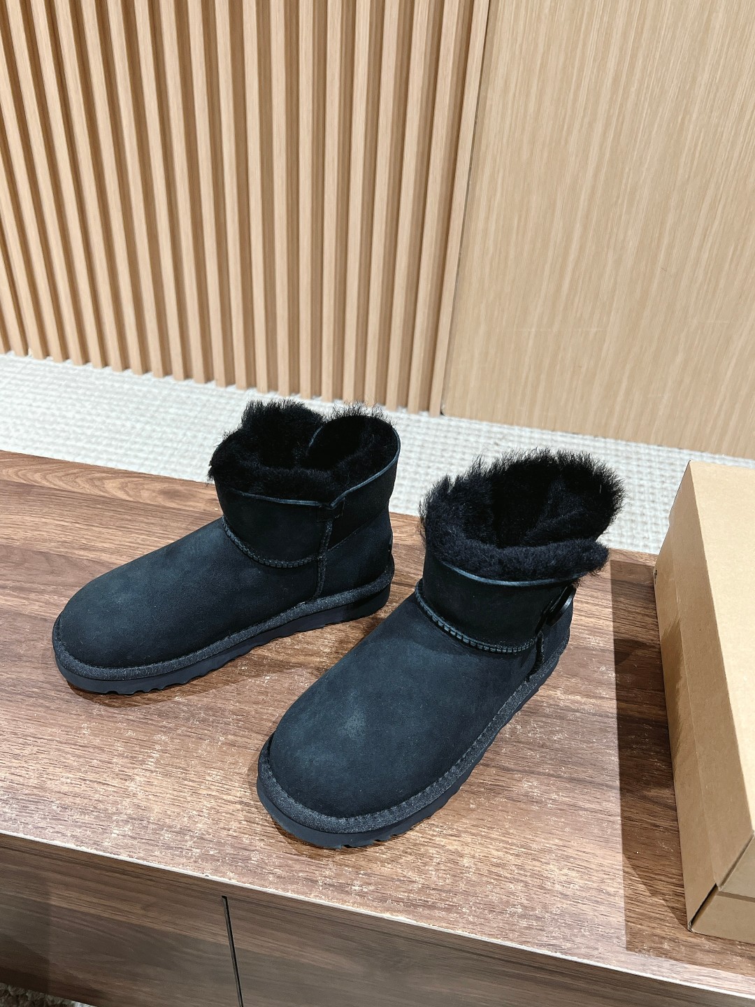 UGG 3352 Wooden Buckle Snow Boots. Made of premium sheepskin, soft and warm. Lightweight EVA sole for comfort. Wooden buckle and elastic closure design. Sizes 35-39.