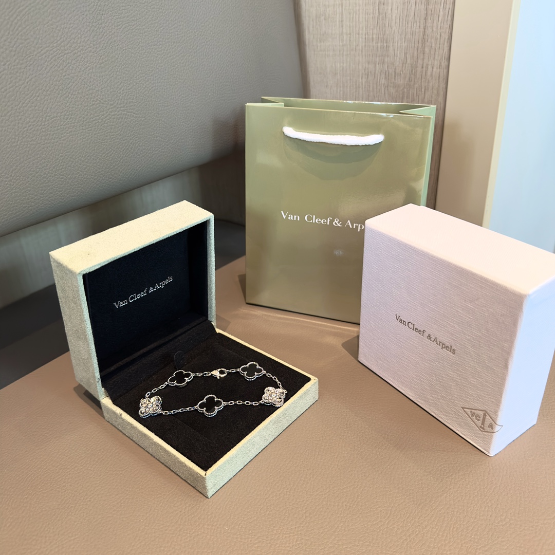 VCA Alhambra 5-motif bracelet with diamond and mother-of-peirl. High-quality craftsmanship, classic clover design, full packaging.