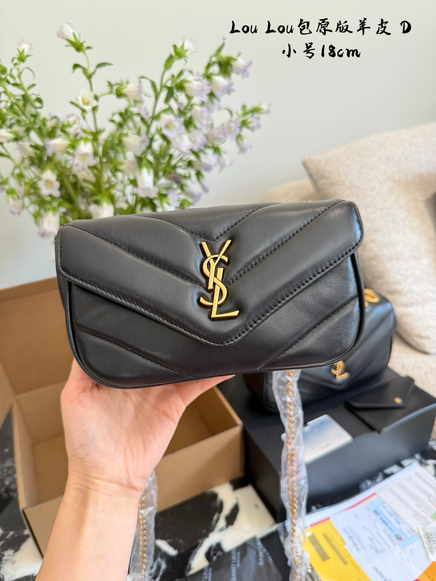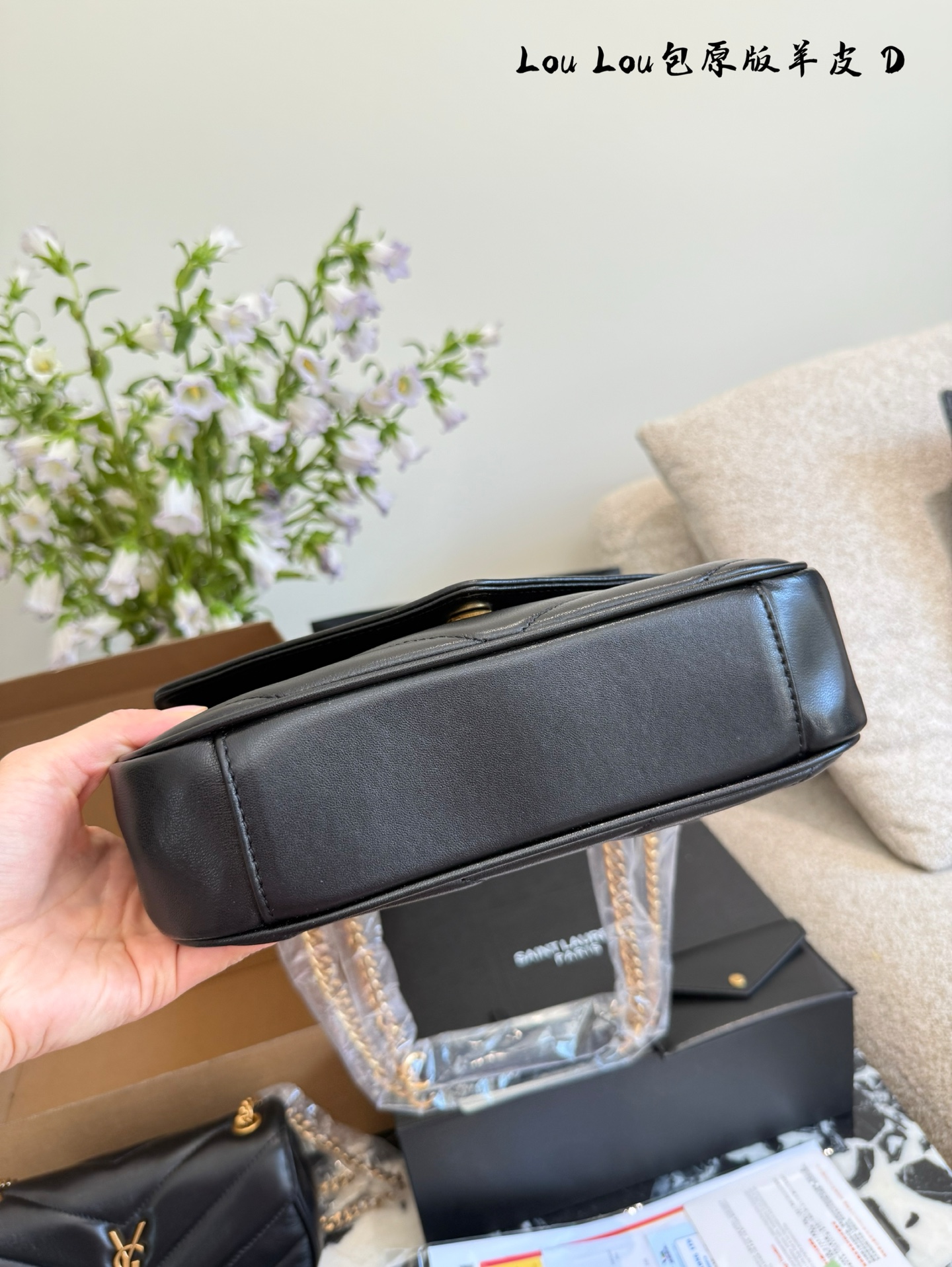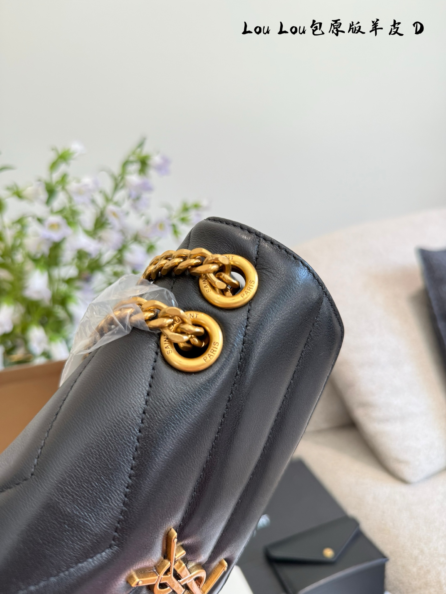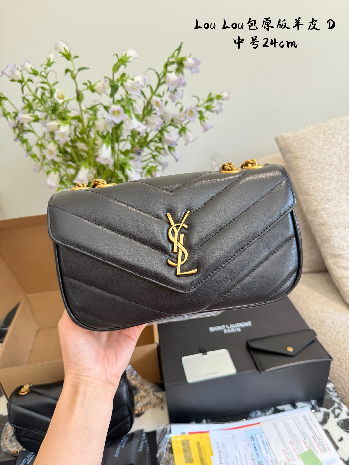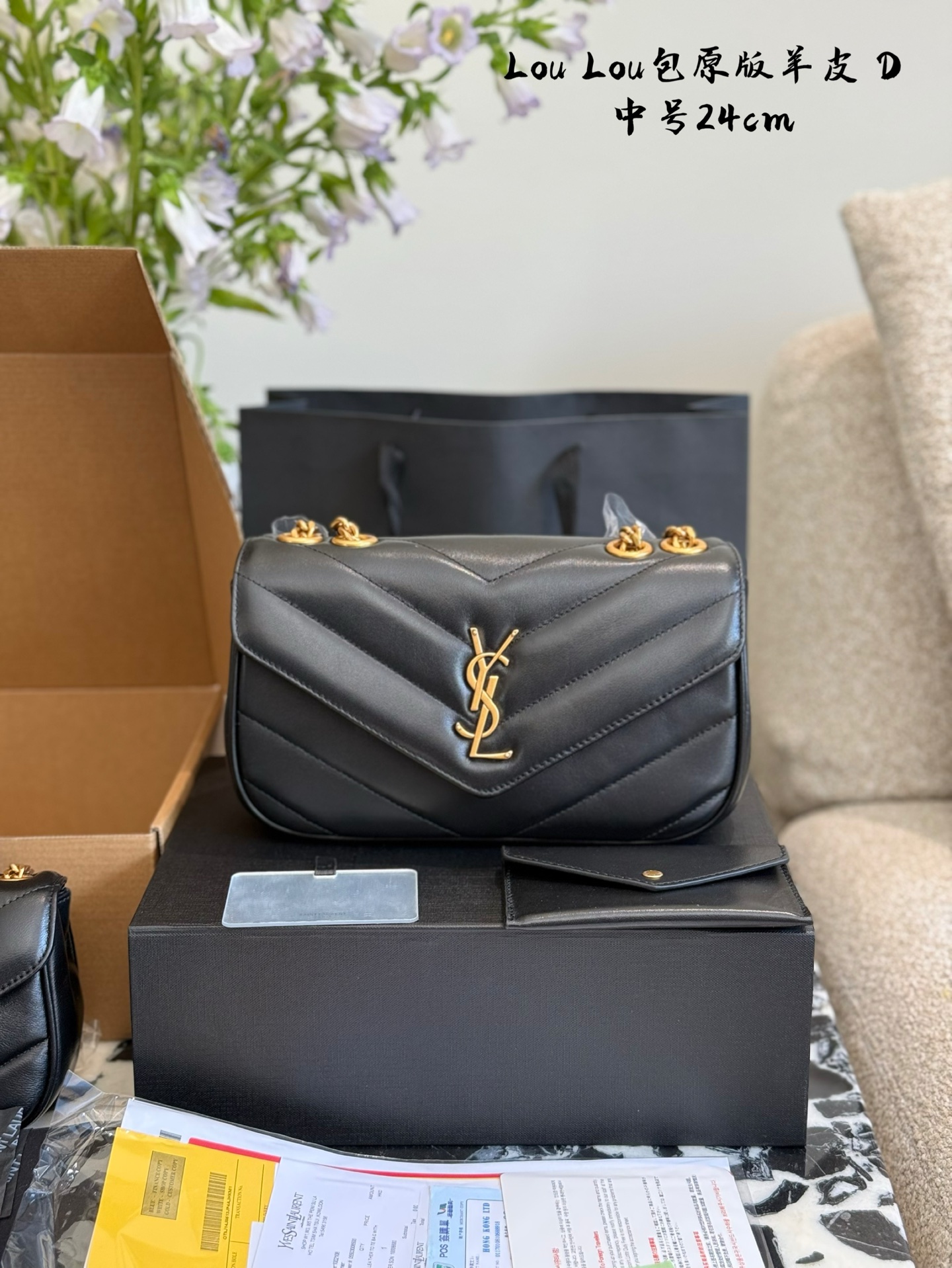 YSL LouLou bag in soft lambskin with chain strap, 24cm. Includes card holder, mirror, and full packaging.