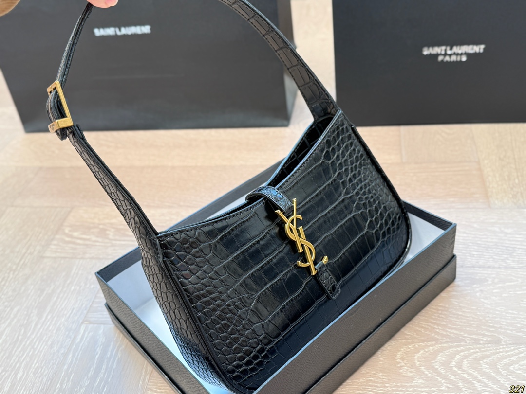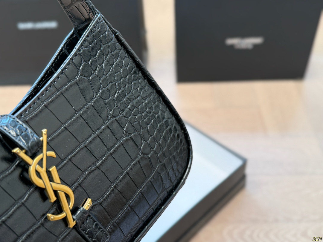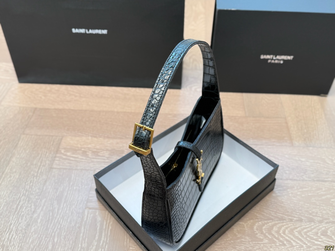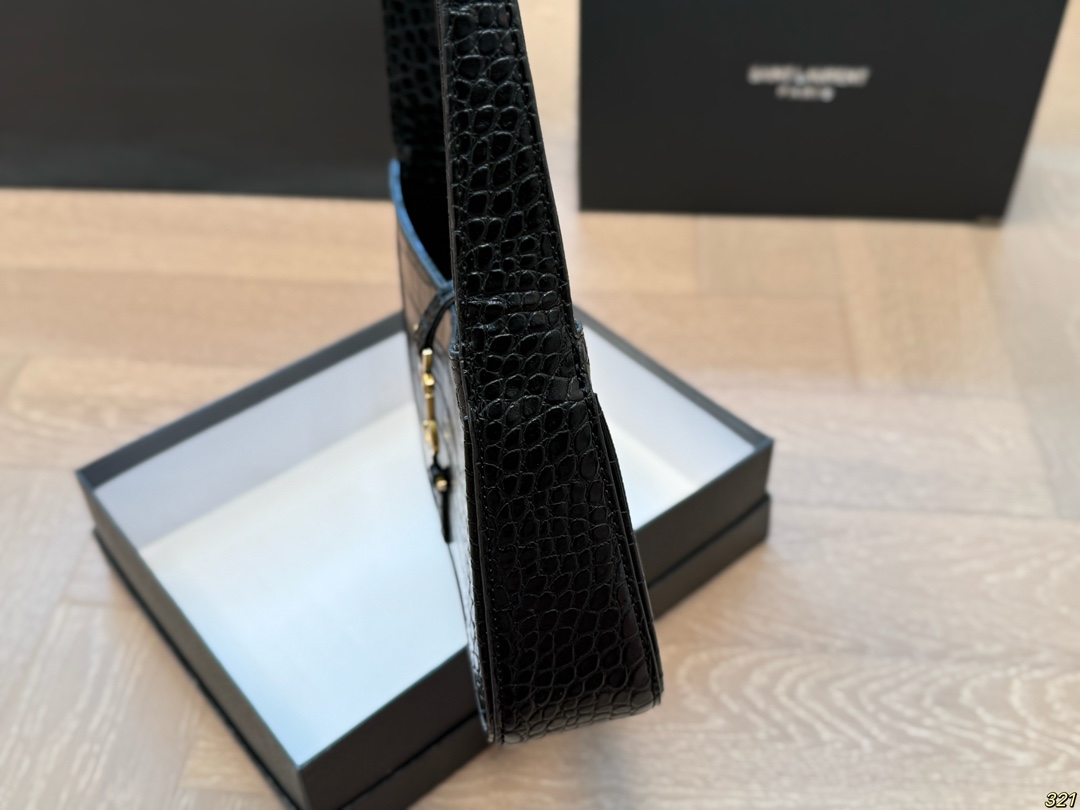 YSL Saint Laurent LE5A7 Crocodile Embossed Leather Underarm Bag. Minimalist design with metal logo clasp. Lightweight, easy to match. Size: 24x13cm.