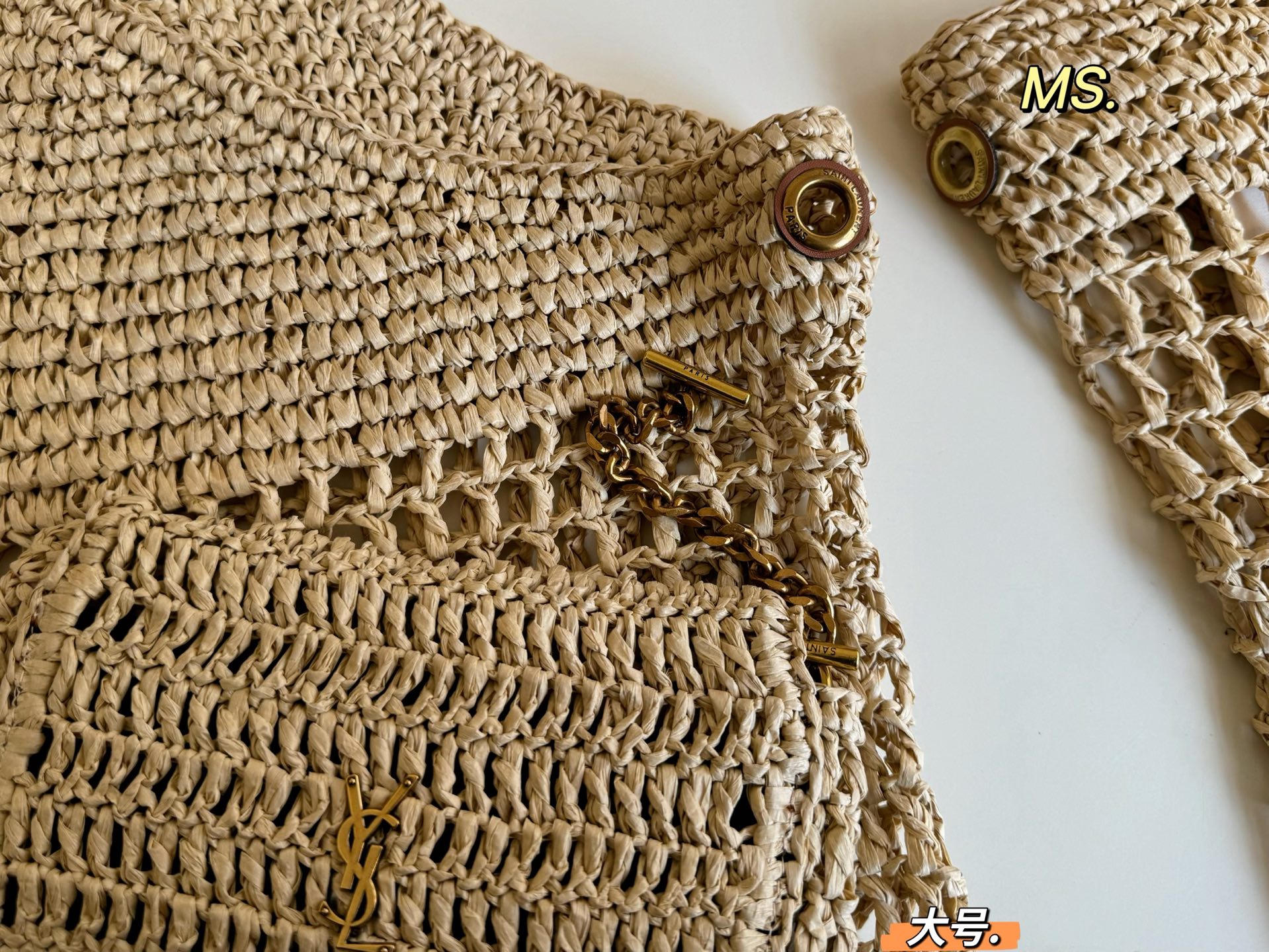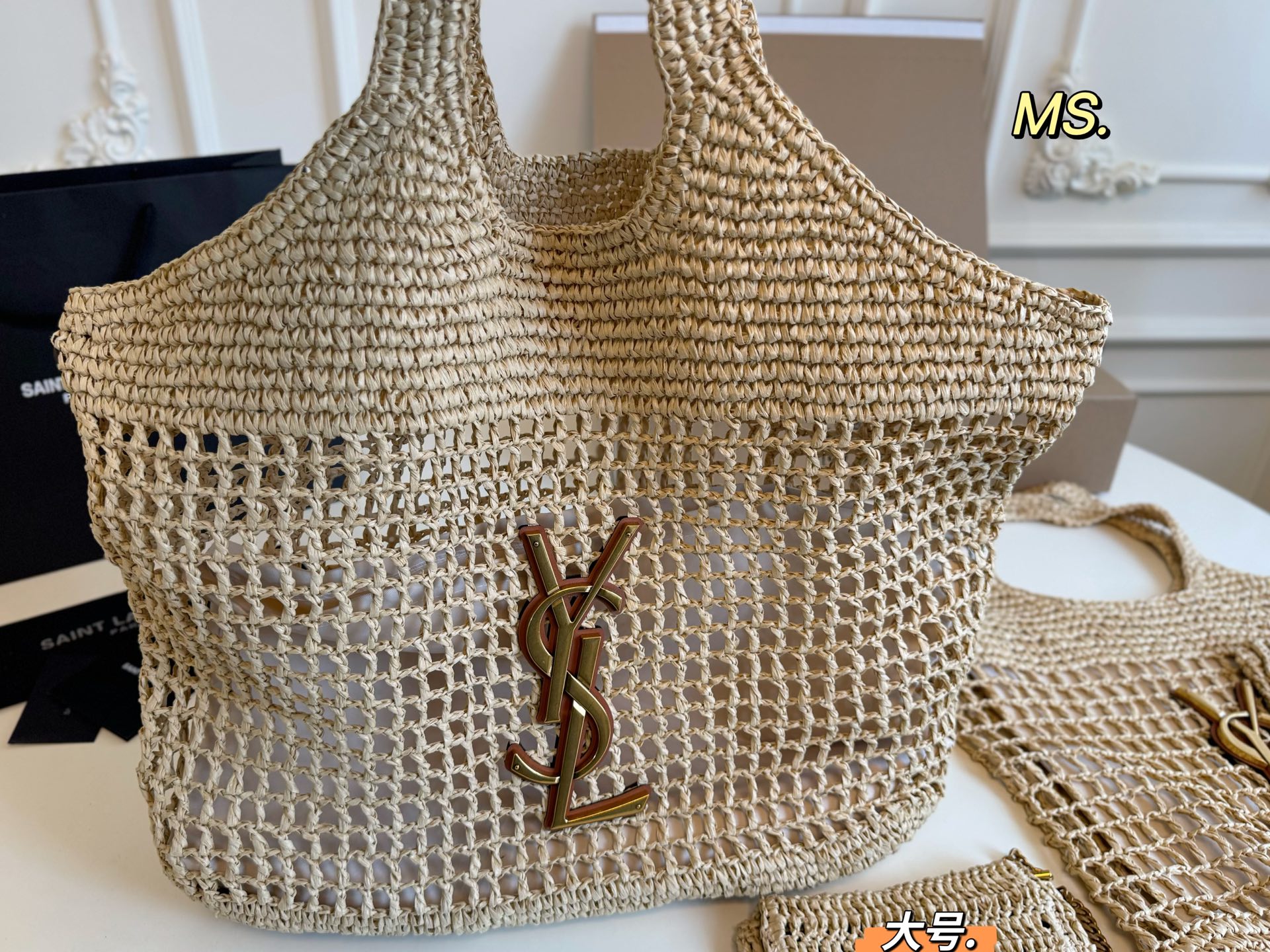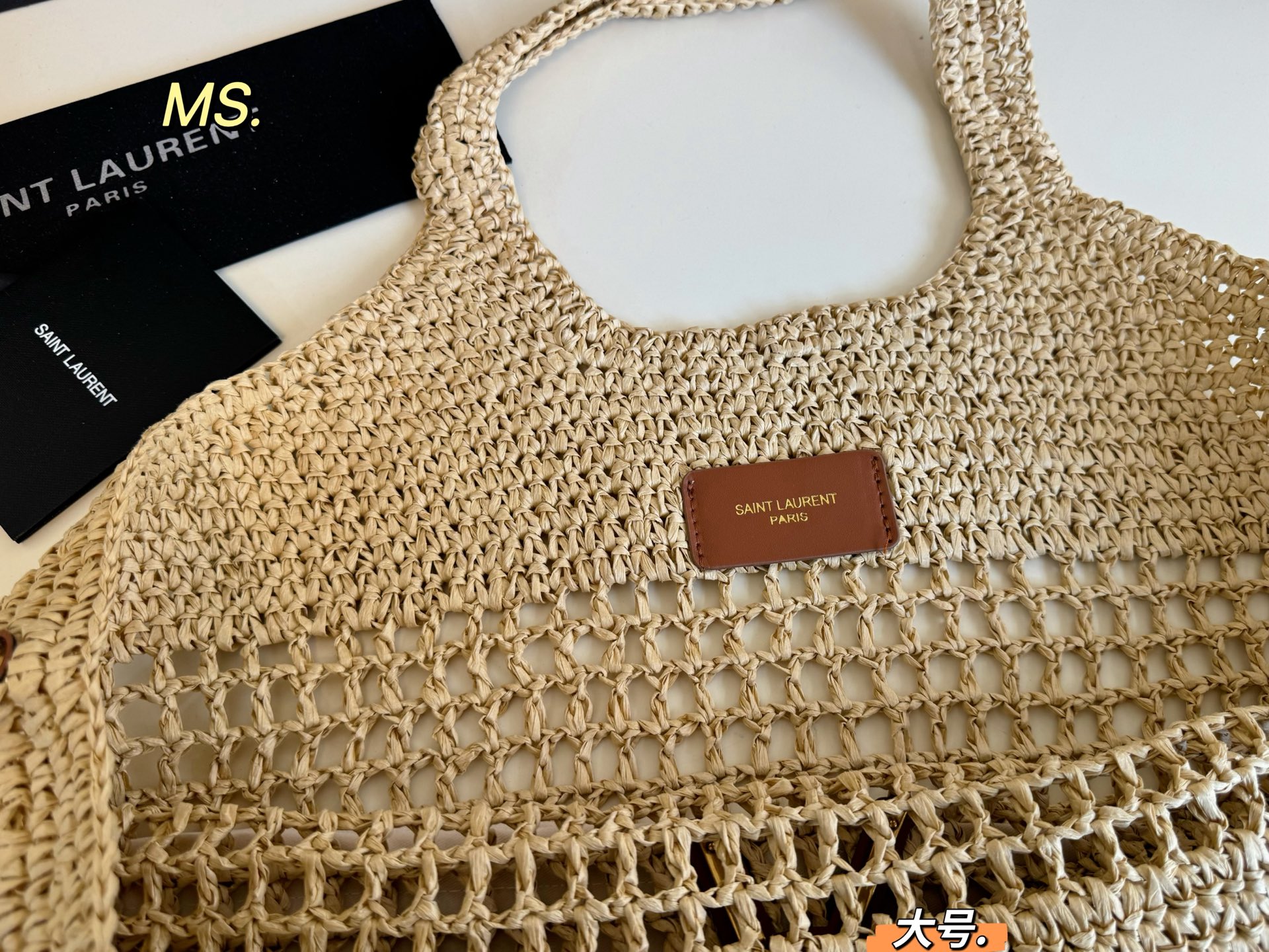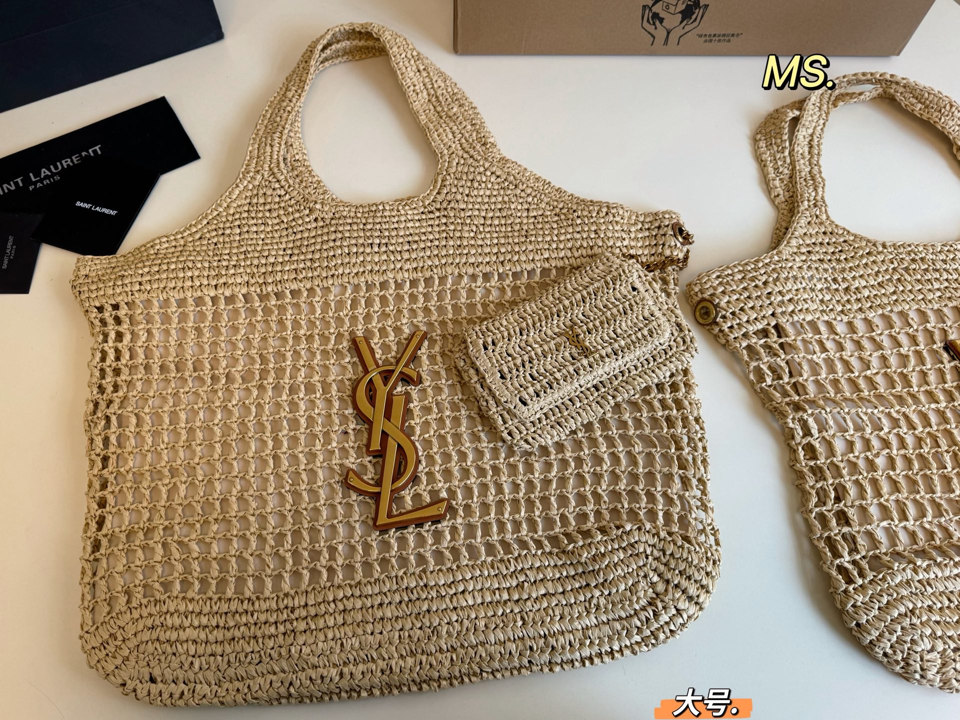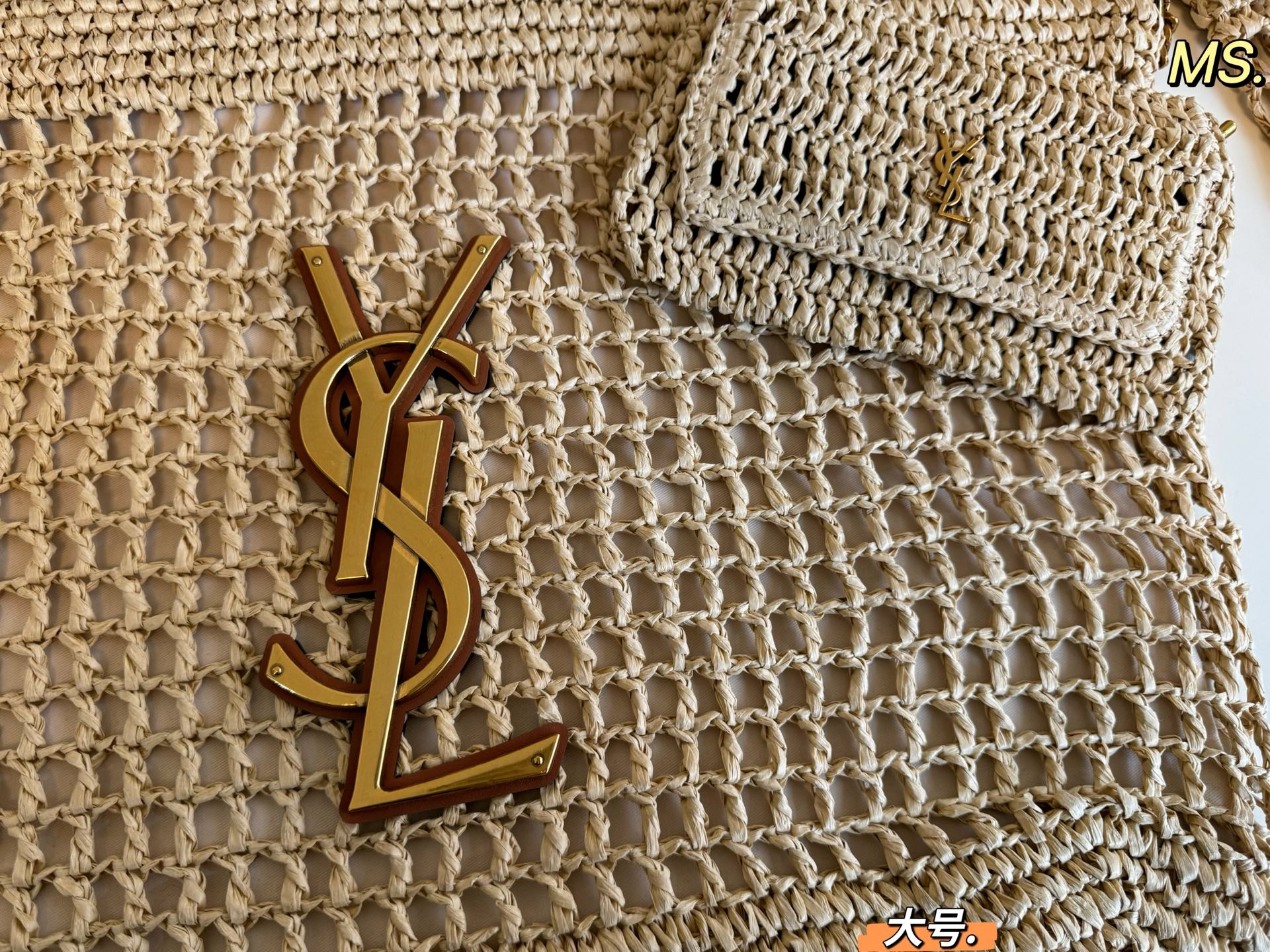 YSL straw tote with pouch. Small: 36x40, Large: 45x45. Lightweight, casual style with large logo.