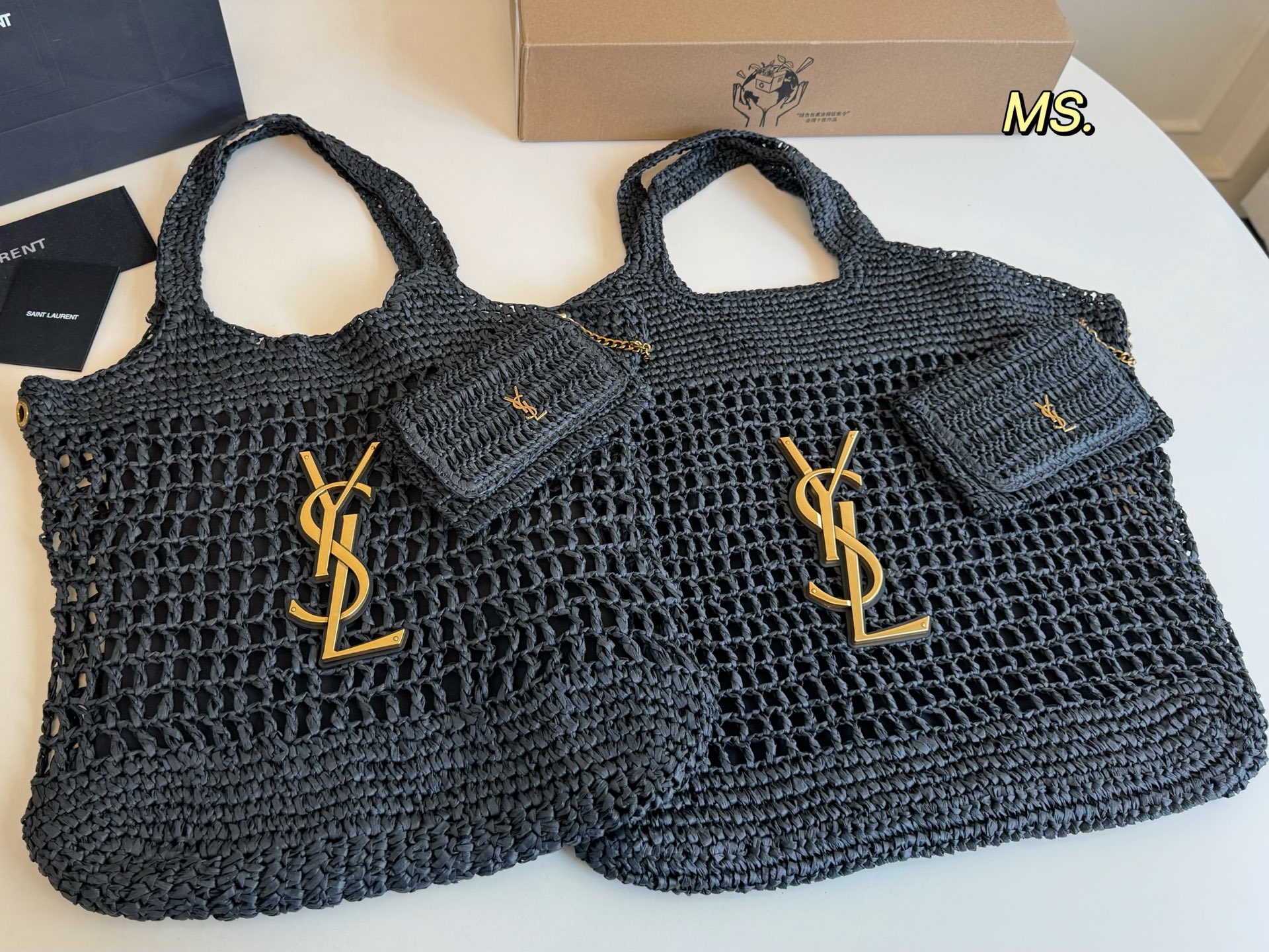 YSL straw tote with pouch. Small: 36x40, Large: 45x45. Spacious, lightweight, casual style.