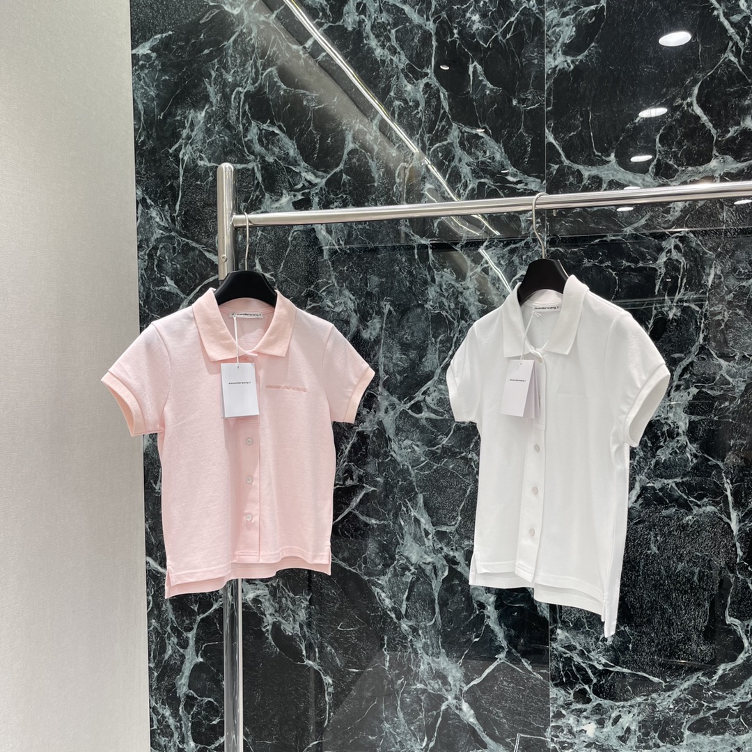 King 2025 summer new lapel short sleeve button-up. Pink/white, SML sizes. Full button front, uneven hem, side slits, chest logo. Fashionable, versatile.