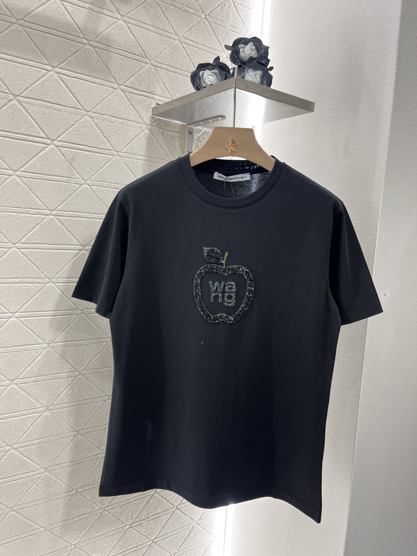 Alexander Wan 2025 new product: round neck rhinestone bead tee. Custom silk cotton material, comfortable and breathable. Regular T-shirt cut, slim fit. Chest 3D rhinestone and sequin apple design with lettering. Two colors available.