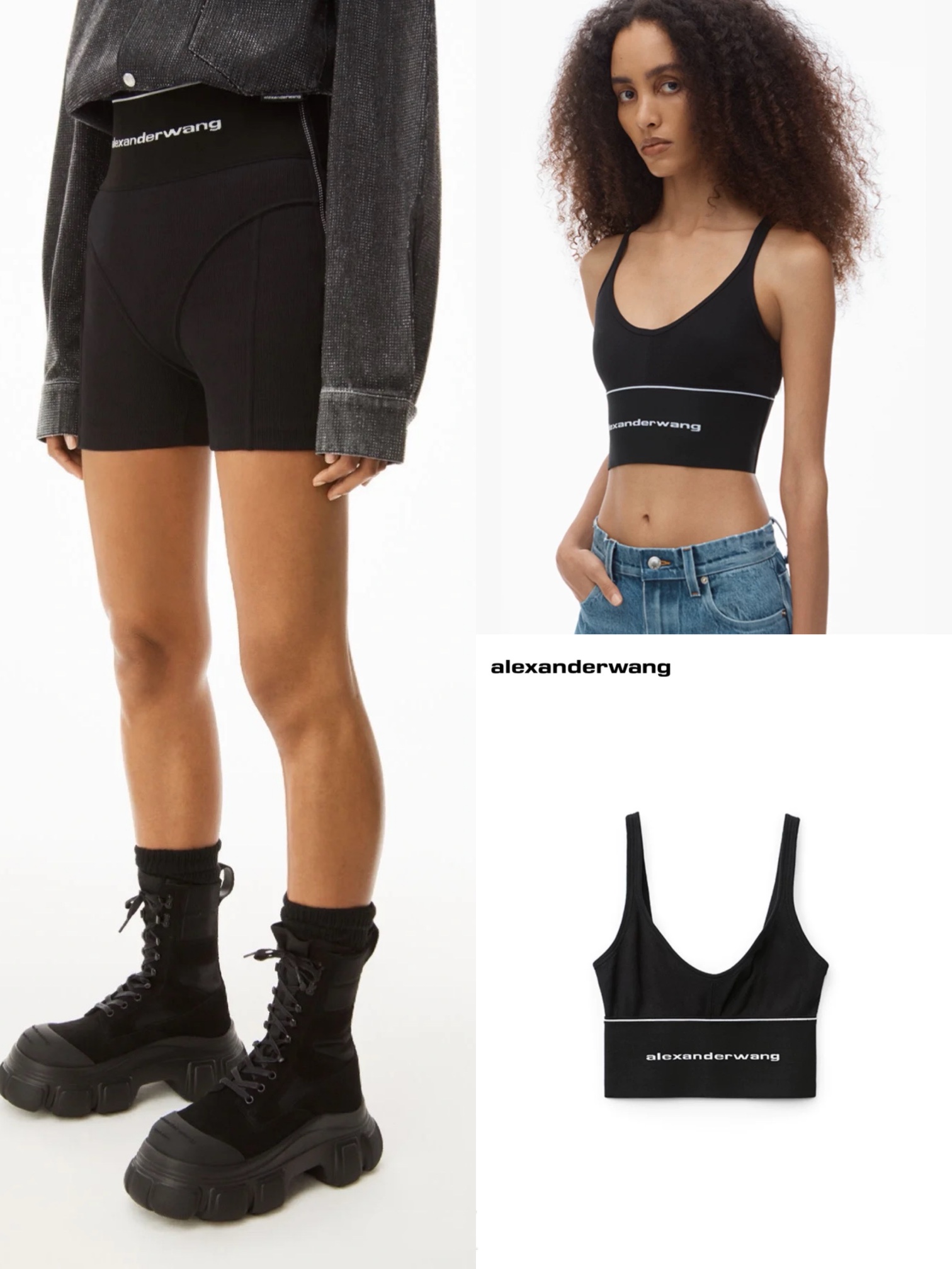 Alexander Wan new fitness yoga set: logo strap U-neck top with padding + wide waistband slim-fit yoga shorts. Black, Sizes S M L XL.