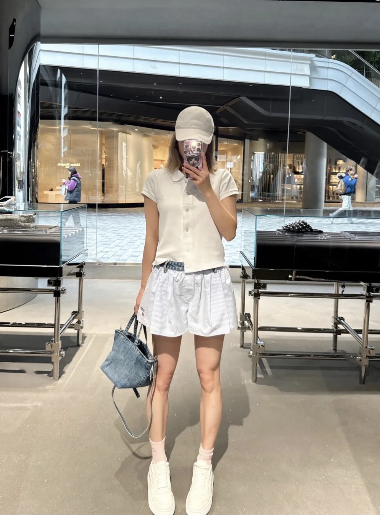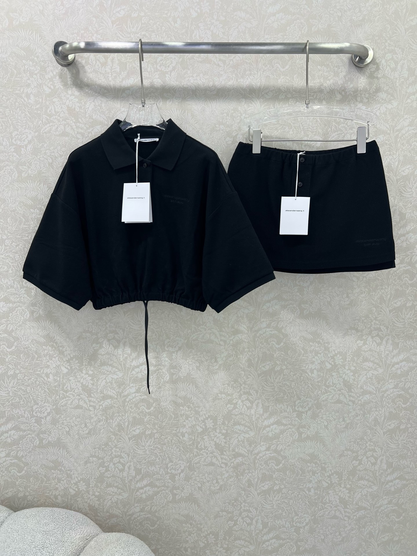 Alexander Wang new 25 sports casual set, flip-collar short sleeve with drawstring waist, matching elastic waist skirt. Minimalist French elegance, versatile and slimming. Three colors, sizes S M L.