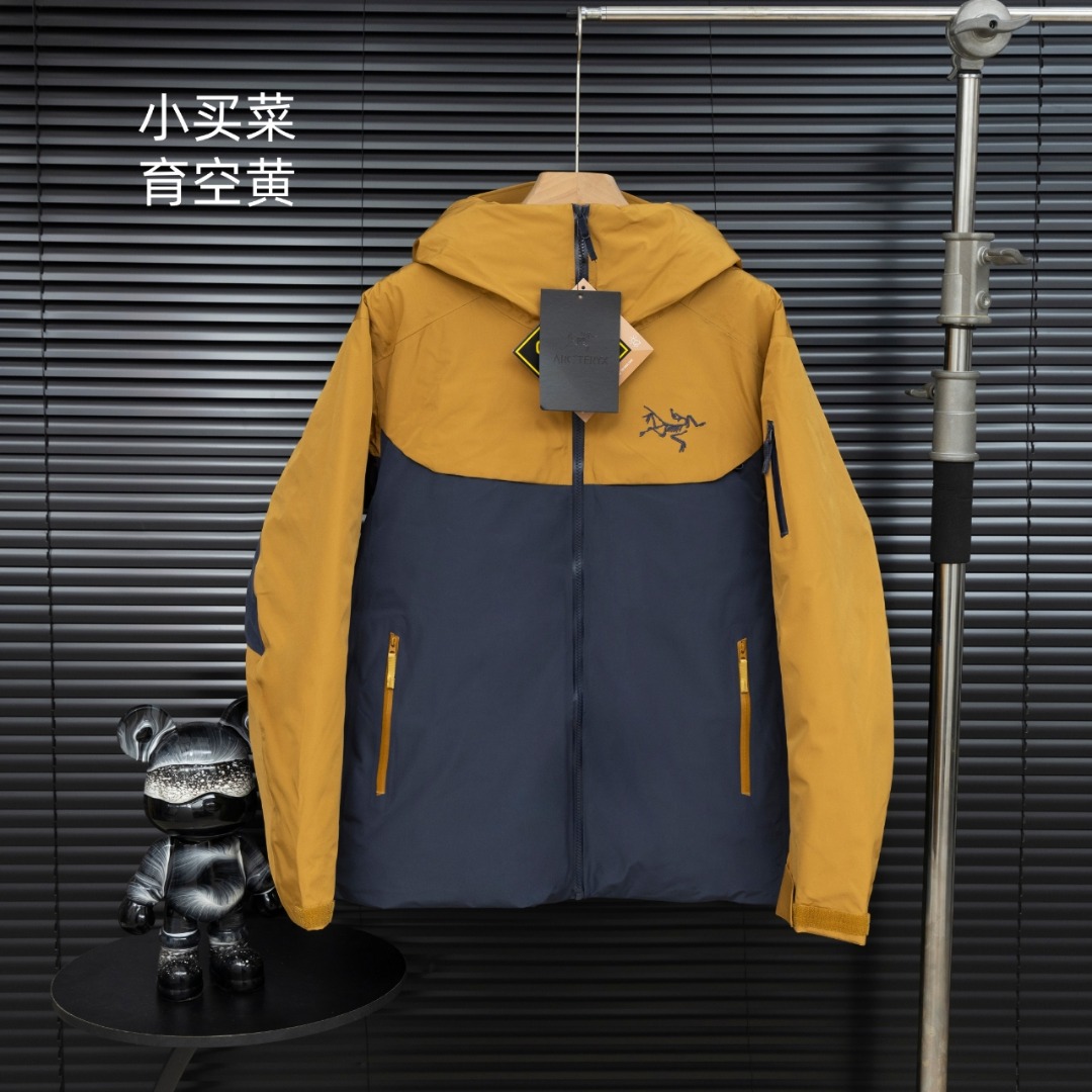 Top quality ARC'TERYX Macai LT winter hooded down jacket. Lightweight, windproof, waterproof, breathable. Features seamless sealing, 3D logo, GORE-TEX. Colors: Black, Gray, Yukon Yellow. Sizes: S-XXL.