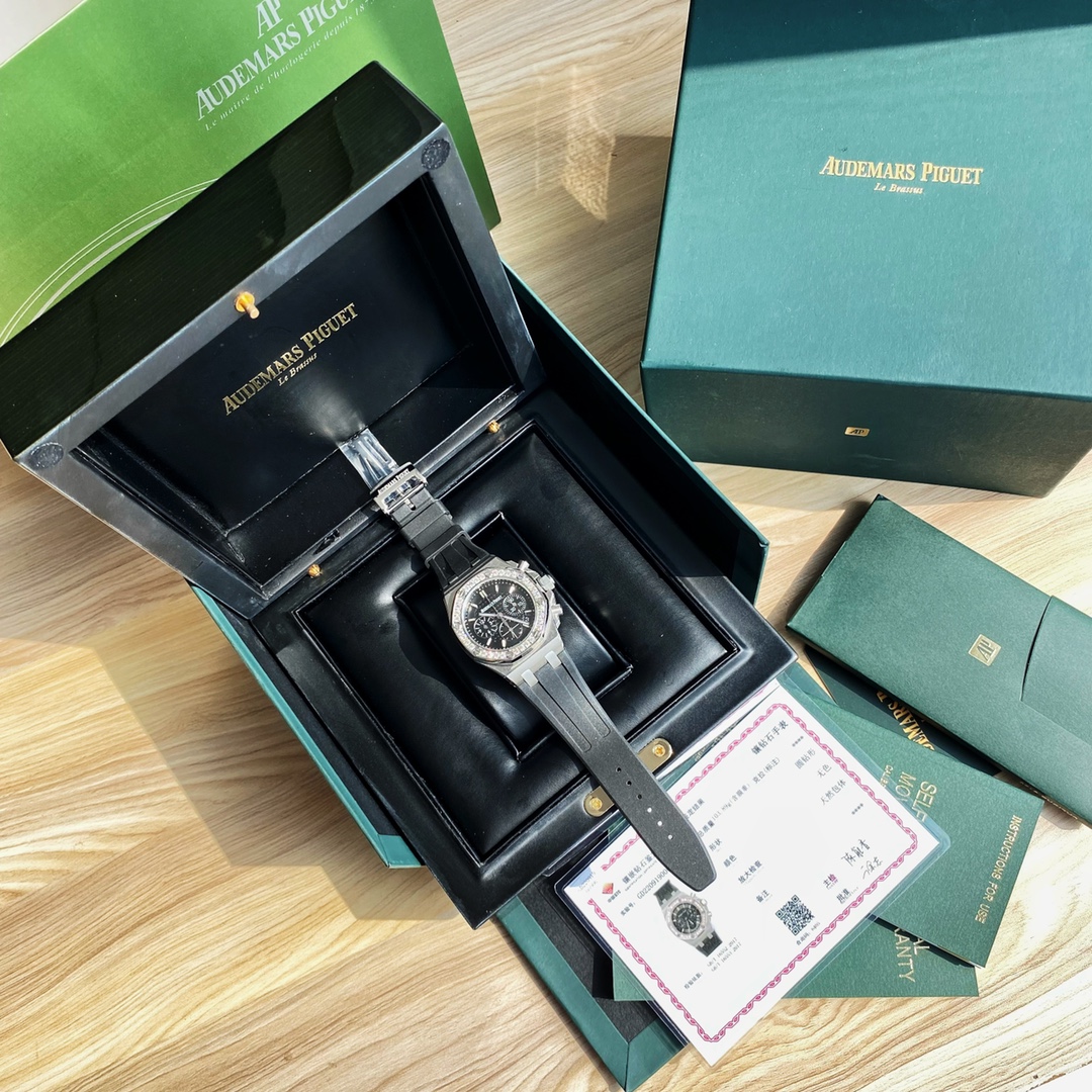 Matching Box - Popular AP Royal Oak Series. Stainless steel case with diamond bezel, Japanese multifunctional quartz movement, scratch-resistant sapphire crystal, food-grade safe rubber strap, versatile 37mm size. High-quality version from MF Factory.