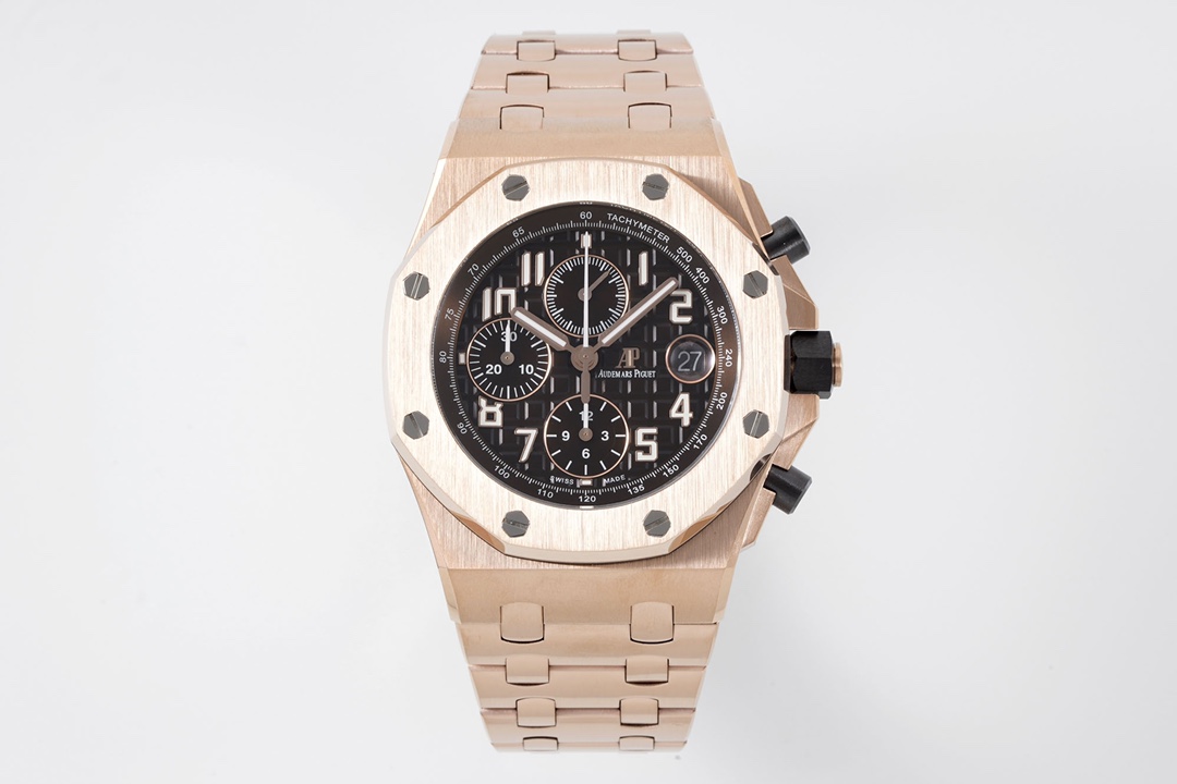Upgraded AP Royal Oak Offshore 26470 42mm watch. Features ceramic case, CNC finishing, flawless screws, grid dial, sapphire crystal, rubber strap, and replica 3126 movement. Perfectly replicates original functions.
