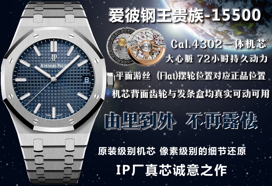 IP.Factory Audemars Piguet 15500 with integrated 4302 movement. 41mm steel case, refined bracelet, textured dial. 72-hour power reserve. Closest to genuine.