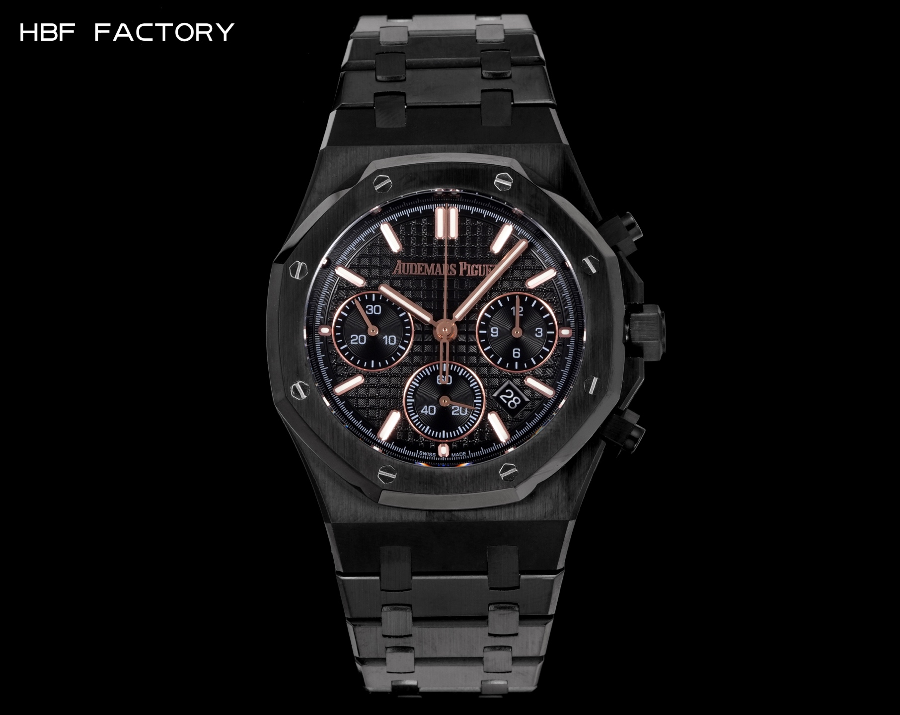 HBF Factory Audemars Piguet Royal Oak 26240ST watch. 41mm case with 7750 chronograph movement. Upgraded polished inner bezel for立体 dial. 316L steel, luminous, 13.8mm thickness.