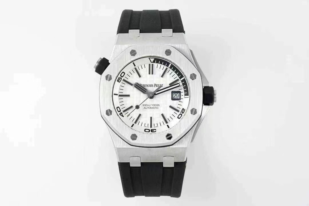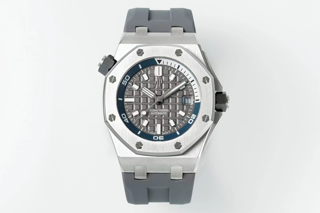 Upgraded AP Royal Oak Offshore 15720 dive watch with quick-release strap and clasp. 42mm steel case, scratchproof crystal, black ceramic crown. Customized movement, luminous dial, imported rubber strap. Includes transparent case.