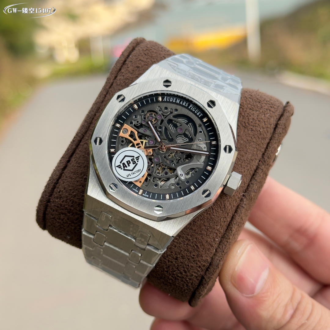New APS Audemars Piguet Royal Oak Offshore 15407ST, 41mm, skeleton gray dial with rose gold indices, sapphire crystal, steel case, transparent case back.