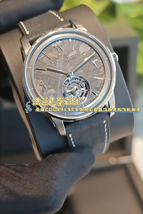 New AP Code 11.59 flying tourbillon with meteorite dial, skeletonized movement, and custom Arabic indexes. Features a dual-color case and curved crystal for unique visuals.