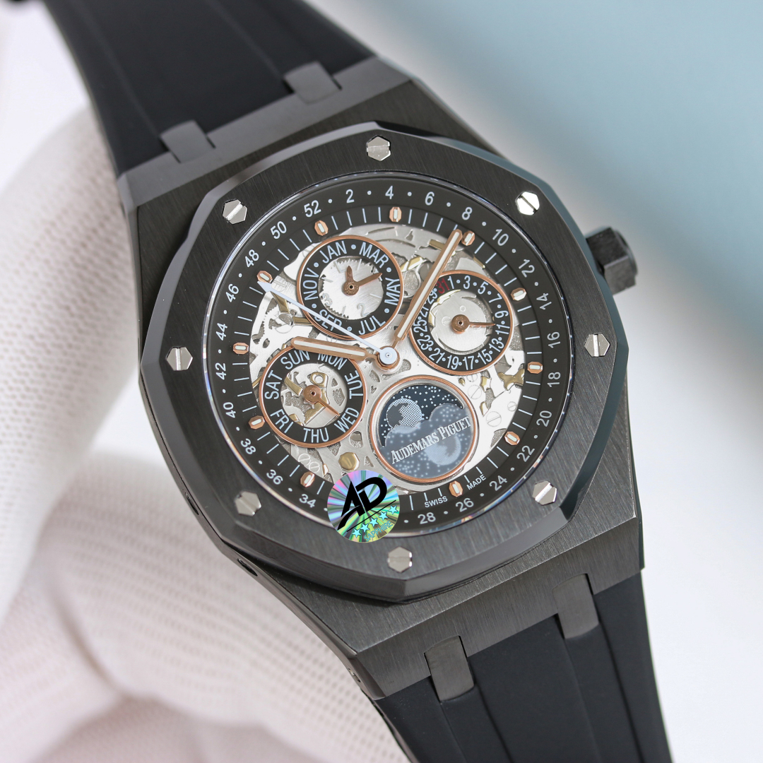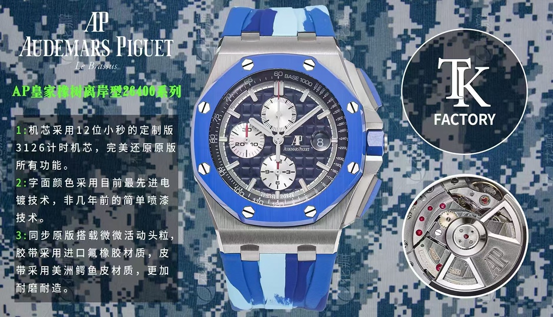 TK Factory launches Royal Oak Offshore 26400 series! Top-tier replica AP chronograph watches with comprehensive styles and superior craftsmanship. Custom 3126 movement with small seconds at 12 o'clock, fully functional and finely polished for enhanced stability. Carbon fiber models use new Carbon TPT® B.4 composite material for lightweight yet impact-resistant construction. Dials feature advanced electroplating and CNC-finished chocolate grid pattern. Includes flexible end links, imported fluoroelastomer straps, or alligator leather straps.