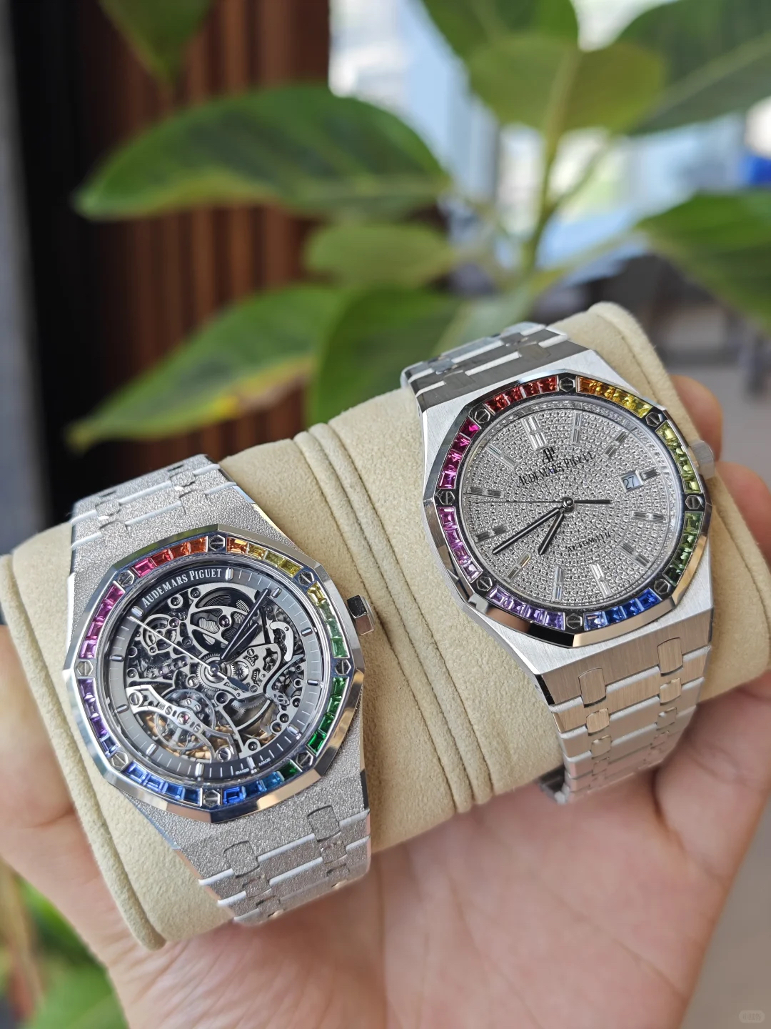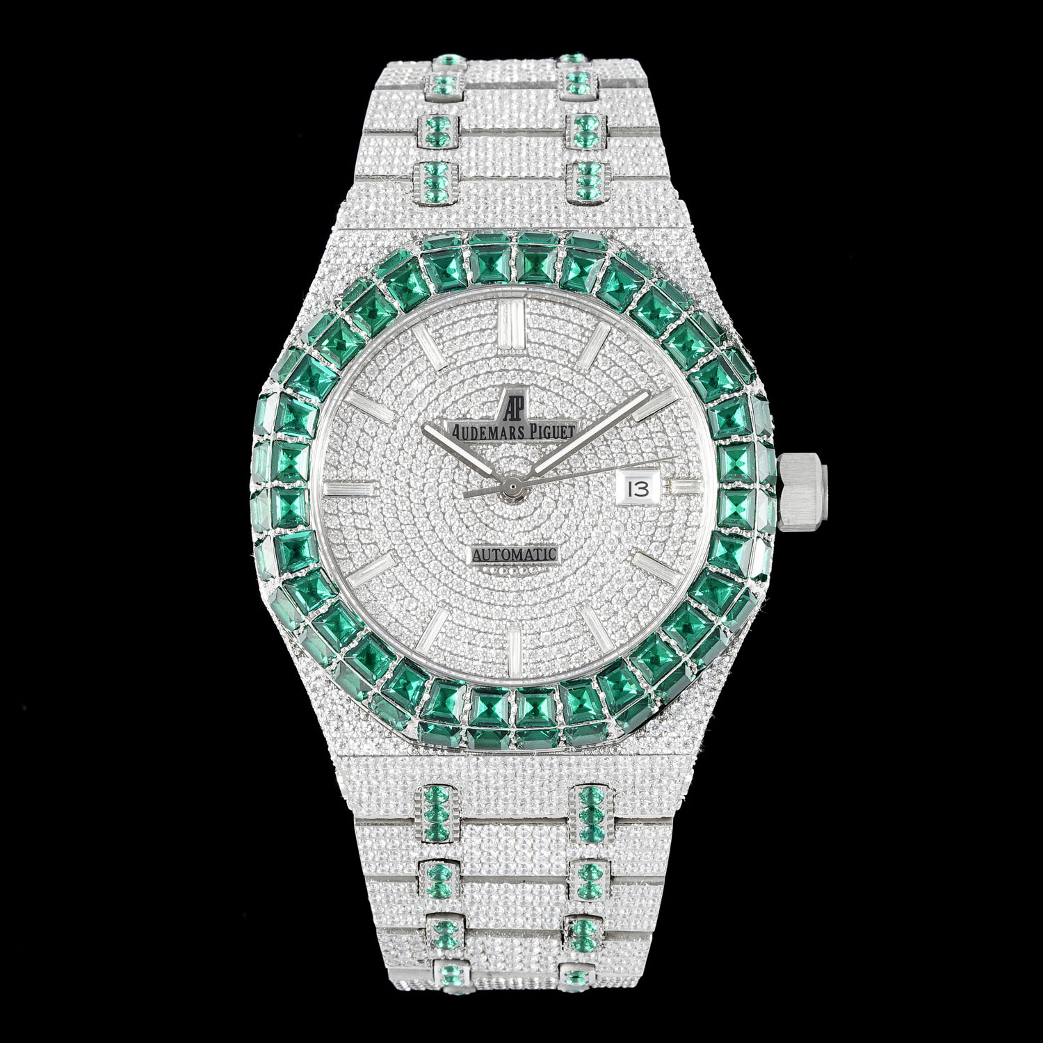 AP Audemars Piguet diamond bezels and bracelets available in white and green. Men's automatic mechanical watch with stainless steel case, Swarovski crystals, and precise movement. Classic, timeless design.