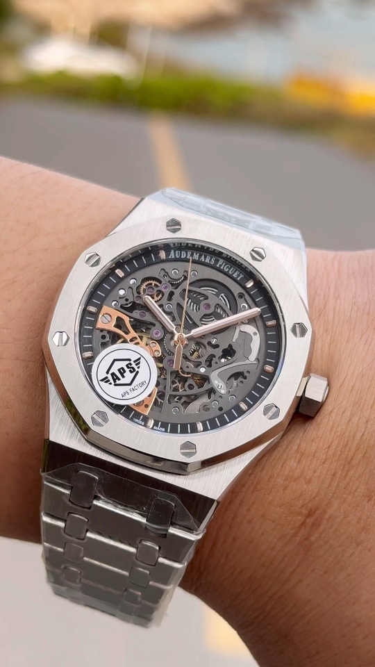 New APS Audemars Piguet Royal Oak Offshore 15407ST men's mechanical watch, 41mm, skeleton dial, rose gold indexes, sapphire crystal, steel case, transparent case back.