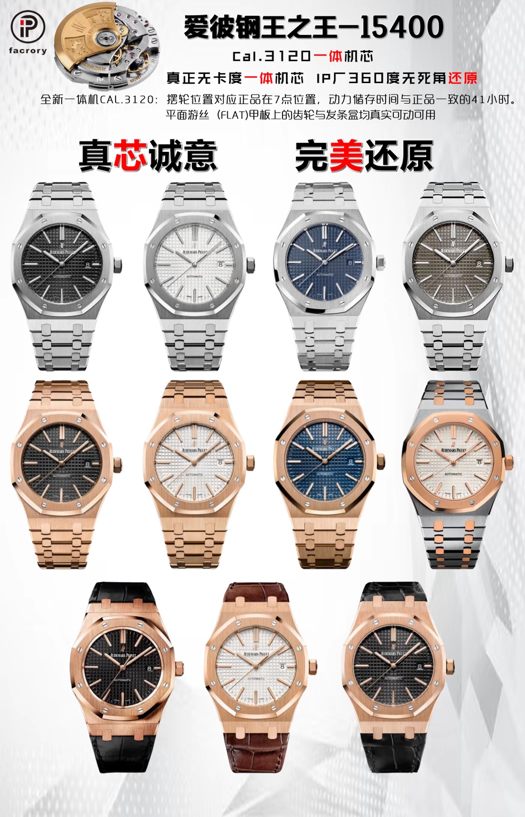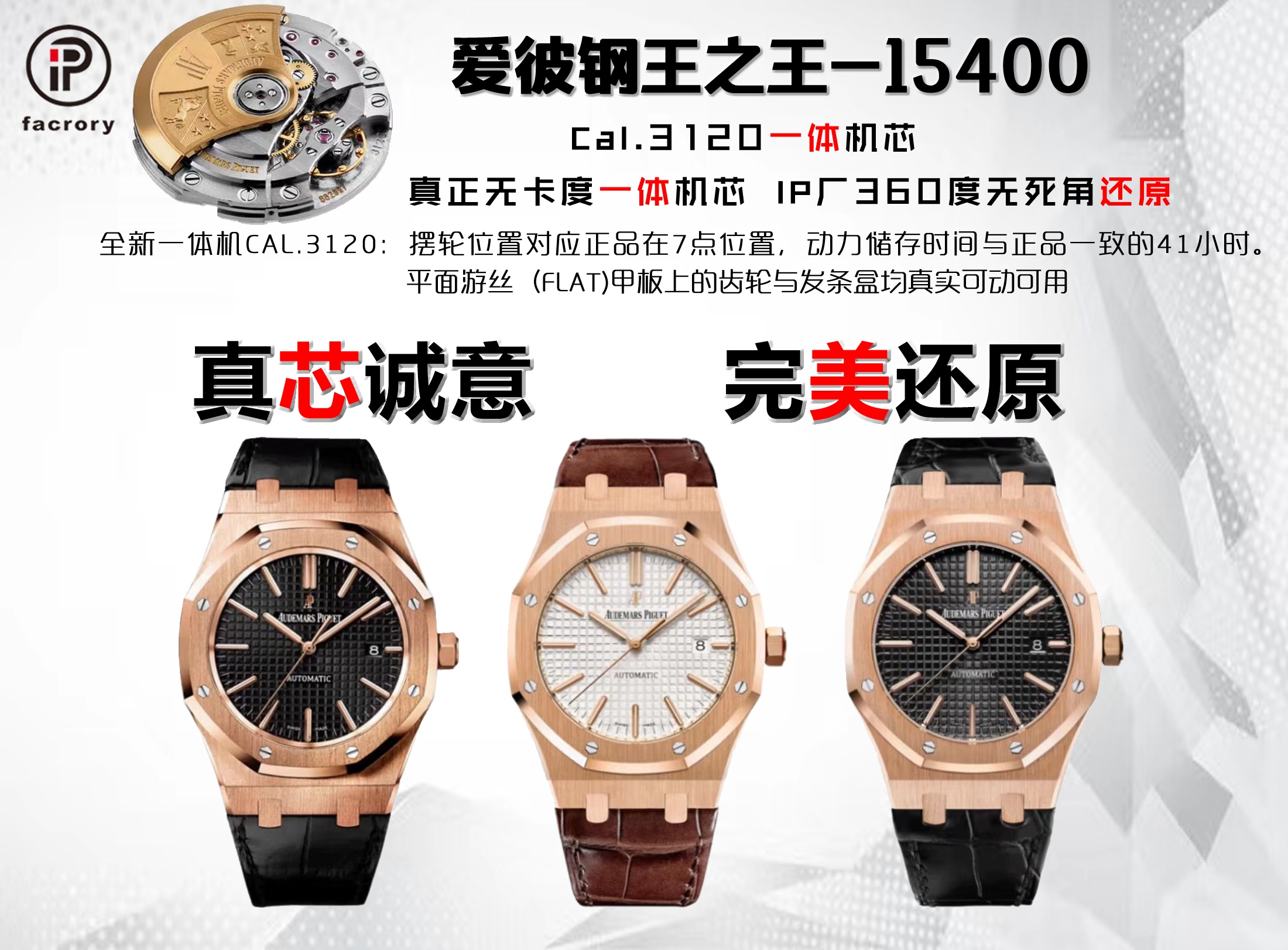 IP.Factory Audemars Piguet 15400 features genuine CAL3120 movement, 1:1 case and bracelet structure, refined details, and authentic reverse jump date function.