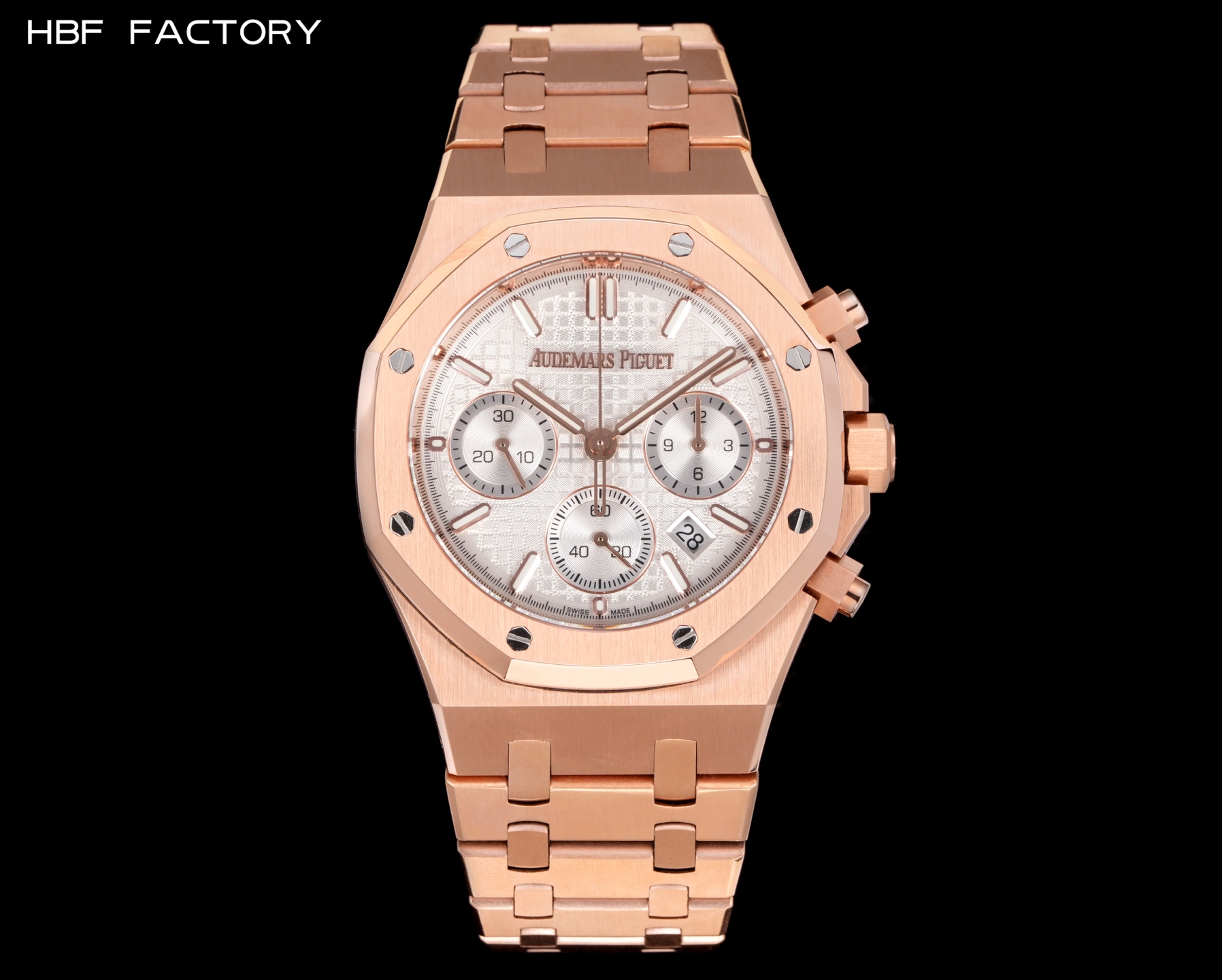 HBF Factory Audemars Piguet Royal Oak 26240ST watch. 41mm case with 7750 chronograph movement. Upgraded polished inner ring and luminous dial. High-quality replica.