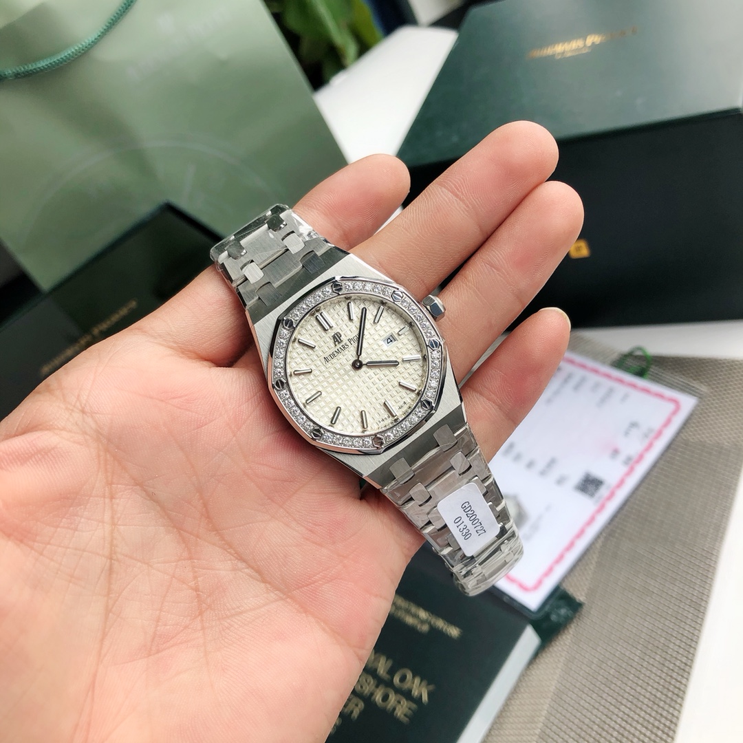 Complete packaging. Audemars Piguet Royal Oak ladies watch arrived. Model 67651ST.ZZ.1261ST.01. 33mm case, diamond bezel, quartz movement, date function. Limited stock.