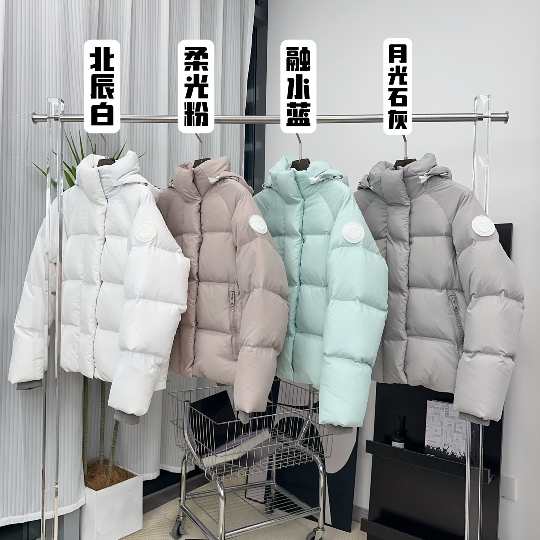 Guangzhou high-version CANADA GOOSE capsule series parka in pastel colors. Filled with 80% white duck down. Features durable CORDURA fabric, removable hood with down filling, custom YKK zippers, and multiple pockets. Color options: white, blue, pink, gray.