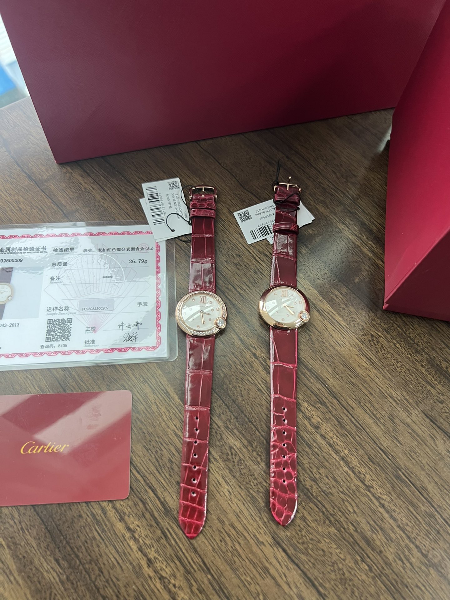 Cartier White Balloon Chinese New Year Edition. BALLON BLANC series, 30mm. Gold-plated, GTC certified. Swiss quartz, red crocodile strap. Elegant design with diamond.