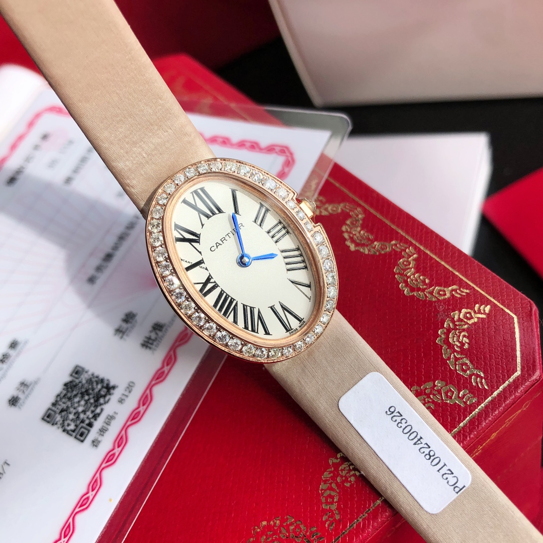 New 33mm quartz watch with alligator strap, Swiss movement. Features Cartier's classic designs like Santos, Tank, and popular Ballon Bleu. Ultra-thin, elegant timepiece.