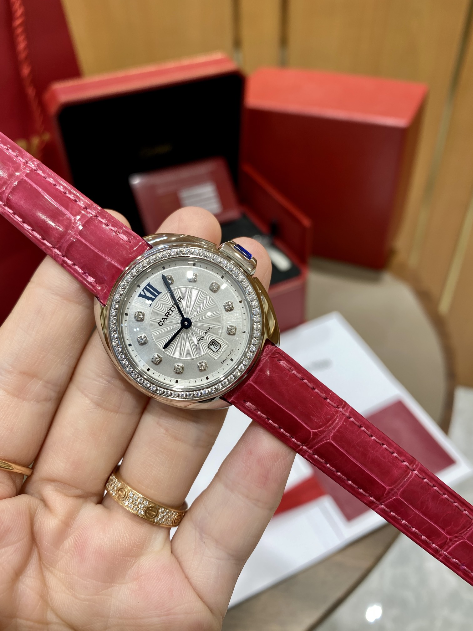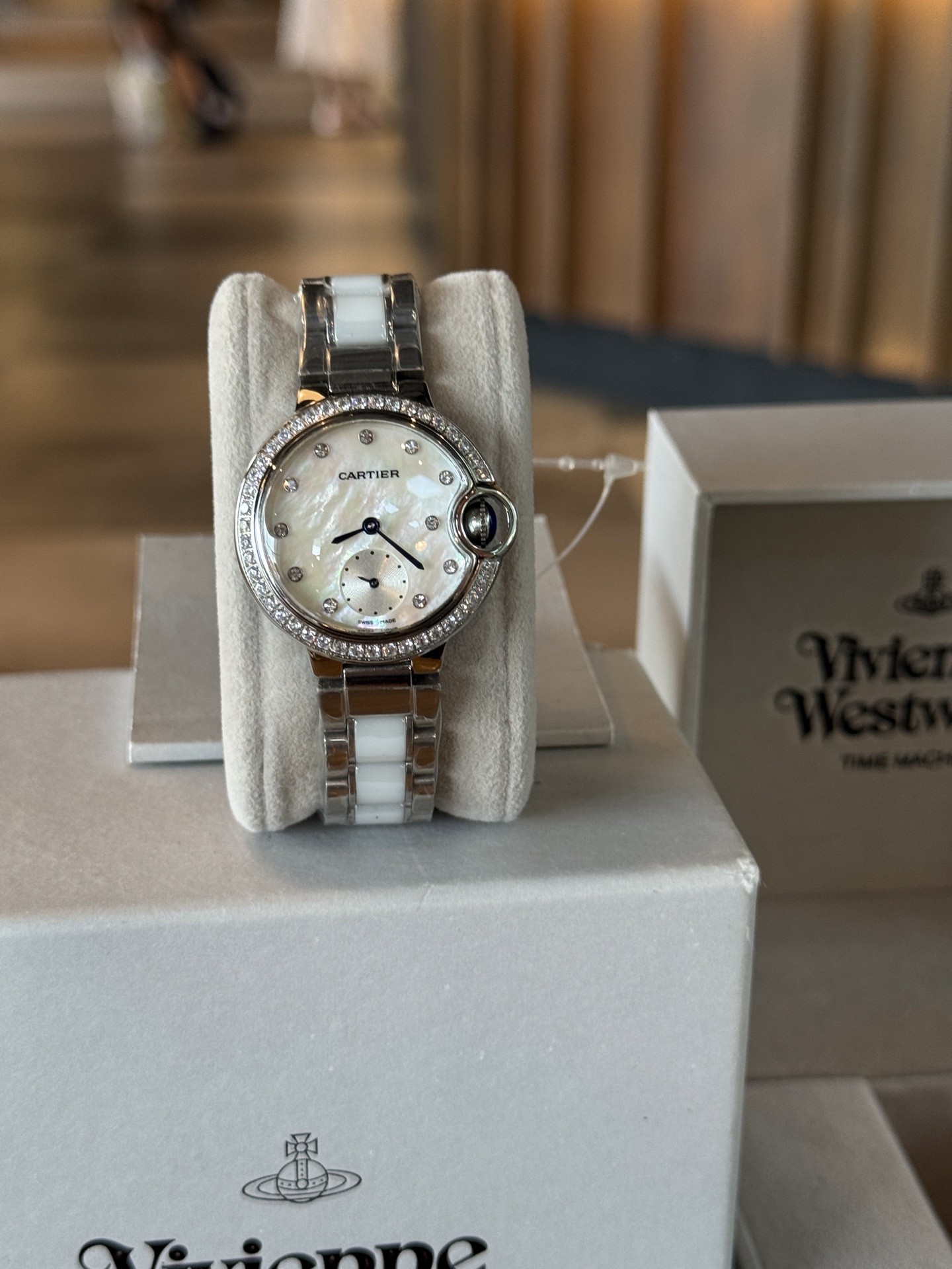 New 28-diamond watch! Cartier diamond blue balloon from Europe. Quartz movement, 28mm dial, 42 VS1.2 diamonds. Comes with authentic certificate. Great gift!