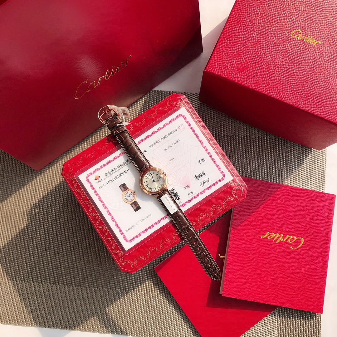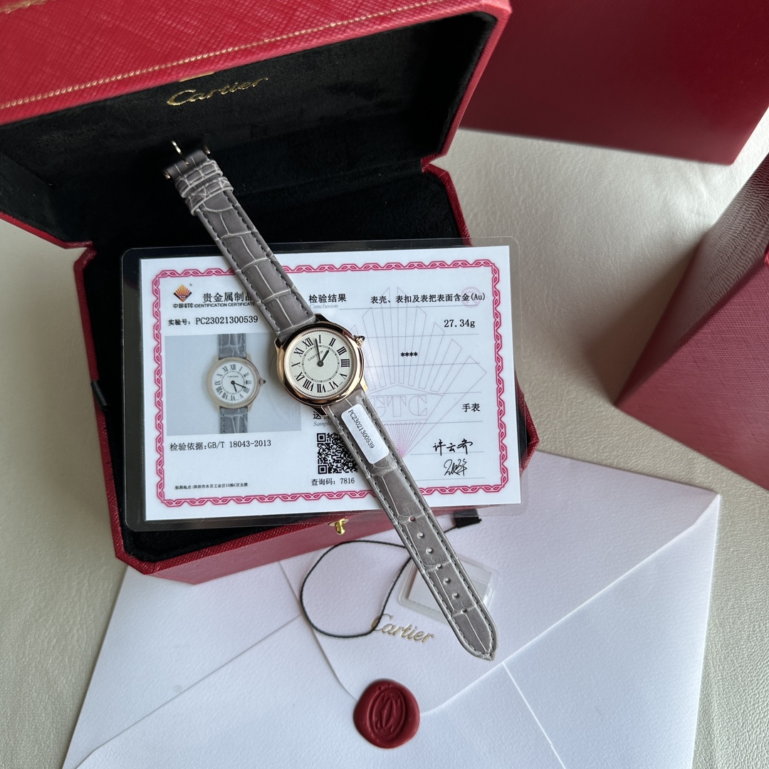 Genuine Cartier 18k gold plated watch with GTC certification. Swiss quartz movement, Roman numeral dial, blue steel hands, and alligator leather strap. Case diameter: 29mm, thickness: 7.54mm.